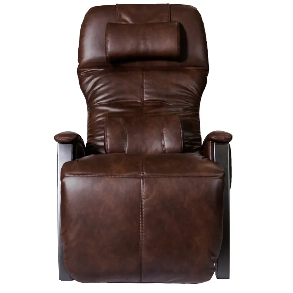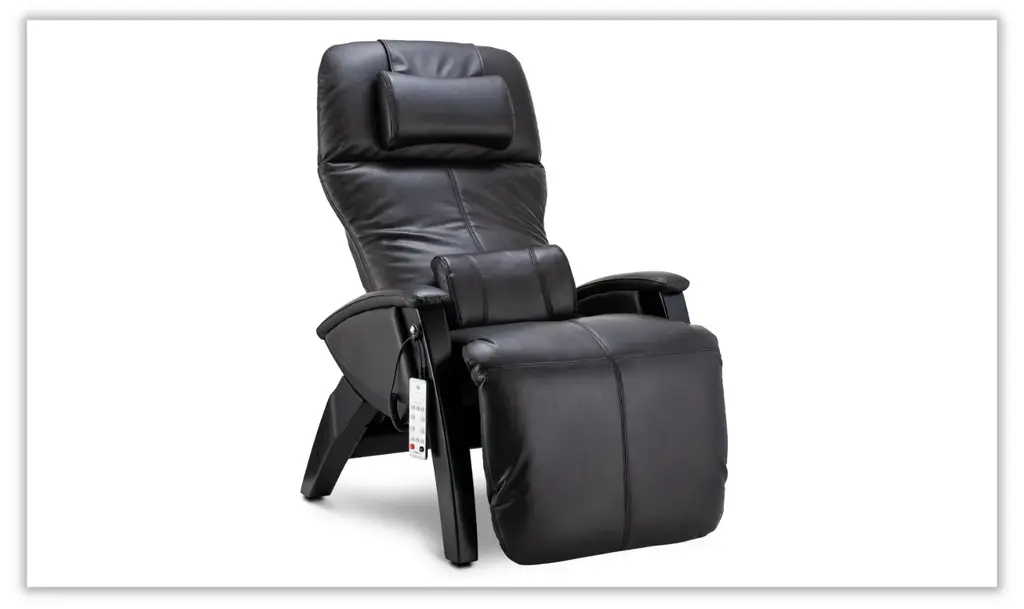 The classic ZGR offers quality, comfort, and style. Hand-stitched vegan synthetic hyde, hand-carved, hand-stained solid wood base, vibration massage and heat all deepen the restorative zero gravity experience. The ZGR can be used as a traditional recliner, but its magic is in the Zero-Gravity position, where it helps your body literally decompress from the stress that gravity puts on you every day. Gravity keeps us grounded, but it also weighs us down, compressing discs, tensing up other muscles that have to compensate, and it takes time to recover. In our Zero Gravity position, gravity isn't pushing you from the top down, so your discs can re-hydrate, and your weight is evenly distributed allowing muscles to relax in a way that no masseuse, chiropractor, acupuncturist, or pilates could ever accomplish. DEFY GRAVITY WITH THE ZGR The ZGR can be used as a traditional recliner, but its magic is in the Zero-Gravity position, where it helps your body literally decompress from the stress that gravity puts on you every day. Gravity keeps us grounded, but it also weighs us down, compressing discs, tensing up other muscles that have to compensate, and it takes time to recover. In our Zero Gravity position, gravity isn't pushing you from the top down, so your discs can rehydrate, and your weight is evenly distributed allowing muscles to relax in a way that no masseuse, chiropractor, acupuncturist, or pilates could ever accomplish. Top Down CustomizationThe ZGR's manually adjustable neck pillow offers the supportive benefits of memory foam for your head and neck, which can often carry a lot of tension. Having full support from your pillow makes a big difference! The ZGR also comes with a manually adjustable lumbar pillow and remote-controlled footrests. You are able to adjust the angle of the footrest to the exact position that feels best. This is especially helpful for shorter or taller users. Take A Load OffWith the touch of a button you can go from upright or semi-reclined to Zero Gravity position and relieve yourself of the weight of gravity. In Zero Gravity position your weight is evenly distributed and fully supported. This position is completely unique in it's ability to neutralize gravity and allow healing, repair, and prevent aging.I Didn't Know You Were Vegan!The ZGR is appointed in super-soft, "vegan" synthetic hyde. Easy to care for and a sustainable, earth-friendly option for those who prefer not to use animal products.You're the BossYou are in control of your comfort with our easy-to-navigate, full-featured, hand-held remotes. Just the right size and button spacing to be easy to find, easy to put away, and easy to navigate. And we're pretty sure you'll spend so much time in your Svago that you'll memorize those buttons and not even have to look anyway!You Feel That?Loosen and soothe tense or aching muscles with two vibration massage programs. Add in heat while you're in zero gravity position and feel the trifecta of healing and relaxation.Smart Wake Up ProgramsA side-effect of relieving gravity's weight from your body is total relaxation. The ZGR offers Smart Wake-Up Programs, so you can make sure you don't rest for any longer than you want. Technology Specifications Material and Construction Steel Frame Memory Foam Cushion Layer PU Foam Synthetic Hyde 2 Motors Power and Safety Power Voltage: 120V Rated Frequency: 60Hz Distance from Wall: 16” Power Supply Wiring Length:9" Environmental Temperature: 50°F – 104°F Storage Temperature: 68°F – 140°F