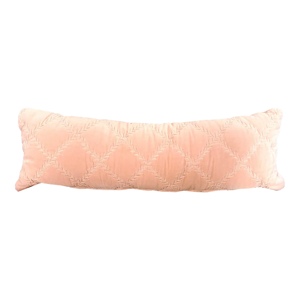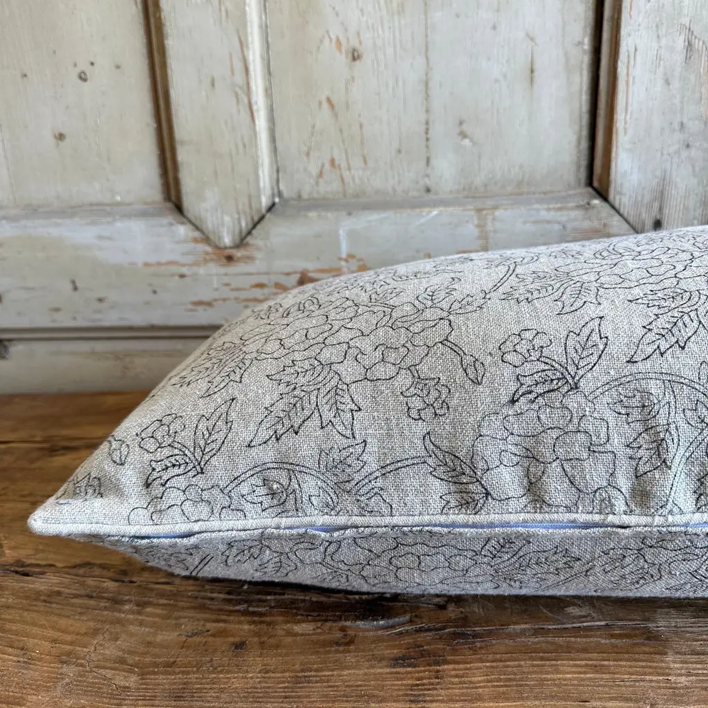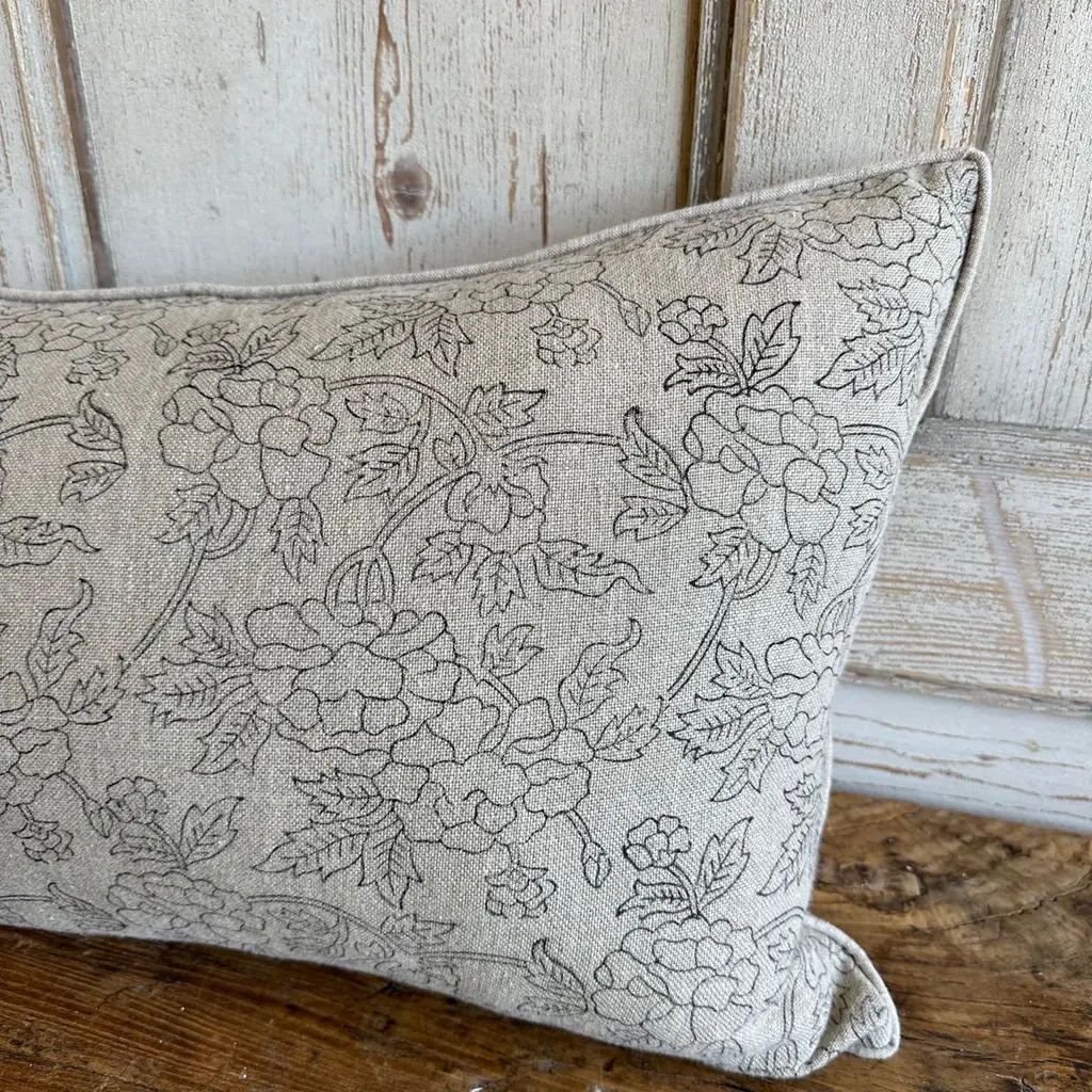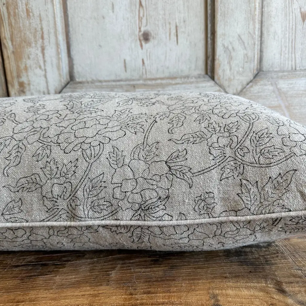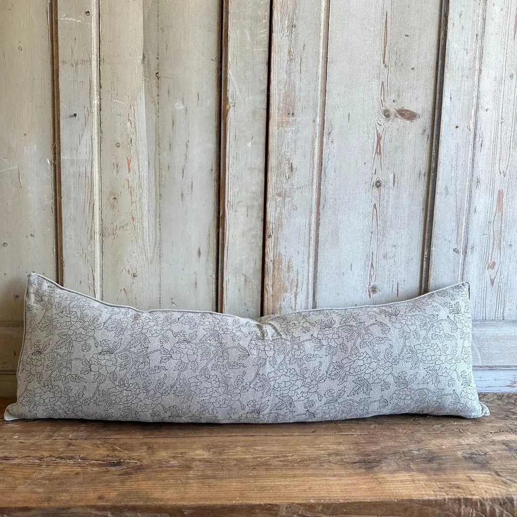 Custom made block printed linen pillow.Natural linen, with a faded thin black stenciled floral pattern.Finished with a welt, and zipper closure.This pillow is double sided, and we do offer this pattern in many different sizes. Also available in our coco brown stencil.Size shown: 16" x 50" x 6"Down Feather insert is included. Custom made for Bloom Home Inc.