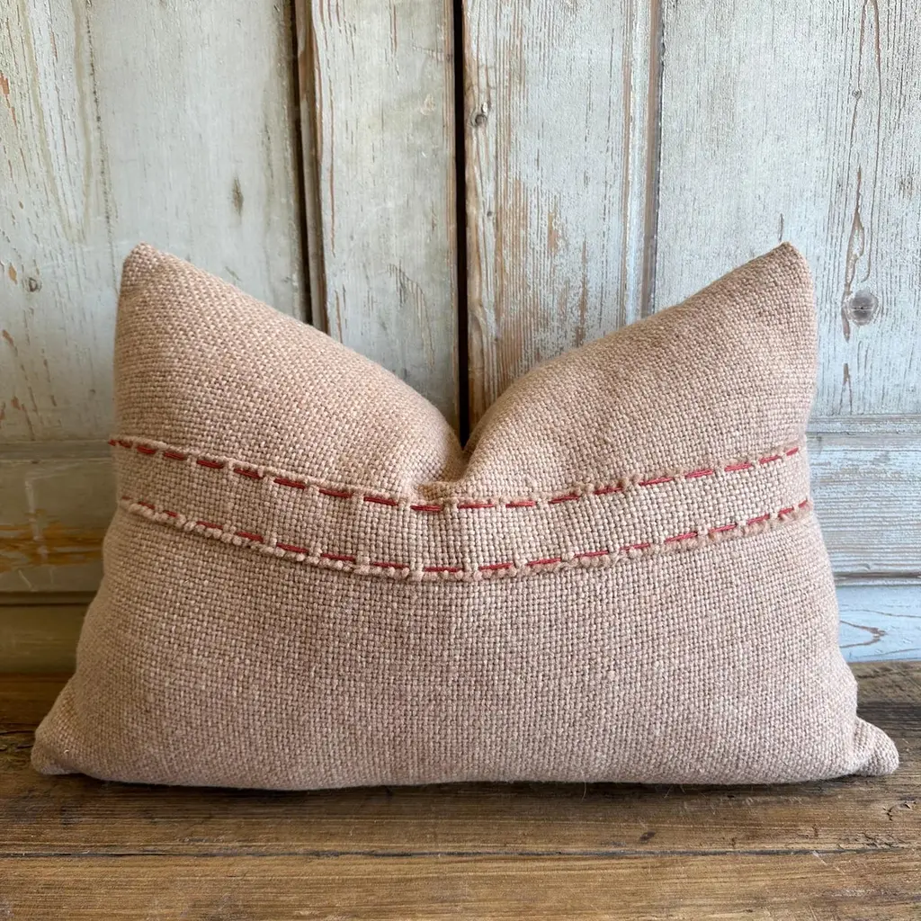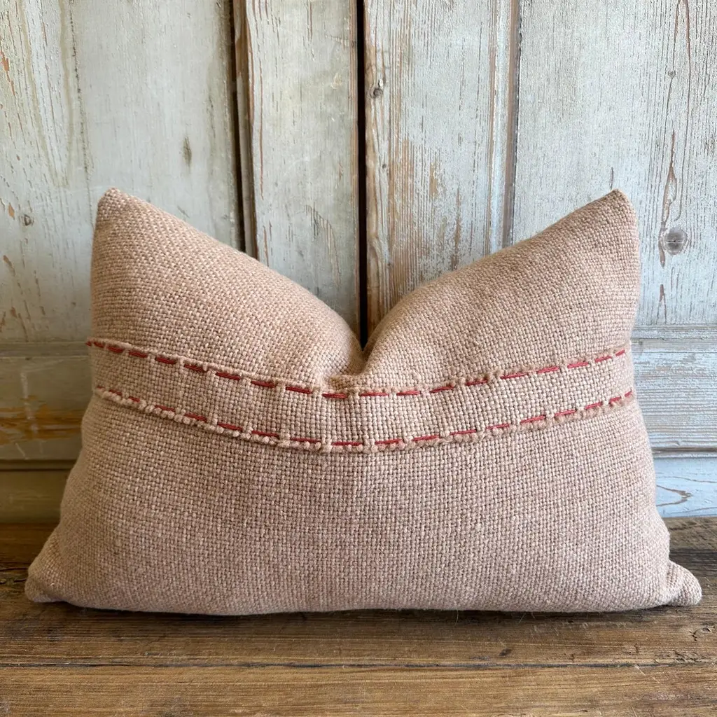 Mirna lumbar pillowcommissioned and handmade by the craftswomen of Chiloé. The textiles are made with 100% wool from ’Chilota’ sheep, that are born and raised on the island.?The process by which these luxurious wool pieces are made starts with shearing the sheep, cleaning the wool in hot water to remove the natural oils of the sheep, drying and spinning the wool into fine threads before hand weaving into unique textile patterns and textures. The textiles we use are colored by natural dyes using leaves, barks, roots, branches or mineral elements. Their main characteristic is their capacity to adapt to difficult weather conditions which makes their wool resistant, flexible and durable. Color: Blush Rose with Dark Pink Stitching. Hidden Zipper Closure. Large wood yarns woven to create a beautiful texture. Dry Clean or spot clean recommended.Size: 15x23, with insert.