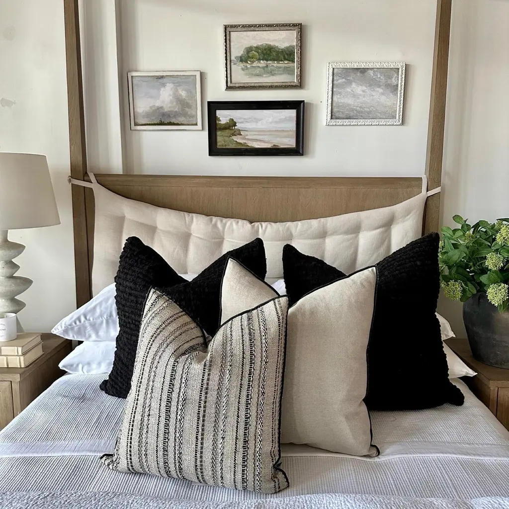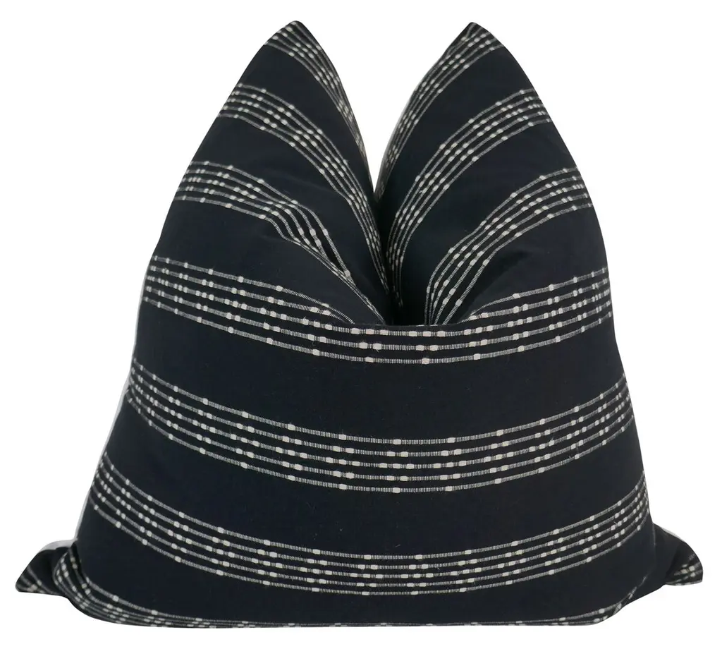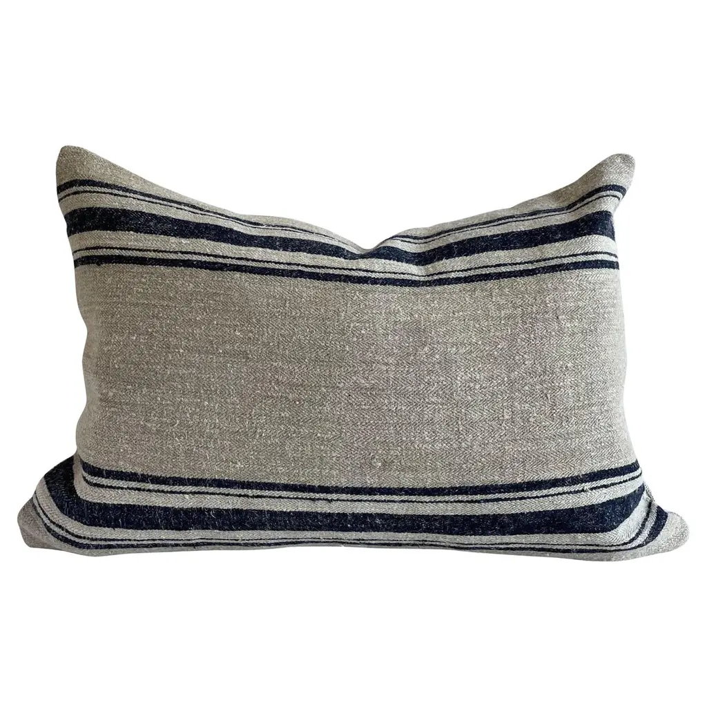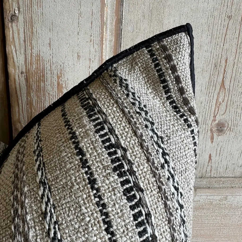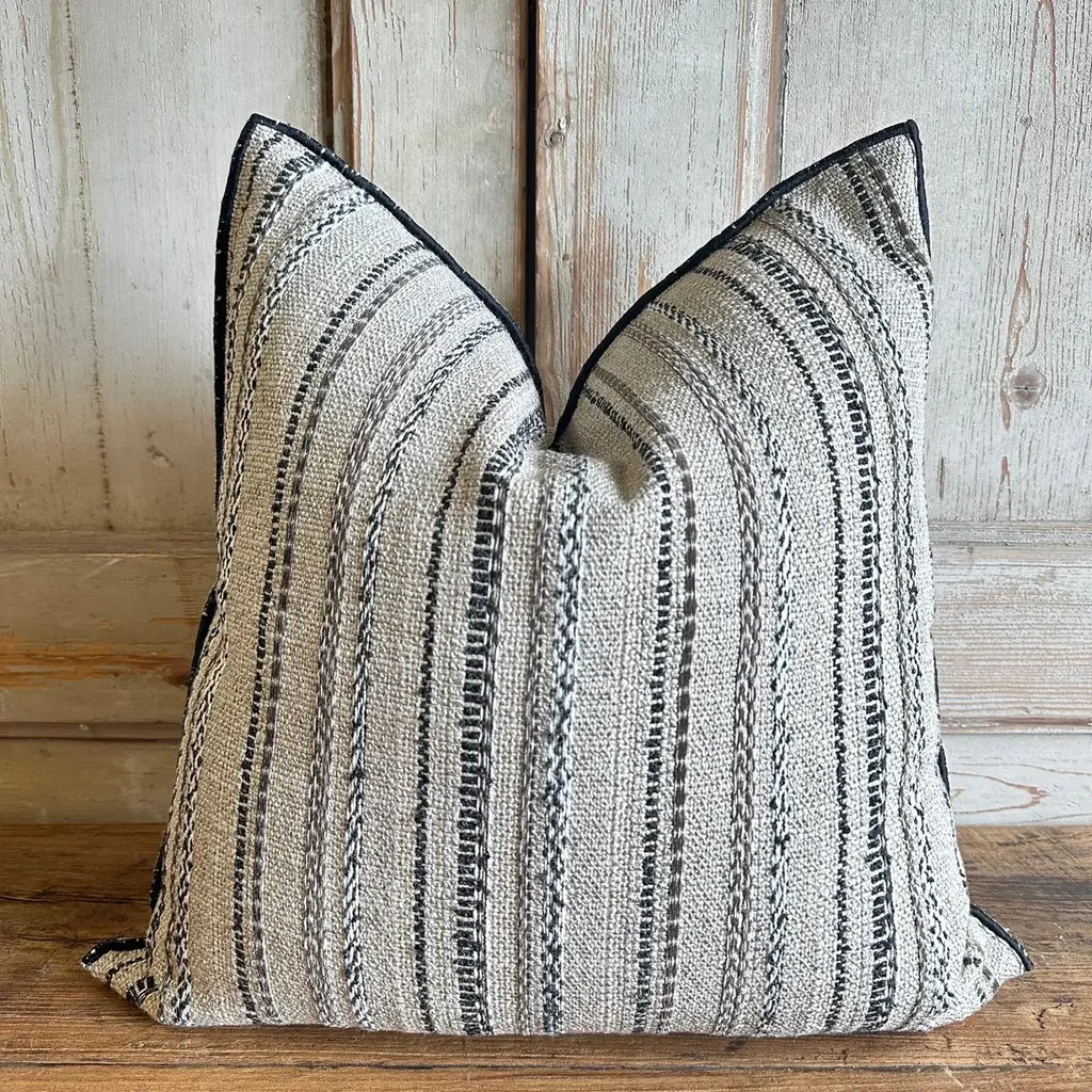 Custom toile bivouac rayee pillowMade in FranceCustom bloom home pillow in a thick nubby natural linen with woven embroidered stripes in black, creamy white, and coco brown. Finished with a black stitched edge.Heavy weight, very soft hand.Size: 20x20 (size shown)Includes a down insert.Lumbar pillows are also available. Please inquire.Limited quantities in stock, if it is not available then there will be a production time of 4-6 weeks. Other standard sizes available to order 15x23, 26x26, 12x20