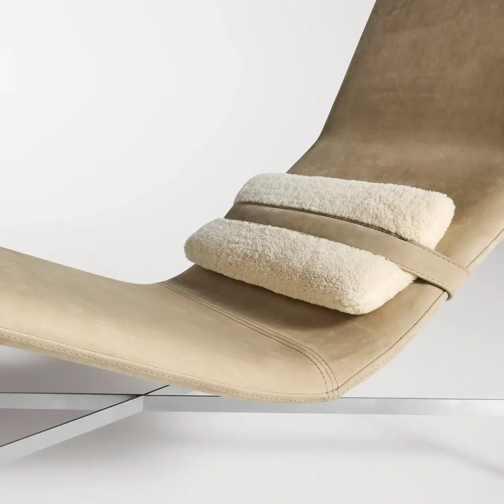 Leather wrapped contours form a relaxing position that equally invites introspection and socialization. The contrasting lumbar pillow slides to be where you want it and blackened steel base provides all the support needed to start your journey of taking a damn load off. Lounge Chair also available.
