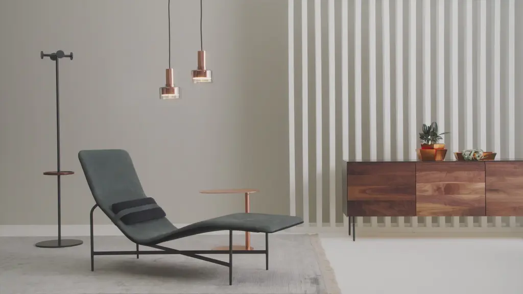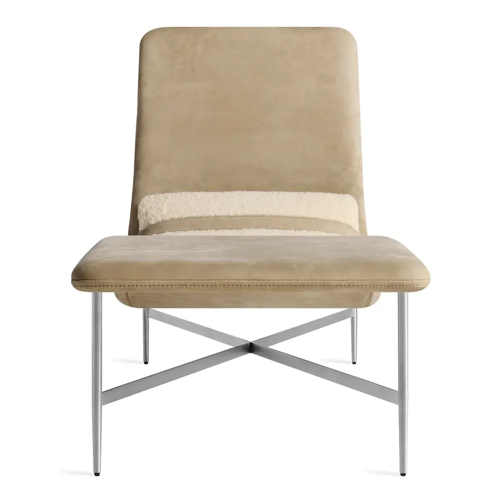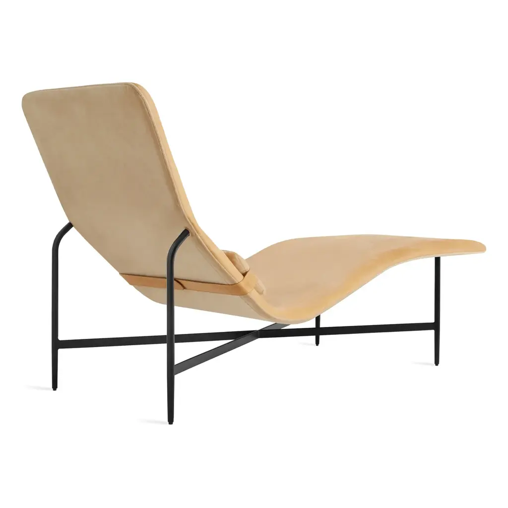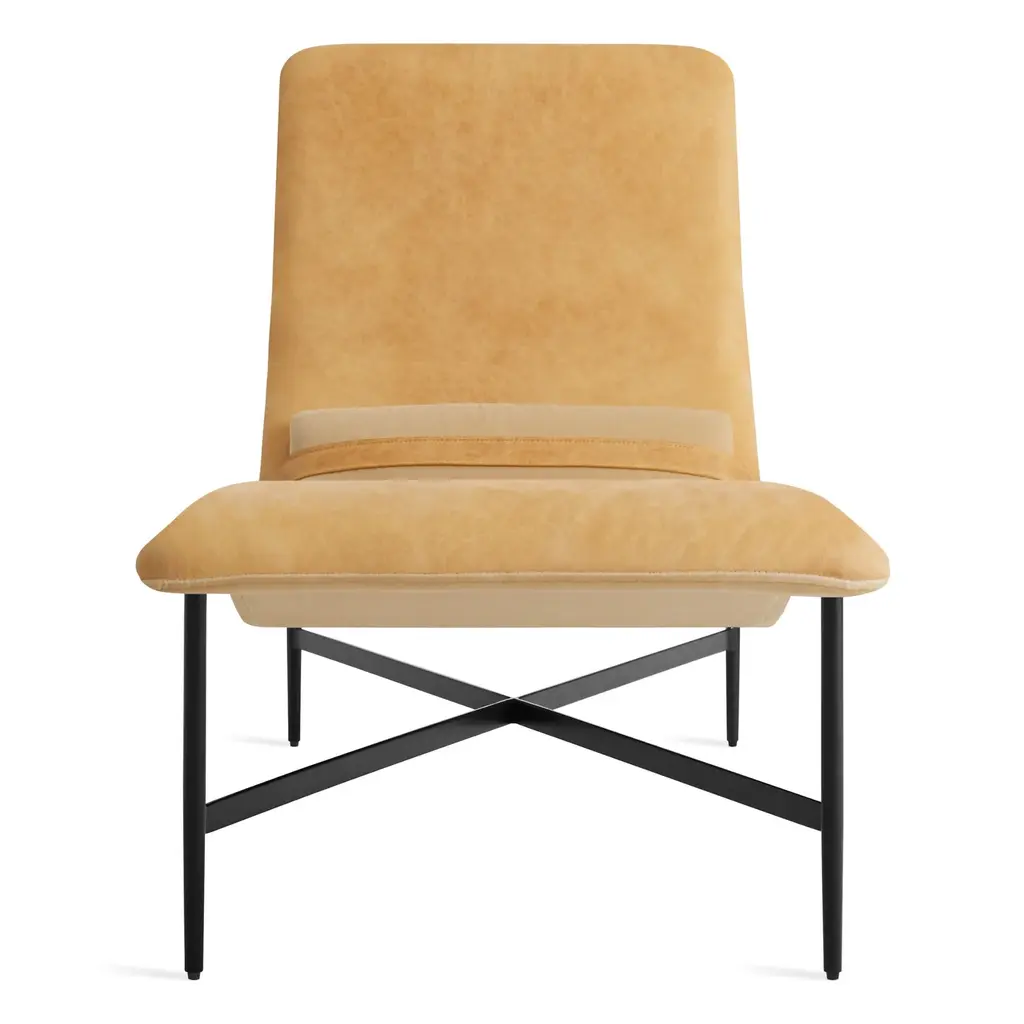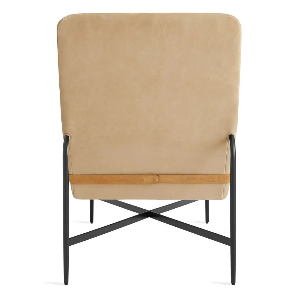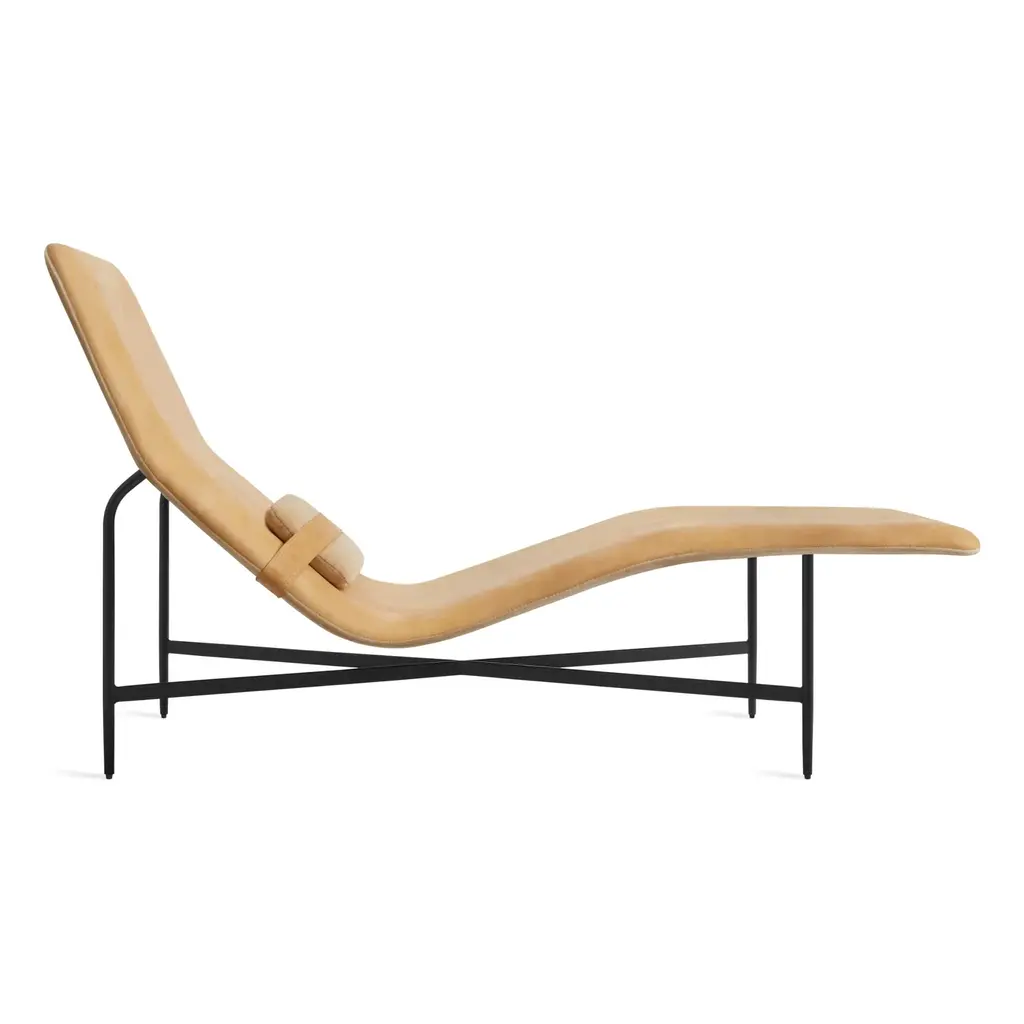 Leather wrapped contours form a relaxing position that equally invites introspection and socialization. The contrasting lumbar pillow slides to be where you want it and blackened steel base provides all the support needed to start your journey of taking a damn load off. Lounge Chair also available.