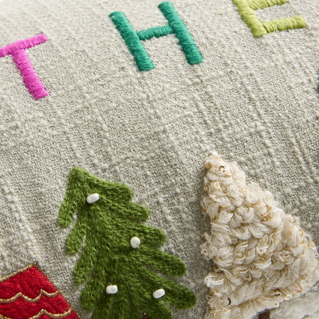 Create a cheerful ambience while home for the holidays with our exclusive lumbar pillow in an extra-wide length that's perfectly oversized for a sofa or bed. This merry and bright throw pillow is made in India with an embroidered and beaded village featuring quaint houses, pine trees, and a "Joy to The World" declaration. We adore how the mint-green ground - with pops of vibrant colors and metallics - brings a fresh, modern vibe to your Christmas decor.