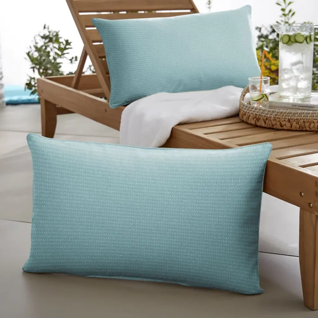 Transform your backyard into a cozy retreat with this set of blue boho-patterned lumbar pillows. Designed for outdoor use, they're crafted from weather-resistant, 100% solution-dyed acrylic fabric, ensuring lasting color vibrancy and UV protection. Made in North America, these rectangular pillows add a touch of fun and freshness to your outdoor space while providing extra comfort for you and your guests. Although the covers are sewn closed, the pillows are easy to maintain – simply spot clean or dry clean when needed. Enjoy your outdoor oasis in style and comfort with these delightful lumbar pillows.