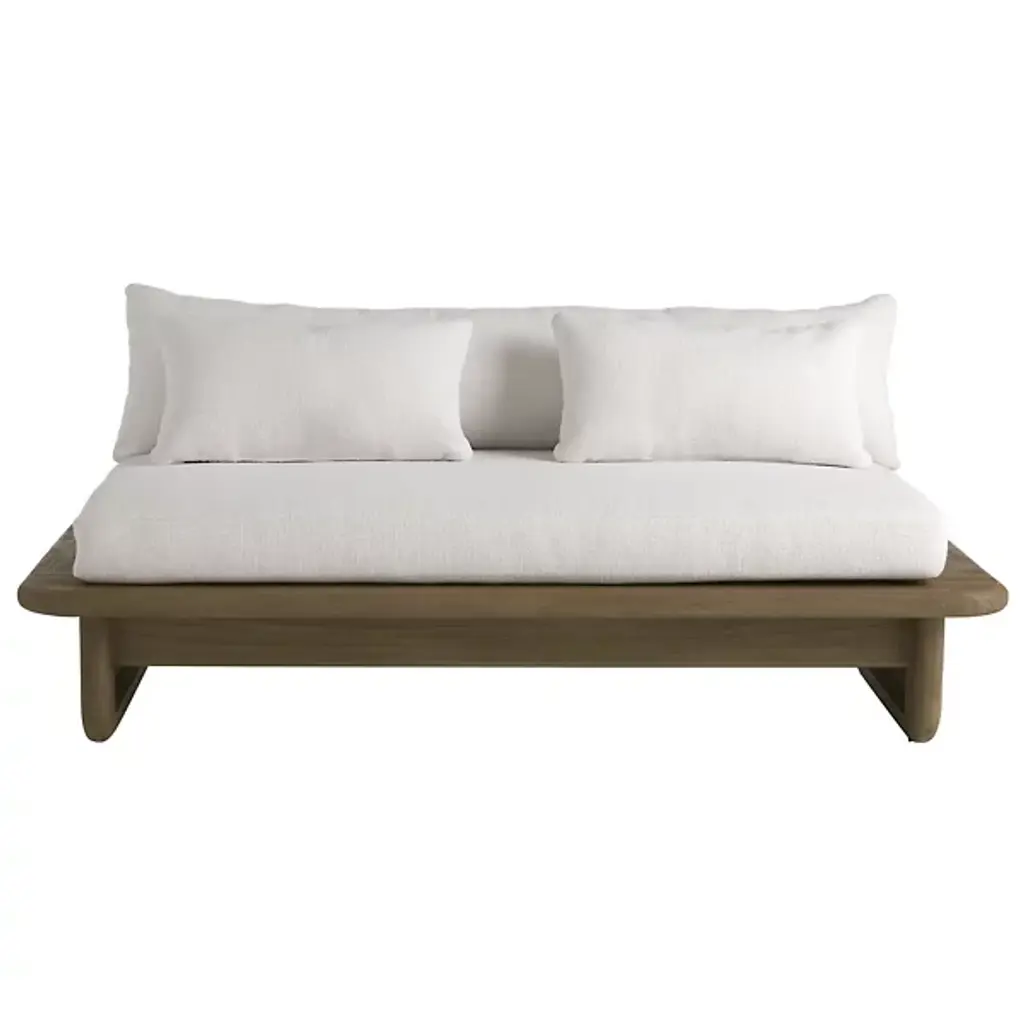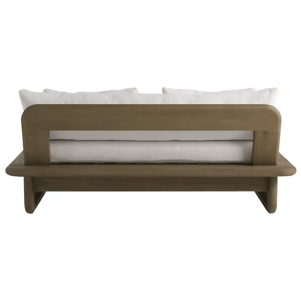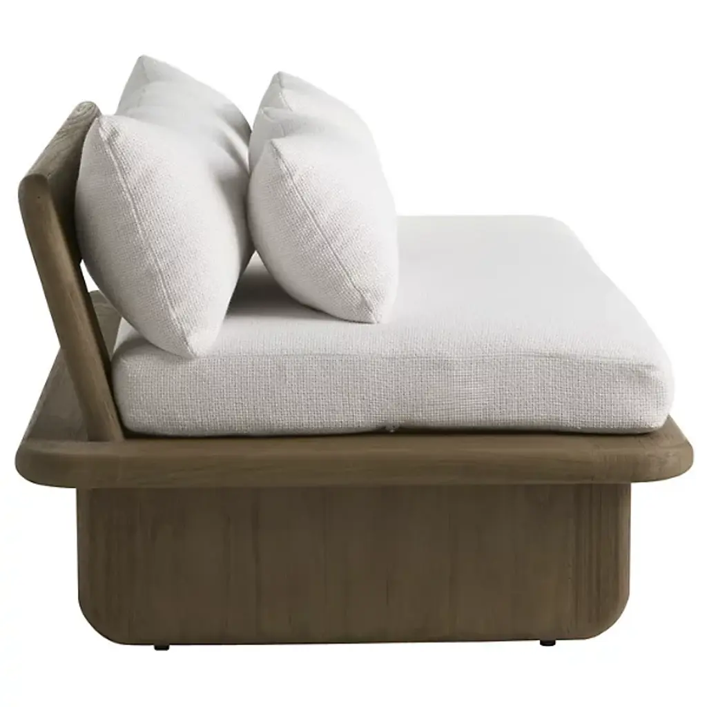 The Fargo Outdoor Settee from Arteriors draws inspiration from Japanese design principles through its planar form and weathered teak wood construction. This small settee features rounded edges and a deeper seat that enhances comfort for relaxed outdoor lounging. The included Shale Outdoor Texture cushion and two lumbar pillows provide additional support and softness. Perfect for creating intimate conversation areas on covered porches or positioned under pergolas, this piece also works well when arranged in pairs to frame outdoor dining spaces or fire pit areas.