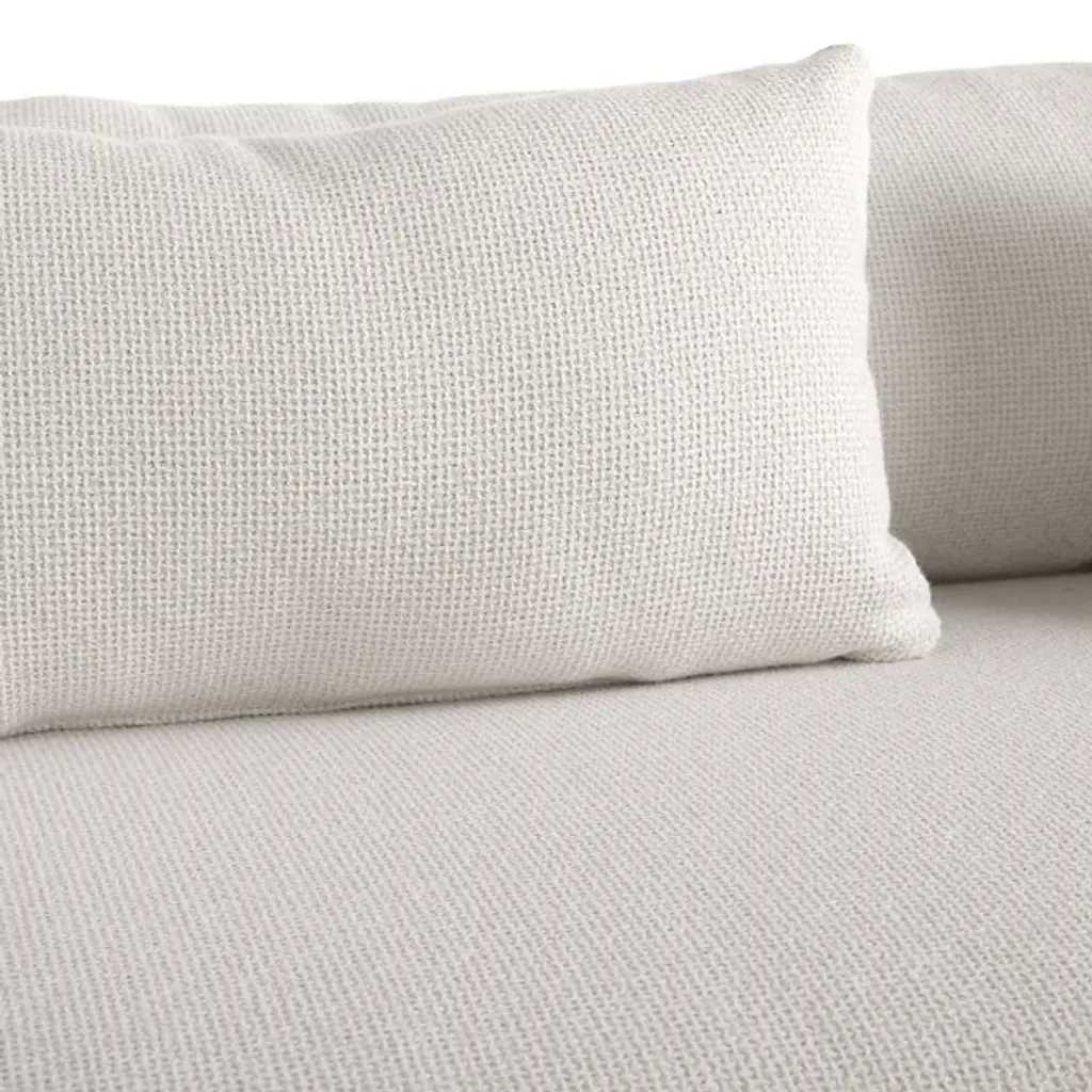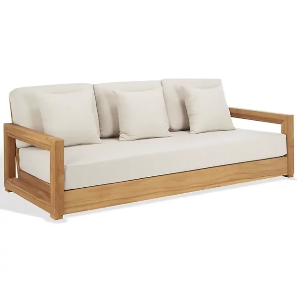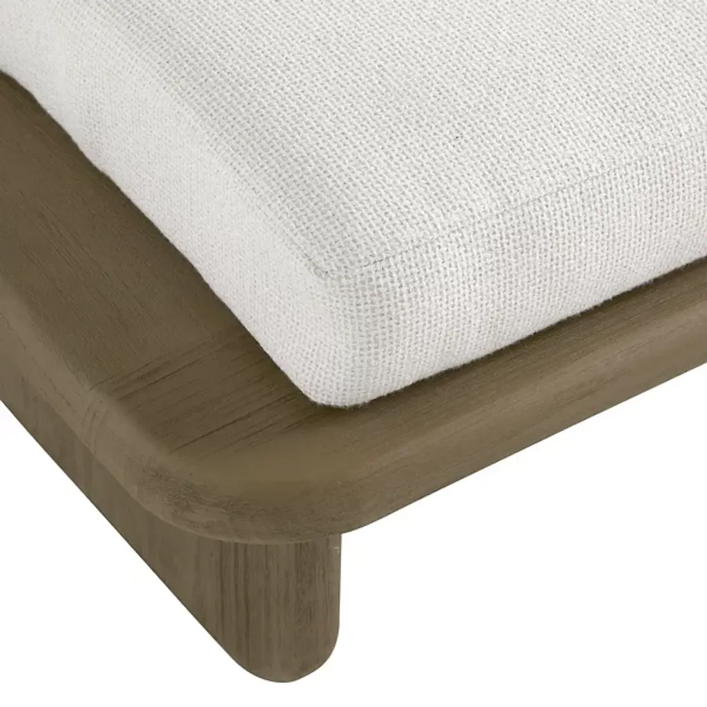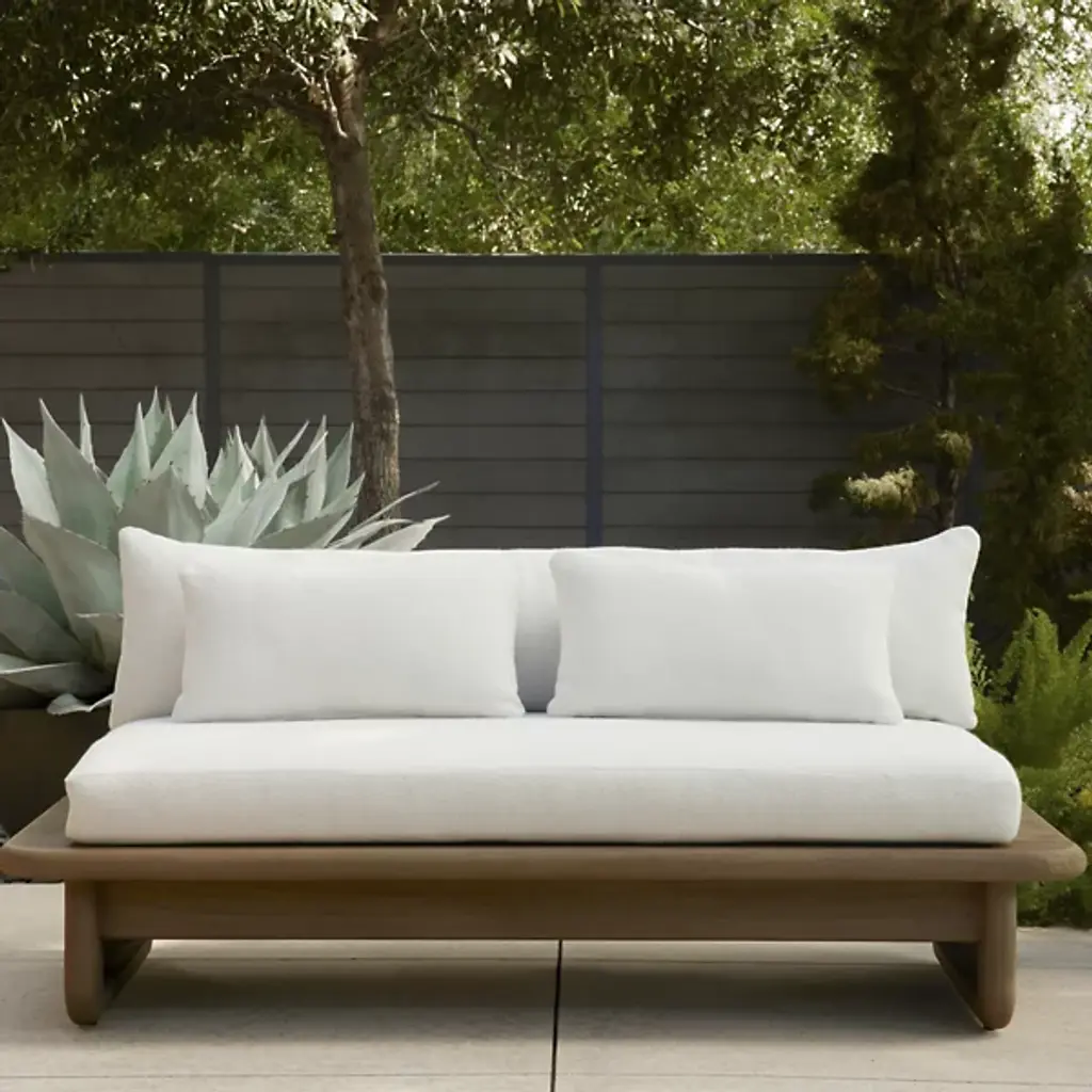 The Fargo Outdoor Settee from Arteriors draws inspiration from Japanese design principles through its planar form and weathered teak wood construction. This small settee features rounded edges and a deeper seat that enhances comfort for relaxed outdoor lounging. The included Shale Outdoor Texture cushion and two lumbar pillows provide additional support and softness. Perfect for creating intimate conversation areas on covered porches or positioned under pergolas, this piece also works well when arranged in pairs to frame outdoor dining spaces or fire pit areas.