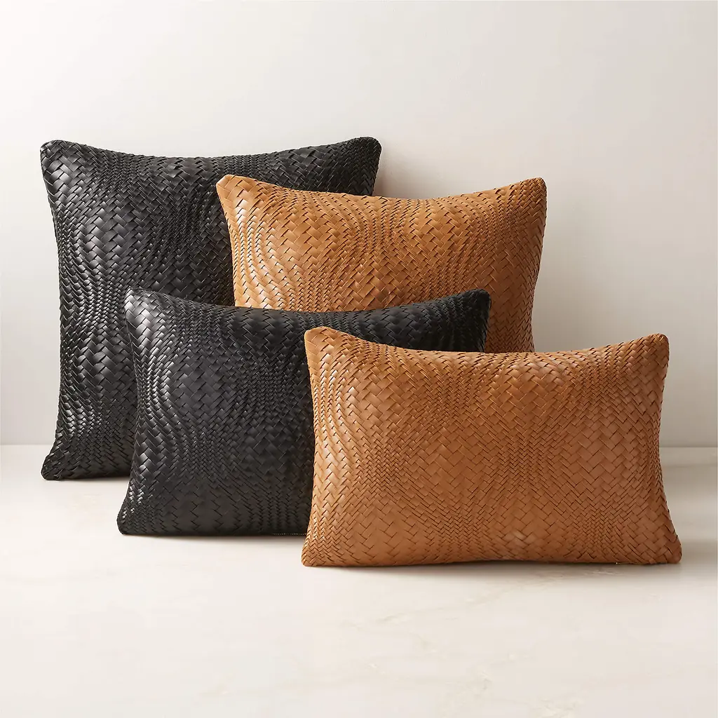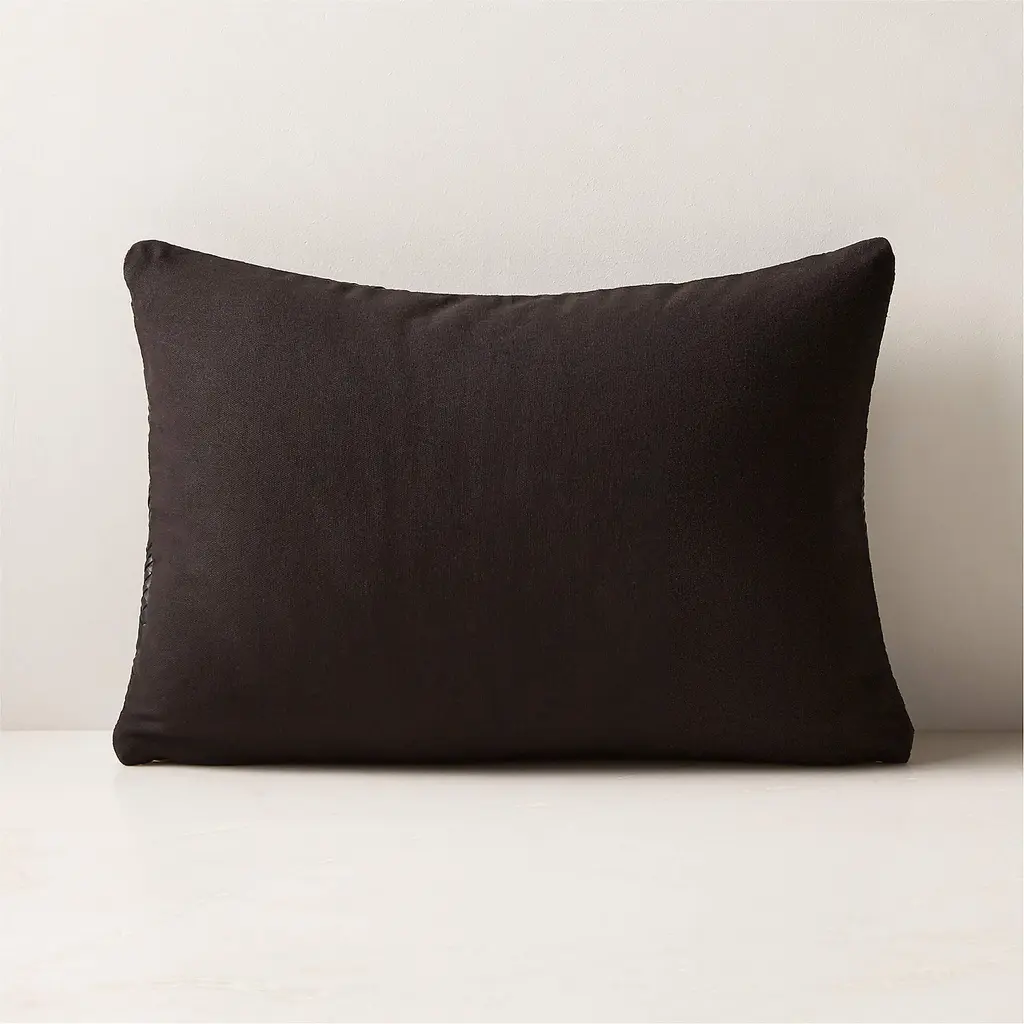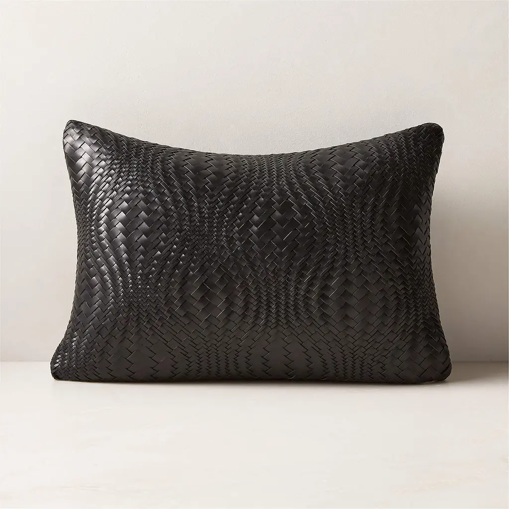 Flow Woven Black Leather Throw Pillow with Feather-Down Insert 18''x12''