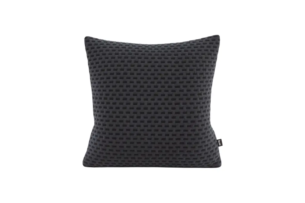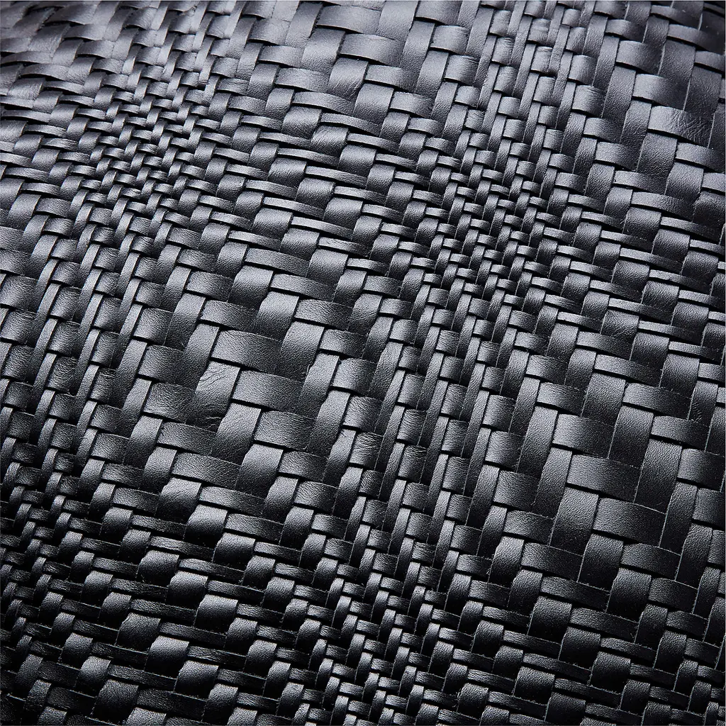 Strips of black genuine leather are woven together for a unique, optical design on this throw pillow. Black pillow flips to a solid black cotton back. CB2 pillows include a pillow insert in your choice of feather down or down alternative. CB2 exclusive.