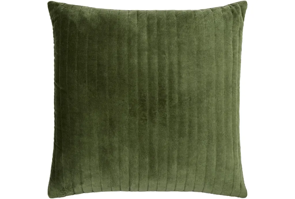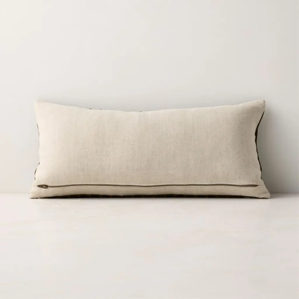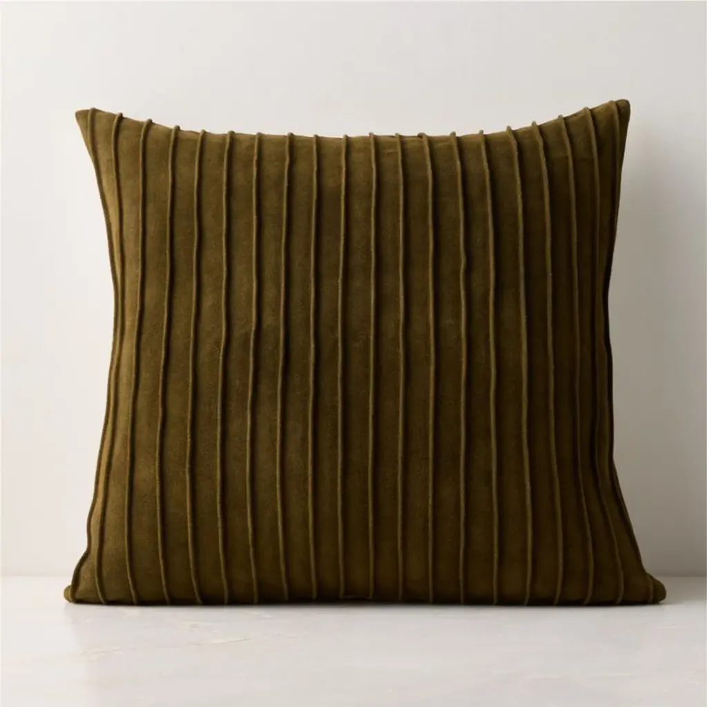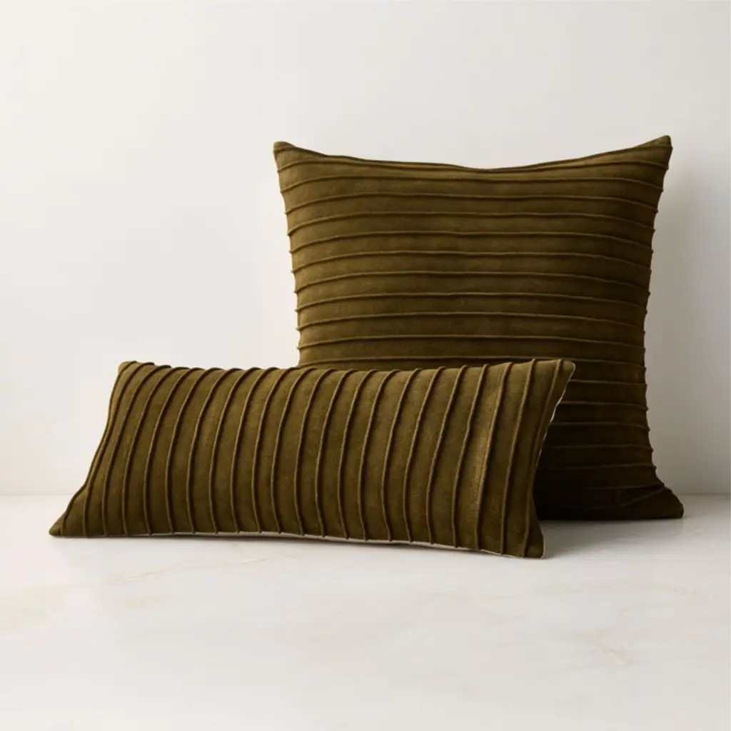 Buttery-soft olive green suede is cut into panels to create an elegant gathered effect that's perfect for layering texture on a sofa or bed. Lumbar pillow flips to a solid natural linen-cotton back with an exposed zipper. CB2 pillows include a pillow insert in your choice of feather down or down alternative. CB2 exclusive.
