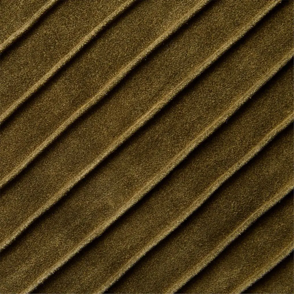 Buttery-soft olive green suede is cut into panels to create an elegant gathered effect that's perfect for layering texture on a sofa or bed. Lumbar pillow flips to a solid natural linen-cotton back with an exposed zipper. CB2 pillows include a pillow insert in your choice of feather down or down alternative. CB2 exclusive.