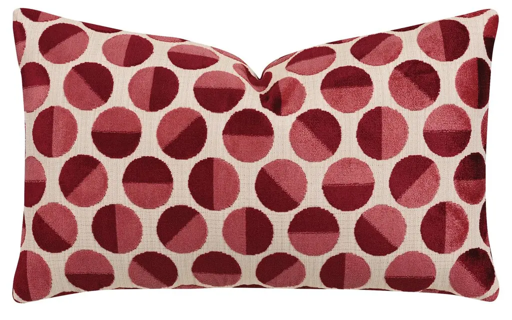 Exclusive to One Kings Lane: Colored circles are stitched atop the canvas fabric on both sides of this lumbar pillow, adding texture and mod panache. Made in the USA, the pillow is amply filled with plume feathers for sumptuous loftiness. Hidden zipper closure.