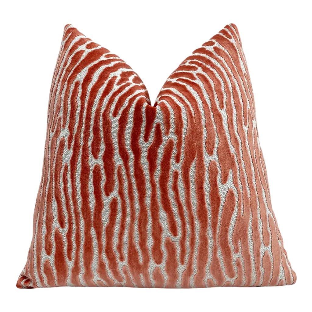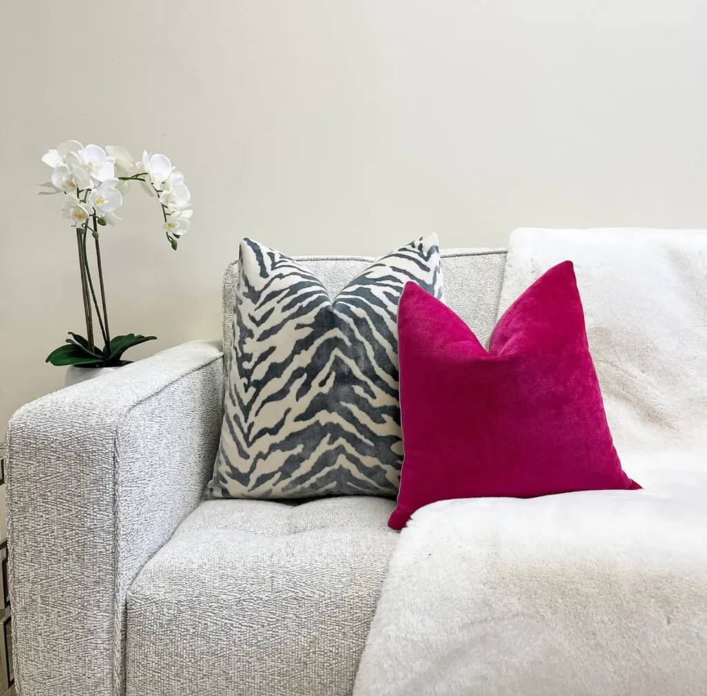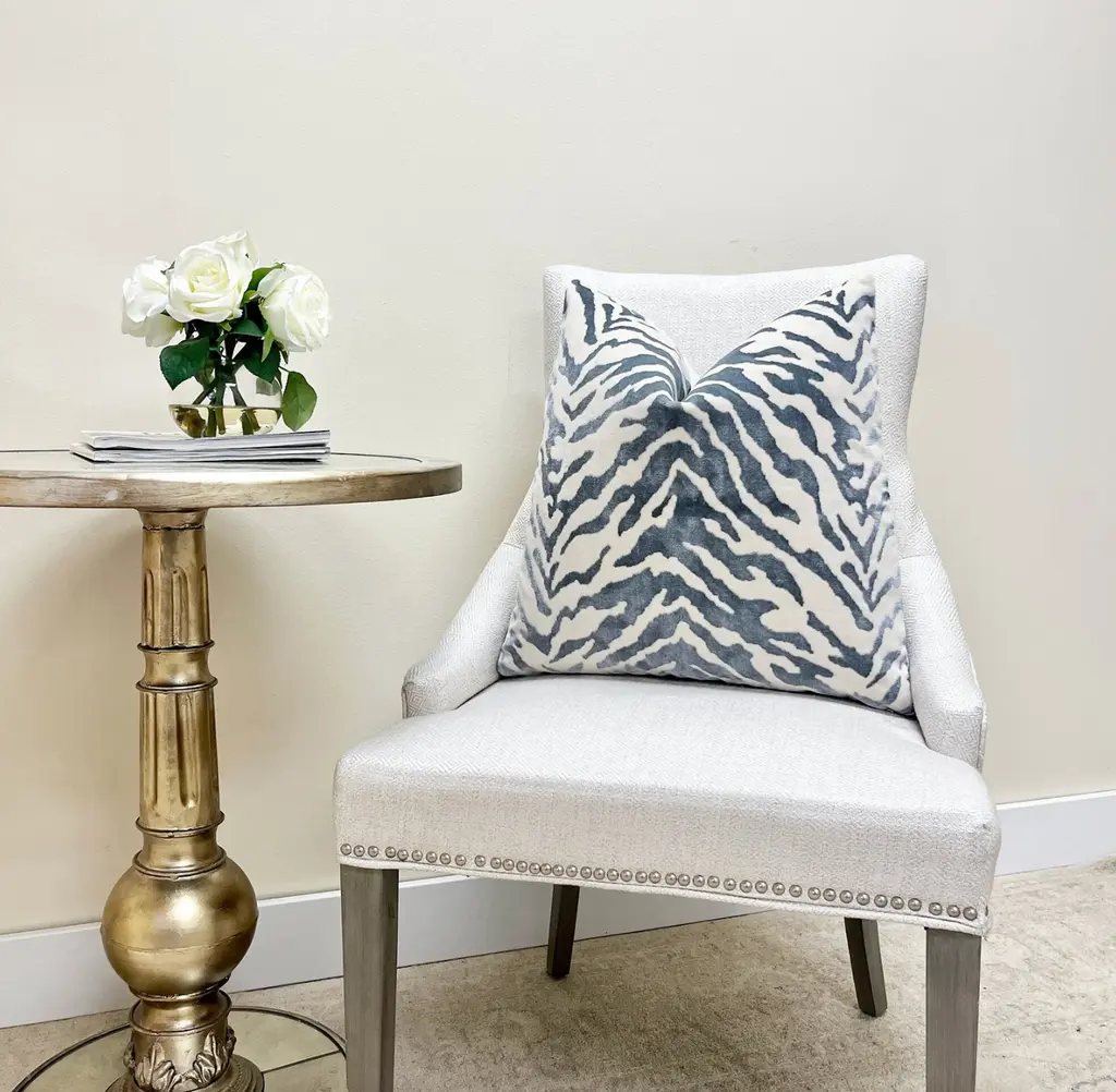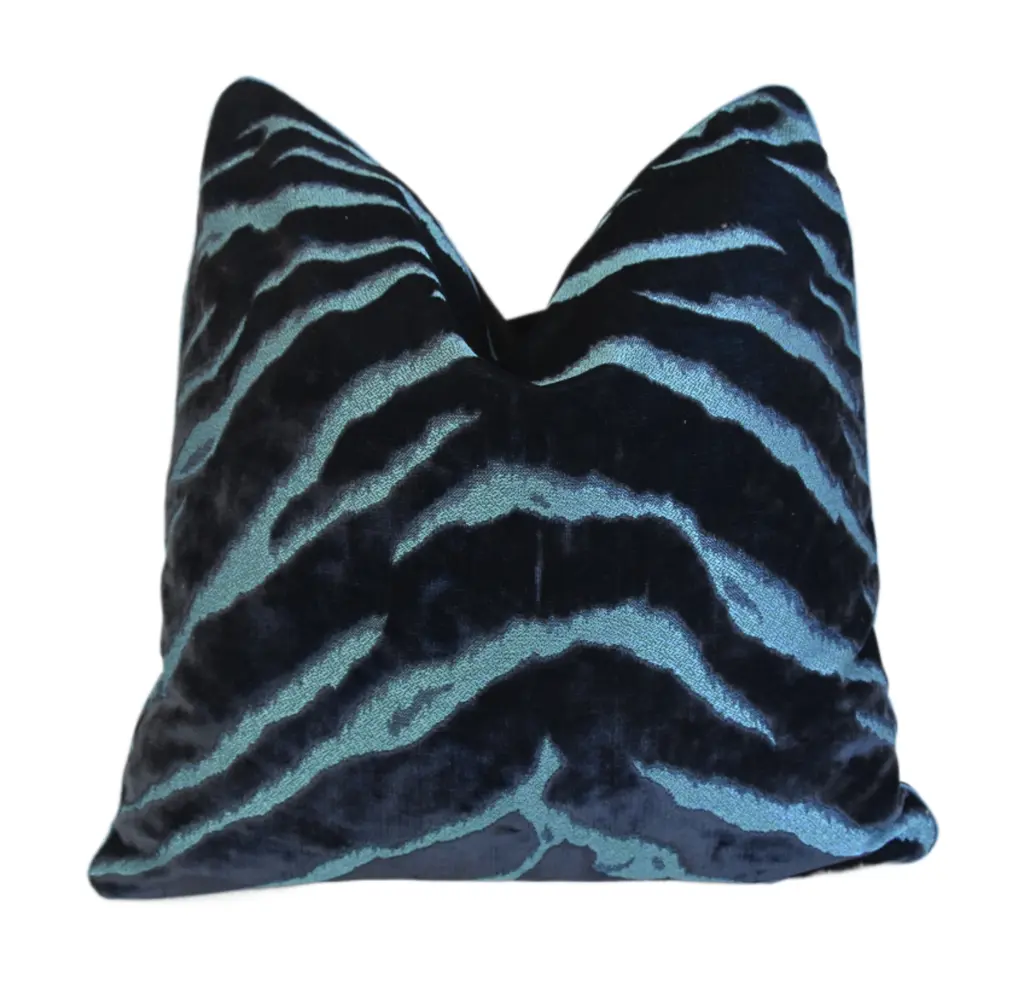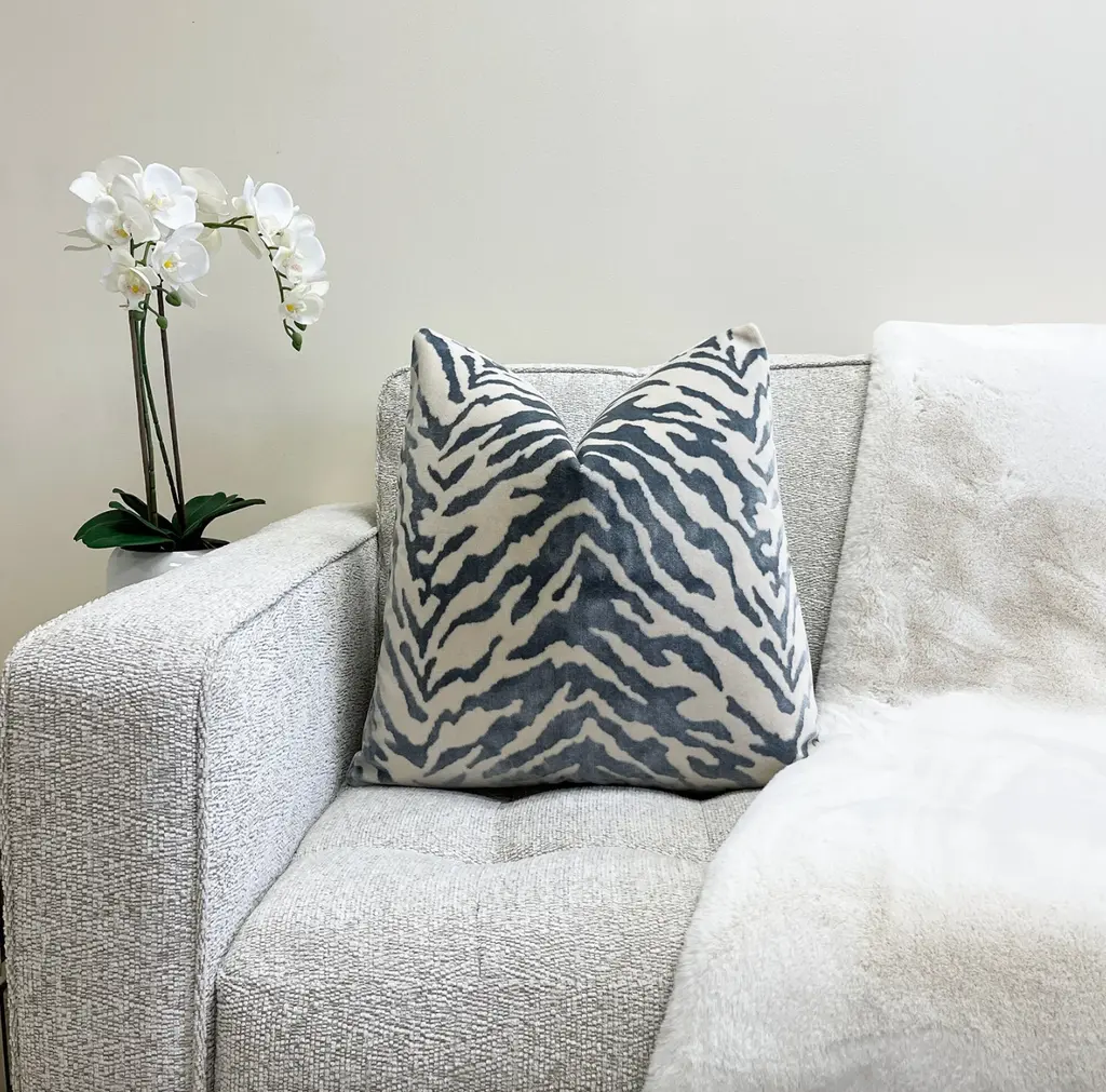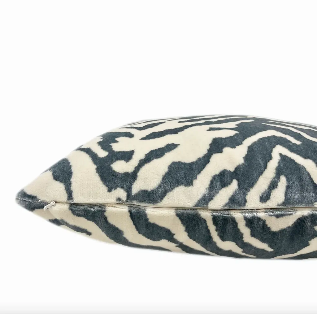 This pillow is everything nice. The fabric is a rich high end plush luxurious velvet that immediately draws the eyes to it and it feels incredibly soft. The color is so elegant, a silvery gray and cream zebra print. This pillow is versatile. It's perfect in a modern environment while retaining its classy elements. Use it as a couch pillow, as a bolster for a bed, or a lumbar pillow. This designer pillow cover is the perfect statement piece to add to a well designed home. Handmade in the US. Fabric: Velvet Stuffing: 95/5 Feather Down Insert Care: Dry Clean Closure: Nylon zipper closure Made to order Will ship within 5 business days This pillow comes stuffed with a Feather down insert - please contact vendor if you'd prefer a Down alternative insert instead.