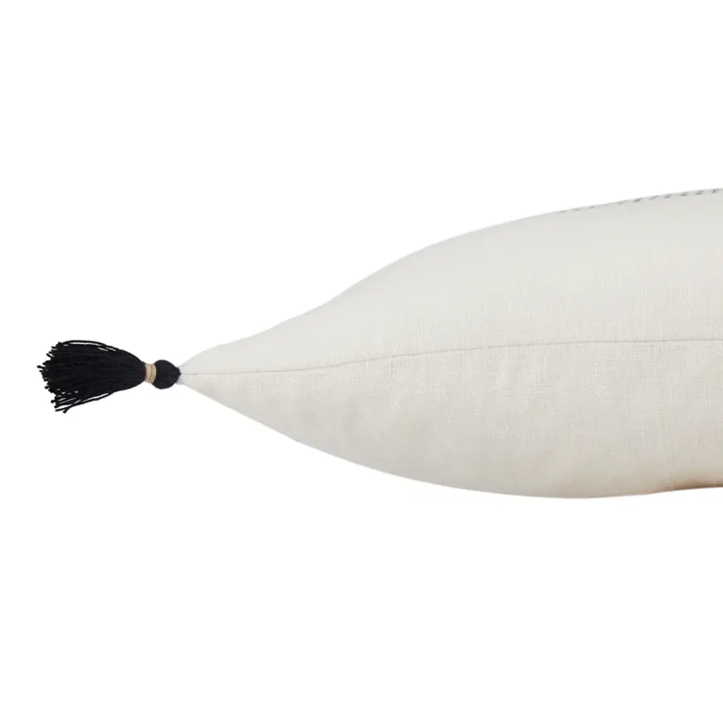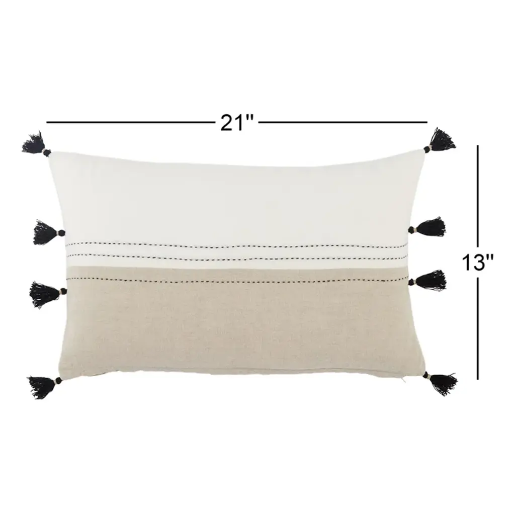 This plush lumbar pillow features neutral beige and cream color blocks, contrast black stitching, and textured tassels perfect for breaking up the look of your solid-colored sofa, chair, or bedspread. The cover is made from 100% linen and has a zipper closure, so you can easily remove it when it needs to be cleaned. Inside, this accent pillow comes with your choice of down or polyester fill, so you can customize how soft or firm it is. When this pillow needs to be cleaned, we recommend taking it to the dry cleaner to preserve the delicate tassel details.