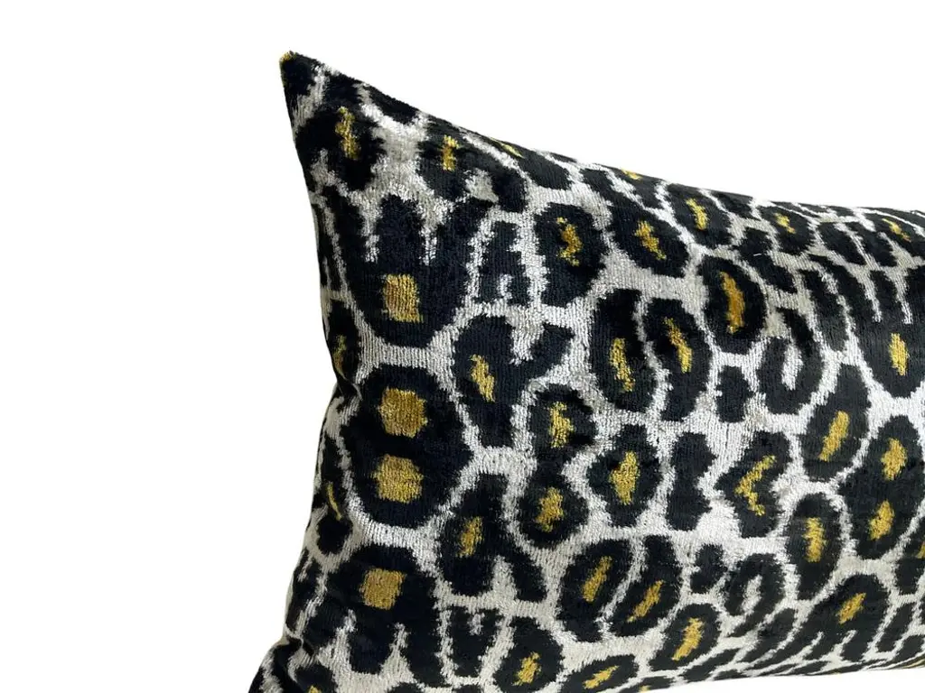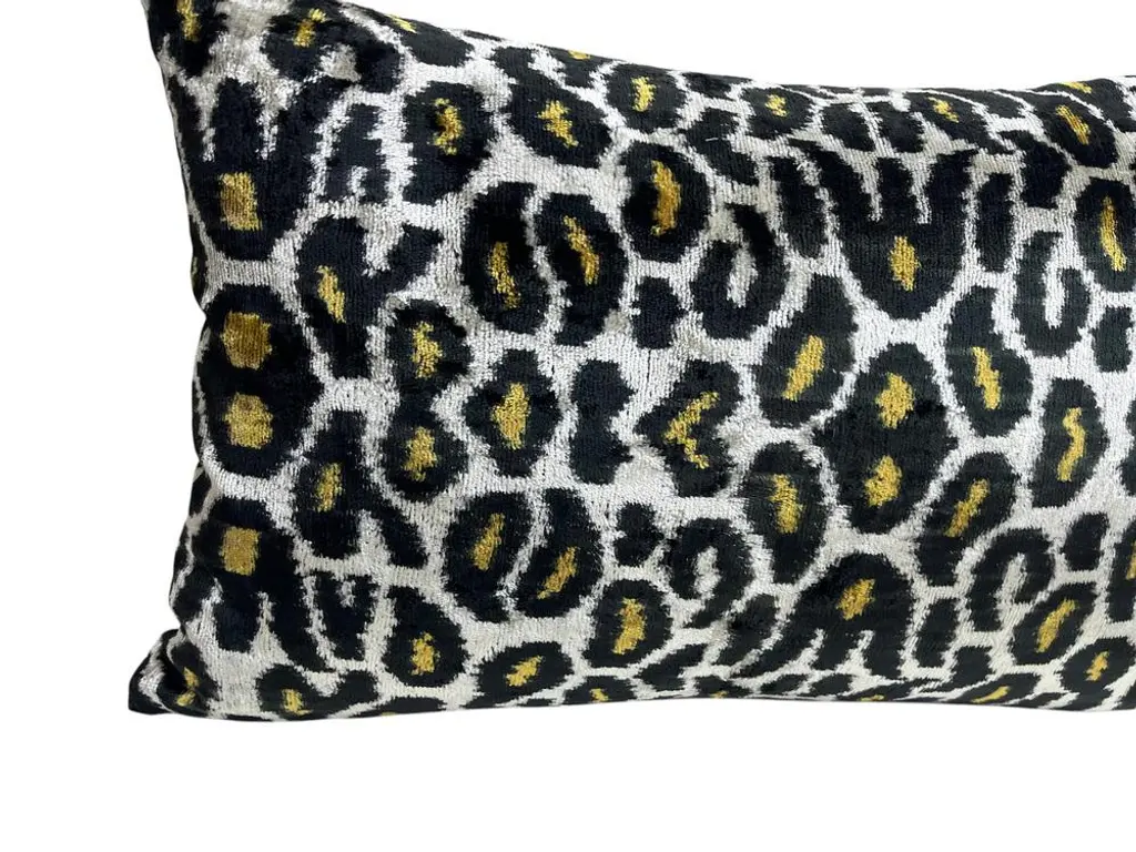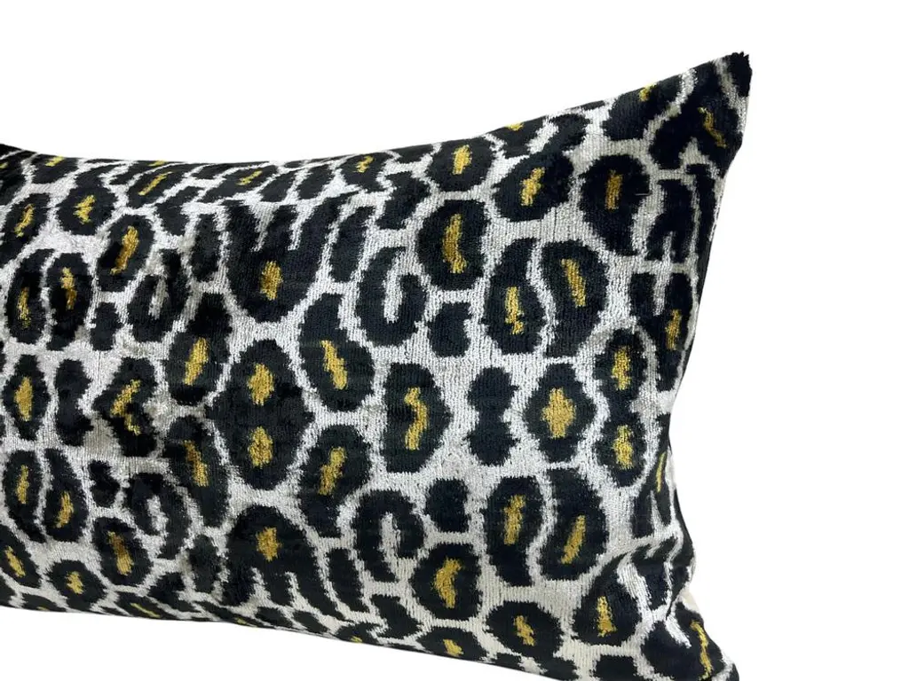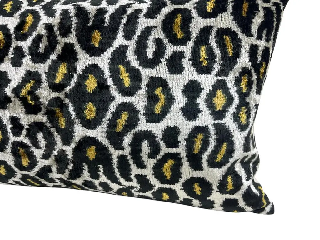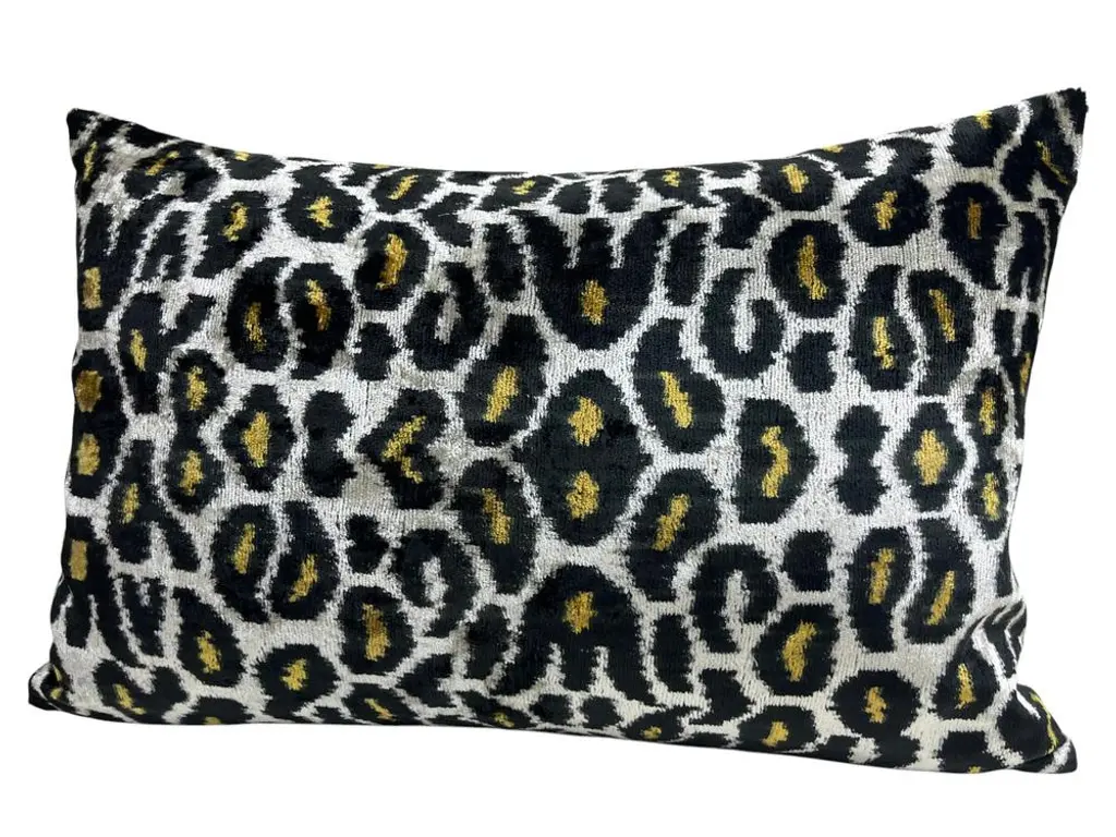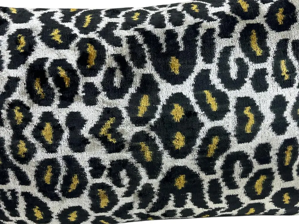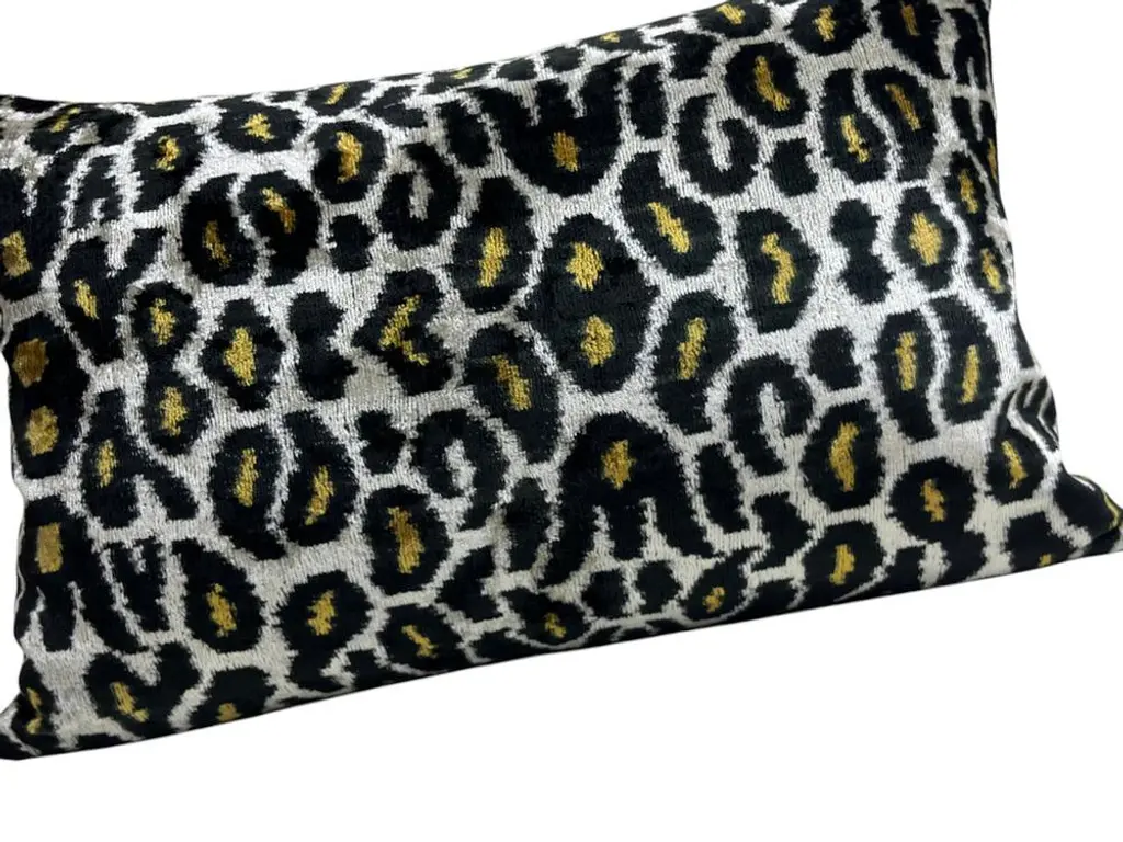 Handmade Velvet Silk IKAT cushion cover with Leopard design and multicolor. It can be a perfect gift for animal lovers. This pillow case features a luxurious silk velvet fabric with an ikat pattern, adding a touch of elegance and sophistication to any space. The unique weaving technique of ikat creates a striking, artistic design, while the softness of the silk velvet ensures both comfort and visual appeal. Perfect for accenting your living room, bedroom, or any area in need of a stylish, refined statement piece. 16" 24" Inc / (40x60cm) Care: Dry Cleaning Cushion insert is not included
