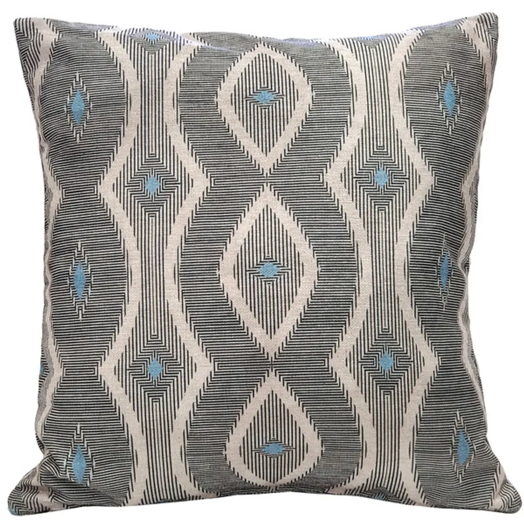 Kitri features an interesting linking pattern that will pair well with any pillow. This pillow comes with a solid back fabric and may be found in these colorways: Guava, Stone, and Reef. It may also be available as a lumbar pillow.