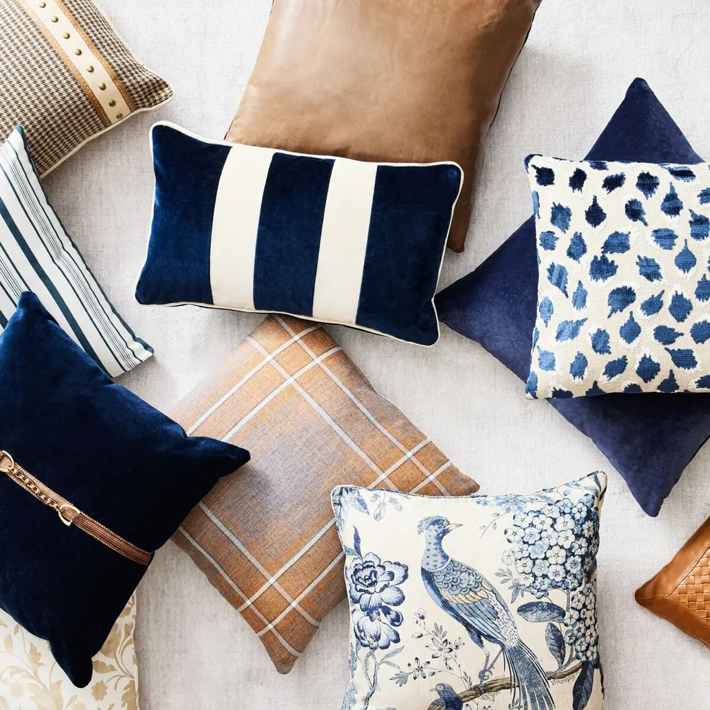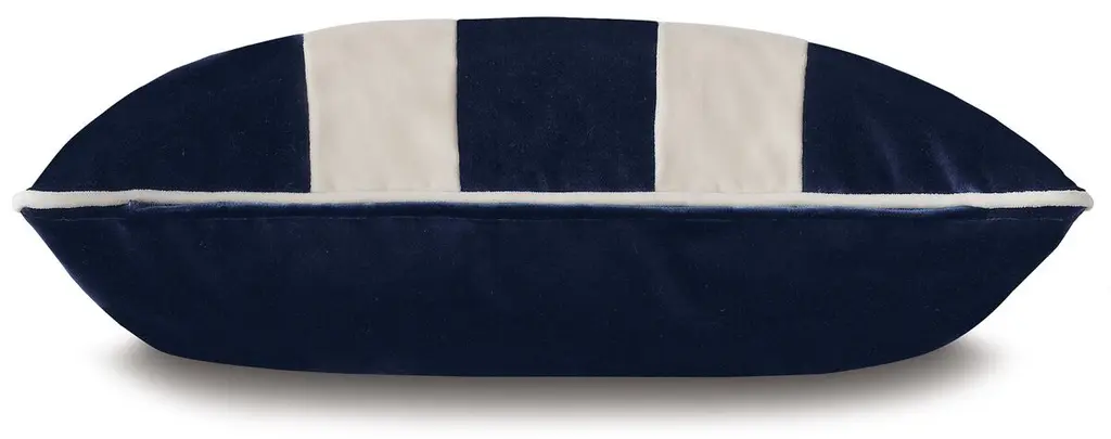 Exclusive to One Kings Lane: Two white stripes on the front and matching welt give this navy-blue lumbar pillow a nautical glamour. The small-feather fill ensures luxe loftiness. Hidden zipper closure.