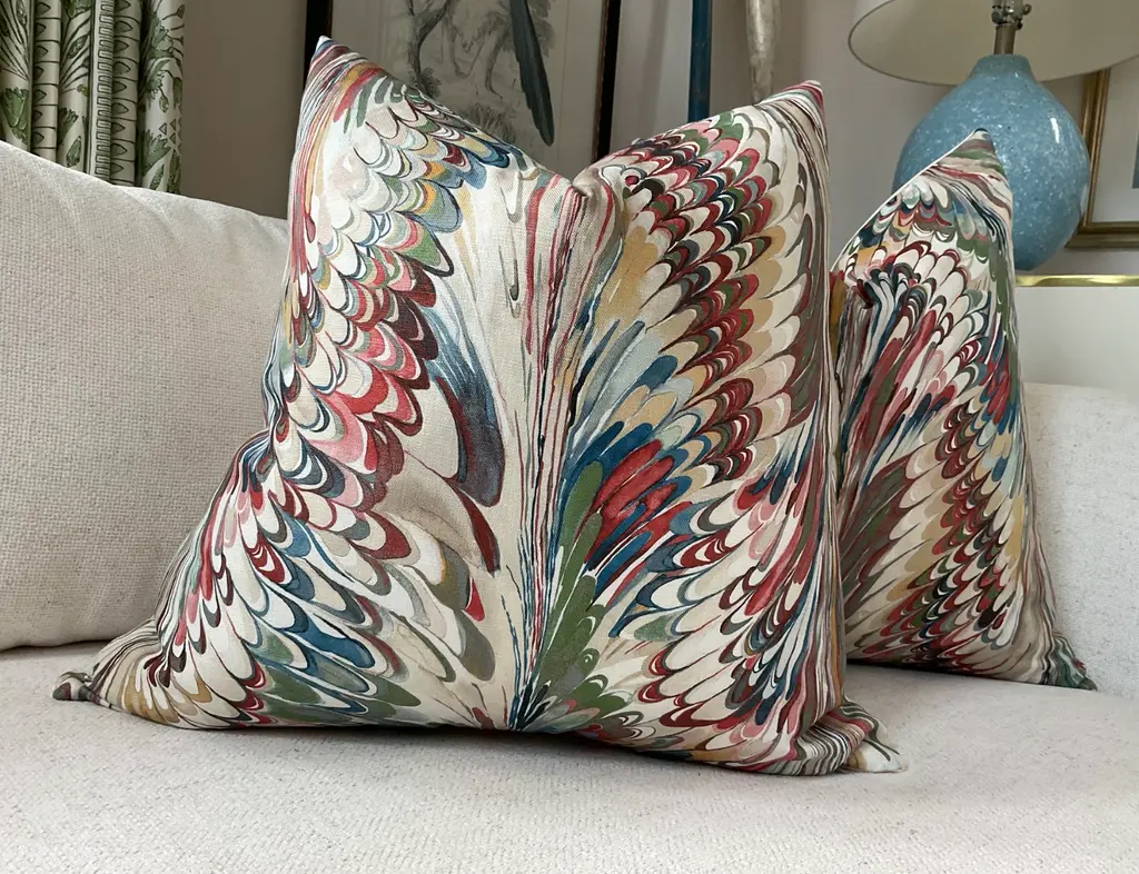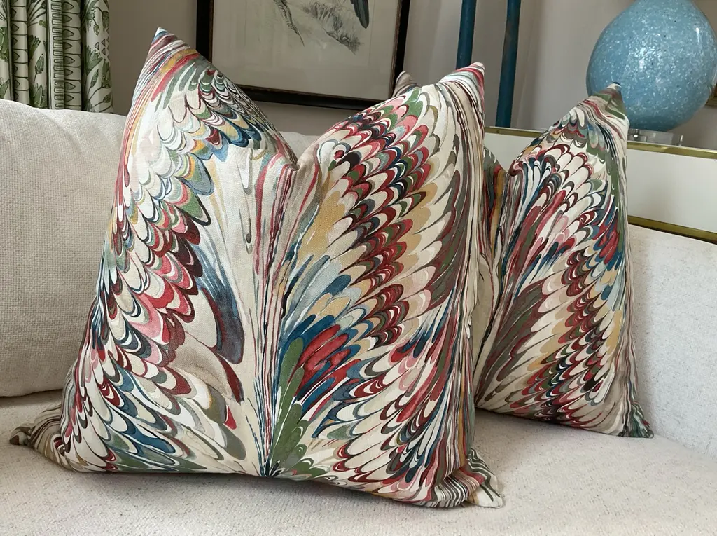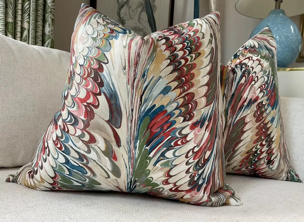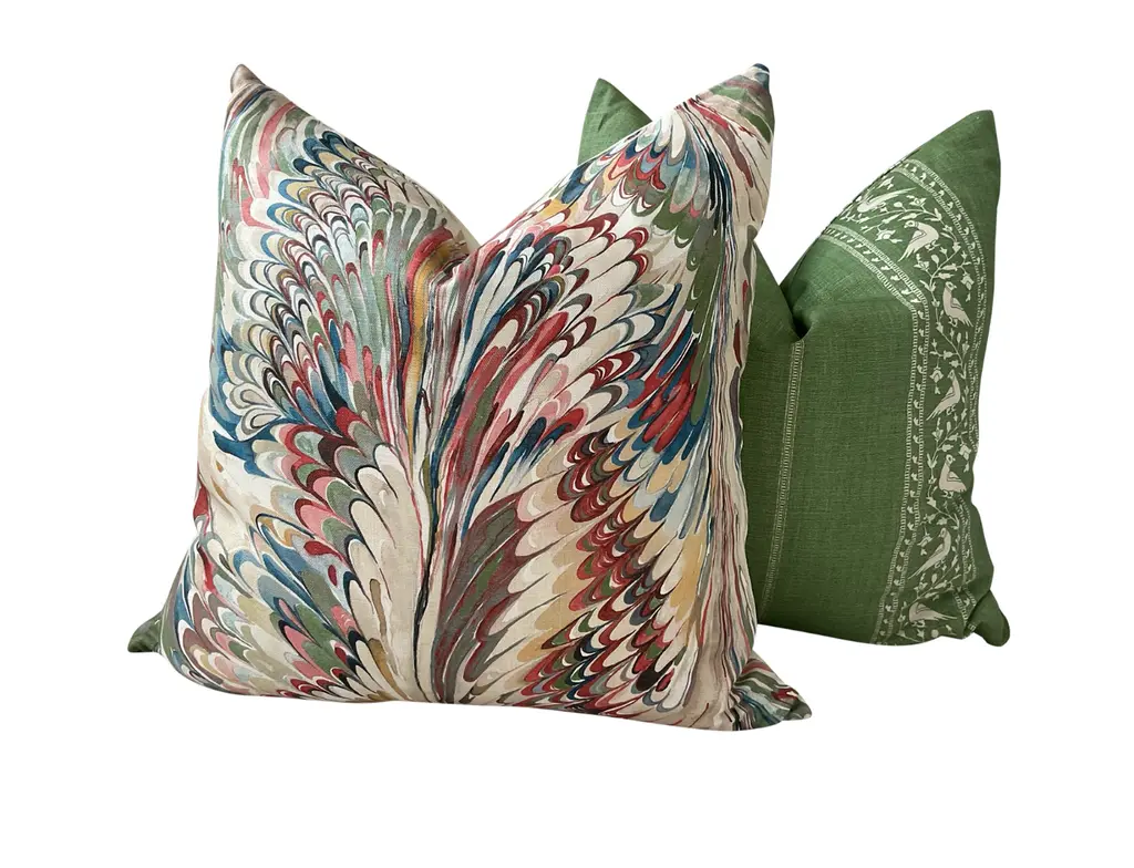 Product listing is for a lumbar pillow in the specified size - pillow in main image is only to represent fabric and pattern. All pillows are made to order and pattern placement varies from pillow to pillow. LOVE this inspiring and fun feather print from Lee Jofa's Manor House collection. "Taplow" in Spice and Leaf is a great pattern pillow to pull together blues and greens. Covers feature swirling shades of greens, turquoise, deep blue, and yellow on white background. Covers will feature Taplow on the front with coordinating white linen back. This listing is for a single pillow with a plush down insert.