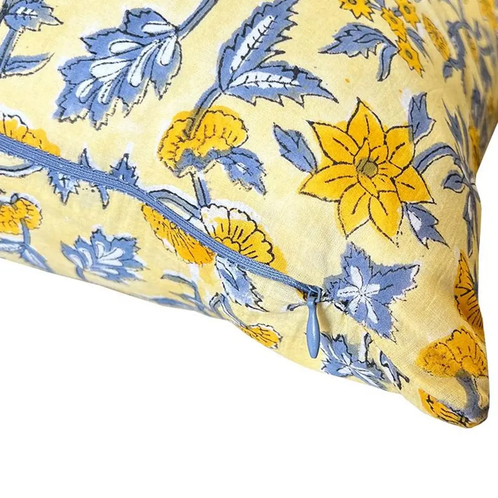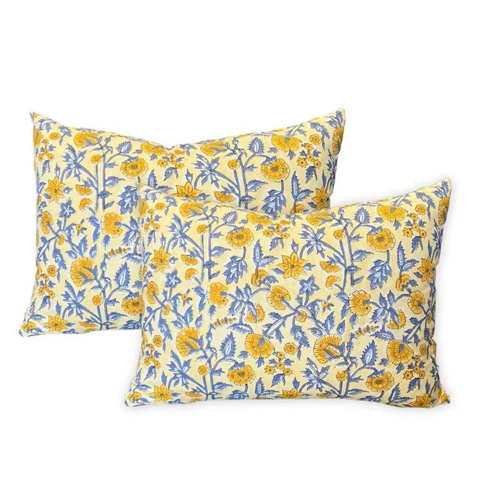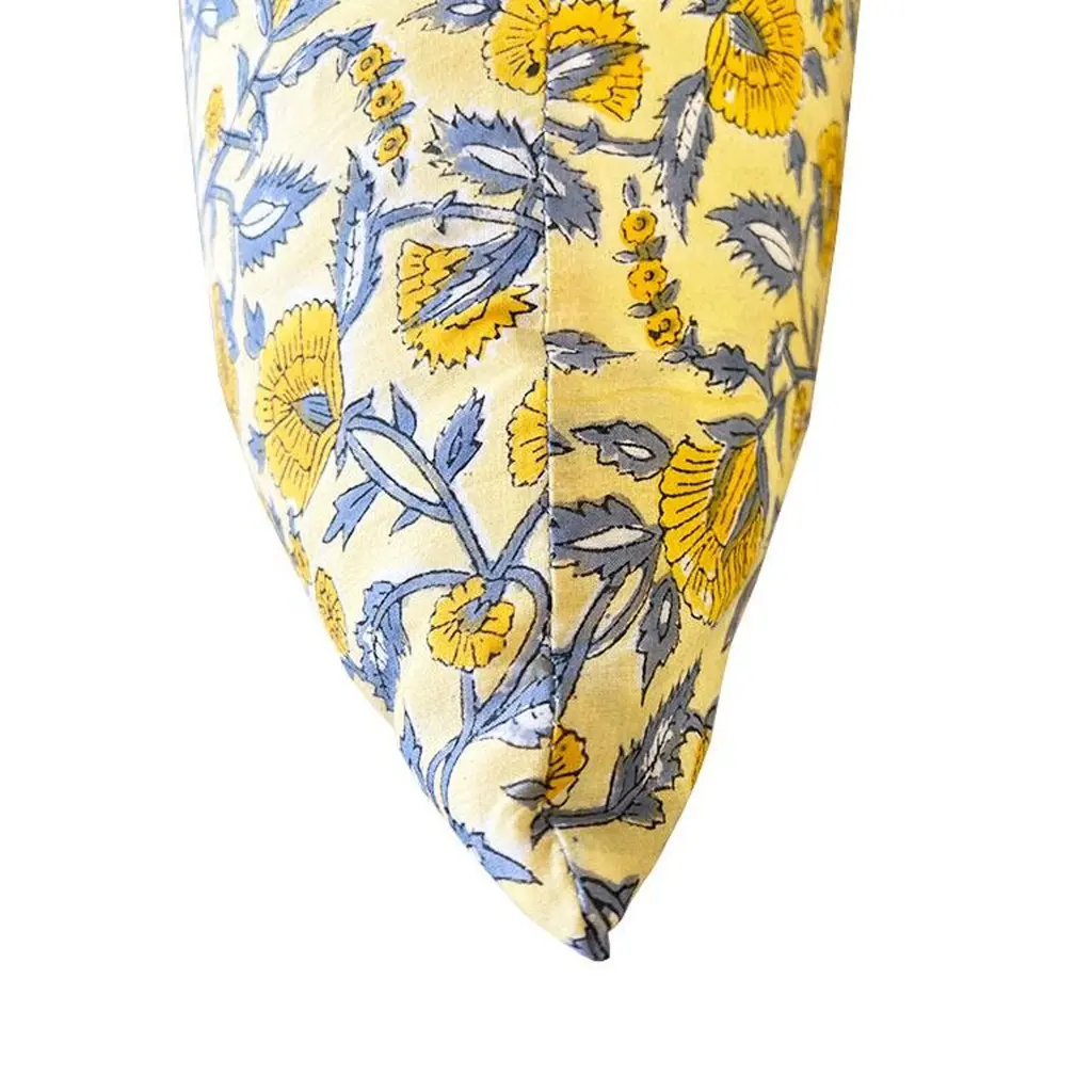 Bring a taste of the Orient to any space with one of our custom-created Indian block print lumbar pillows. Each pillow is made of soft cotton and hand block printed by our artisans in India. Then sewn here in Oklahoma in our workroom. Set on a pale yellow background, pigmented orange flowers with blue foliage flank both sides. A down-fill insert is included with each pillow. The corners are knife-edge, with a hidden zipper on the bottom. This limited edition is inspired by the home of Lee Radziwill at 4 Buckingham Place. Radziwill hired Italian designer Renzo Mongiardino who enveloped the space with various hues of block print fabric on the walls, devan, and lampshades. Indeed a statement room! Dimensions:19" Wide14" Tall