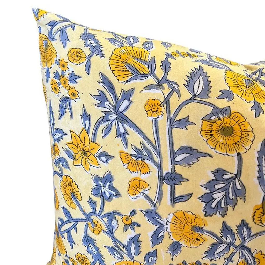 Lee Radziwill Inspired Block Print Down Flower Motif Pillow In Yellow, India