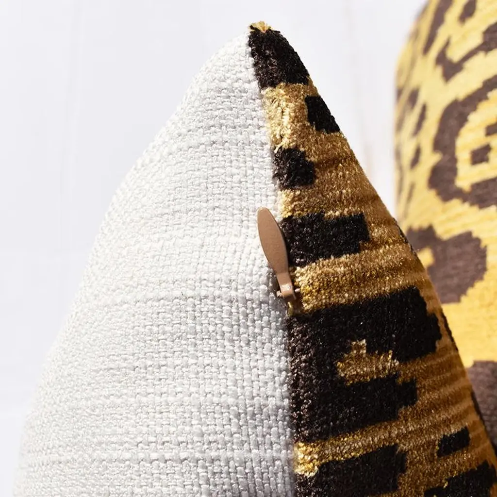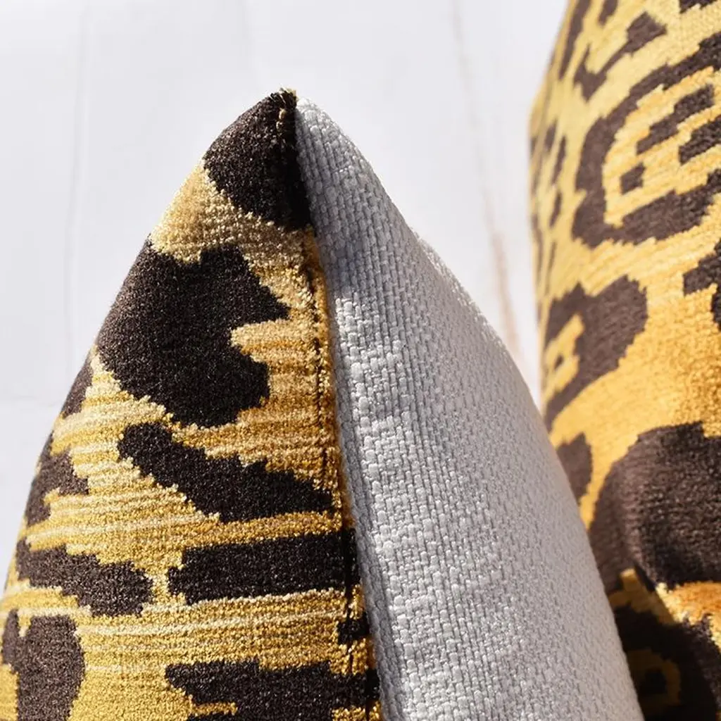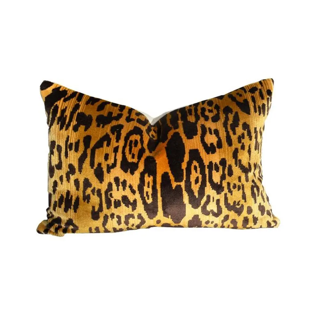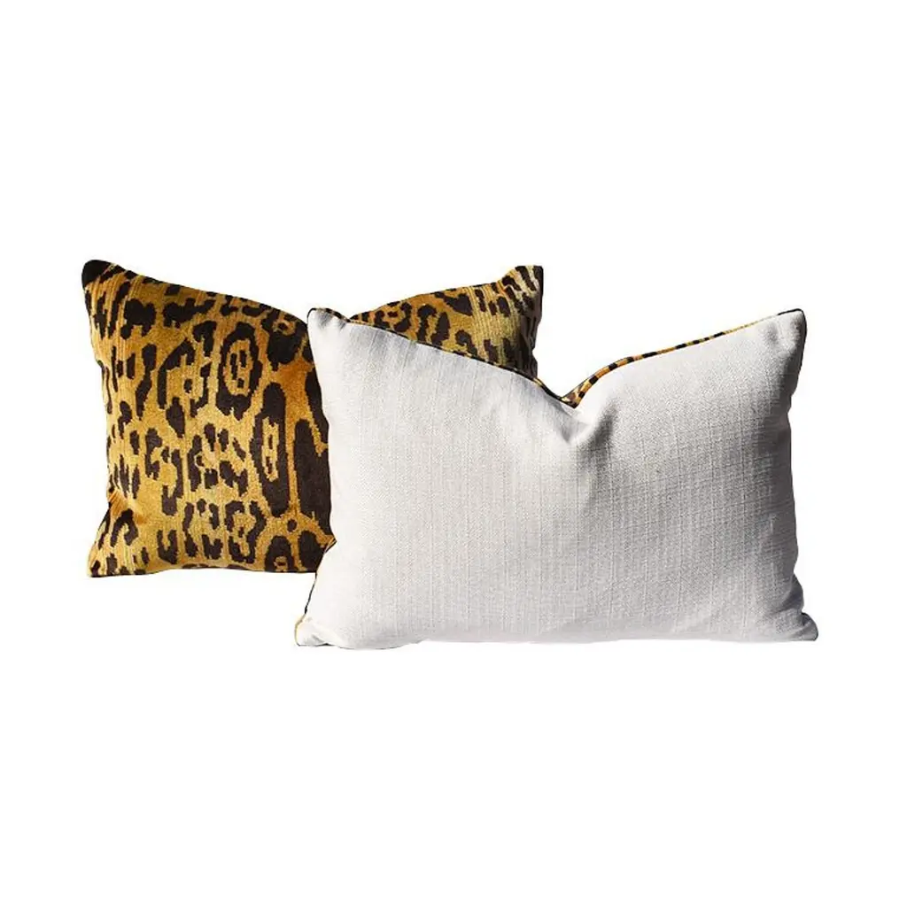 Animal motif leopard print lumbar pillow. Multiple available. The front features the gorgeous thick velvet Leopardo print. Back features a crisp cream. Down-filled. Knife edge with zipper. In the style of Scalamandre's Leopardo print.Note: We've been told that this fabric was woven in the same factory as Scalamandre in Belgium. It certainly feels like it. The pillows would be lovely in a living room in pairs atop a wingback chair, or as a focal pillow in a bedroom in pairs, or groups of 3-4. One of our most popular sellers. Our pillows in Tigre by this brand were hand-picked by designer Miles Redd as one of his favorite pillows.