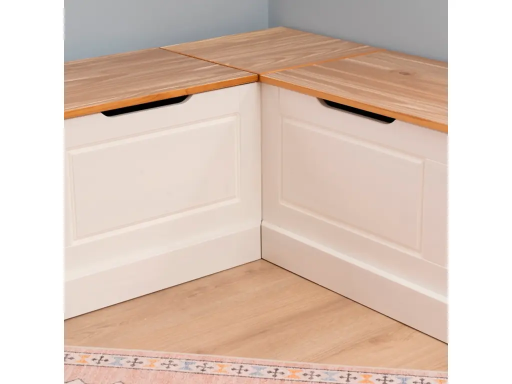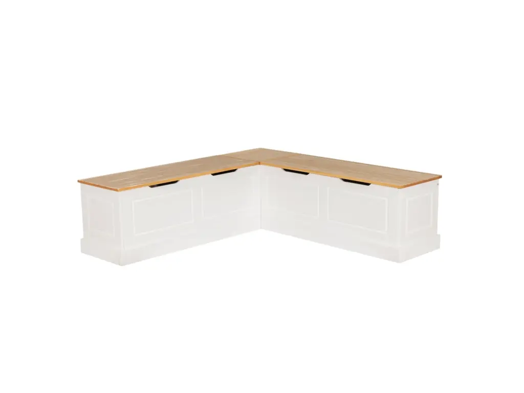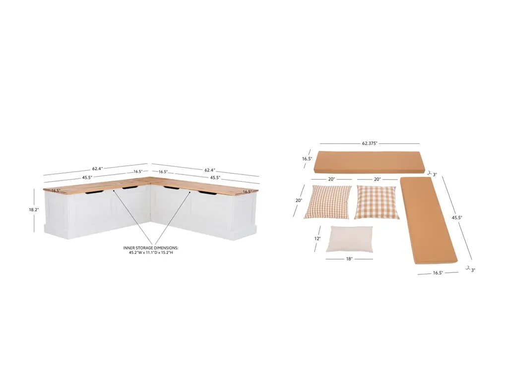 This breakfast nook creates the perfect place to relax with a cup of coffee or gather with friends over lunch. Cottage and farmhouse style will complement any round, rectangle or square table you would like to pair it with. Backless to provide ultimate flexibility with its surroundings, this two-tone piece offers the look of built-ins without the cost or hassle. The natural solid pine seats open up to reveal hidden storage for extra placemats or seasonal decorations. Conveniently comes in one box. Comes with a five-piece cushion and pillow set. The solid beige covers are complemented by two 20” x 20” pillows in coordinated check patterns, including a large-scale buffalo plaid and a matching small-scale plaid, plus a smaller 18” x 12” lumbar pillow in stripes. All fabric can be unzipped and removed for easy cleaning. Adding a dash of coordinated coastal charm to your home has never been easier or more affordable.