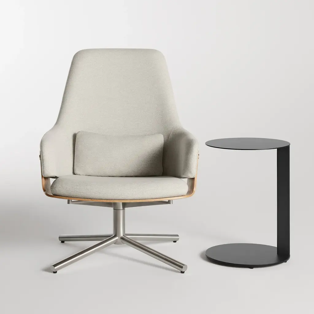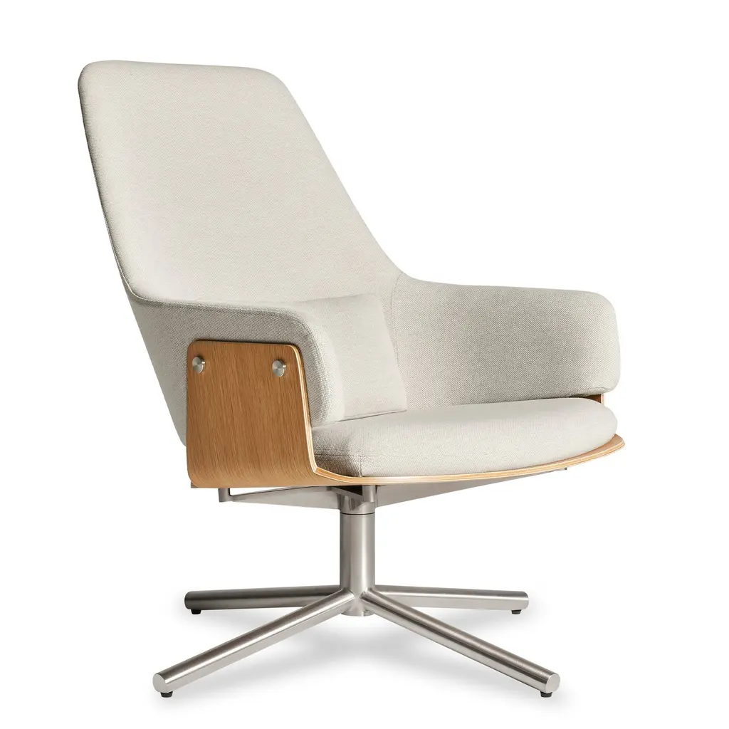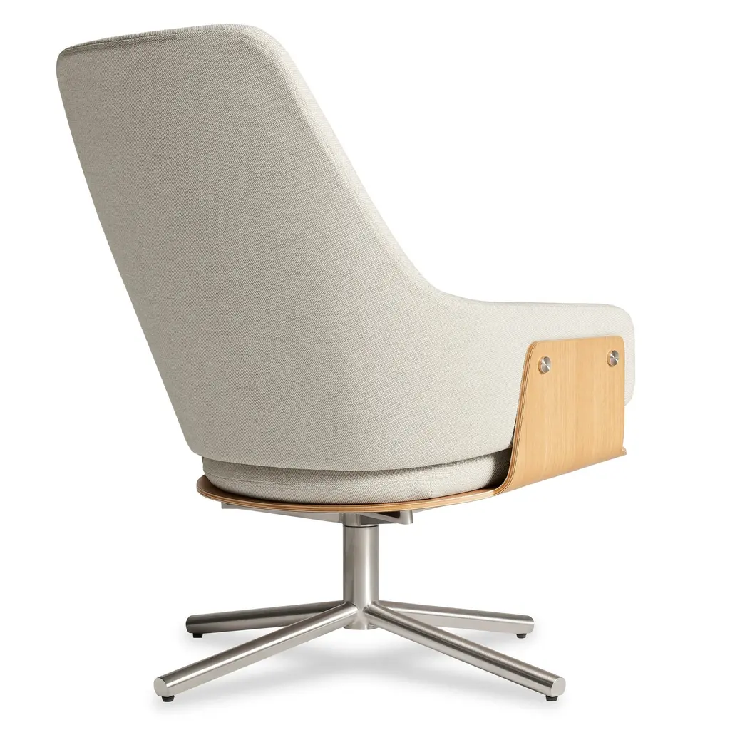 Interlocking plywood shapes conspire together to form a comfortable high back lounge with strong presence. The upholstered back and seat rest on a powder-coated steel swiveling base, while the tone on tone color scheme highlights the interplay of materials. Comfort lumbar pillow included.
