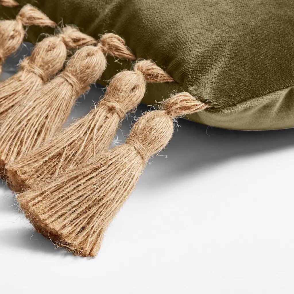 Designed by us and available only at One Kings Lane: Add a touch of texture to a favorite sofa or chair with this pillow, made of velvet with knife edges. Playful tassels accent two edges. Insert included. Zipper closure.
