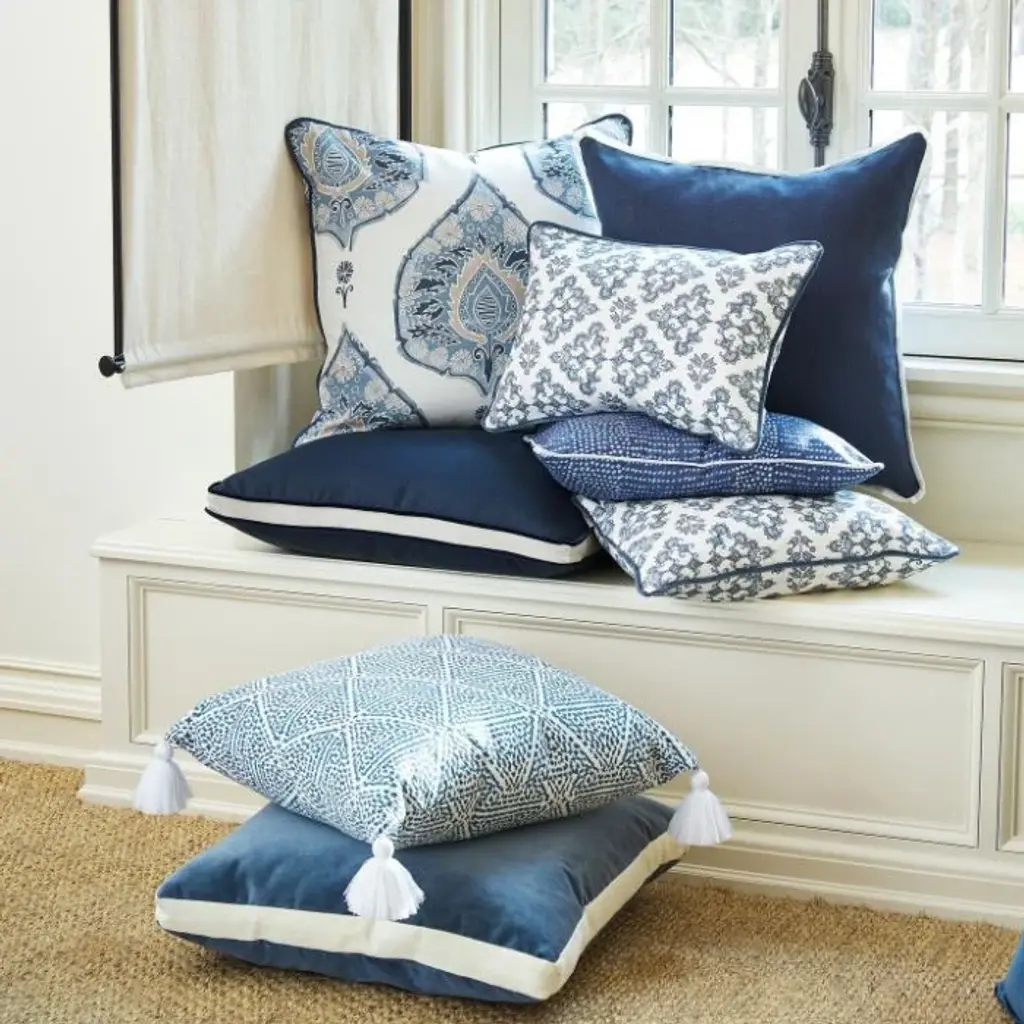 For a sophisticated Boho look, this blue leaf pattern accent pillow fits right in. Velvet piping defines the edge for clean finish. Play up the colors in this pillow with other elements for a soothing palette.