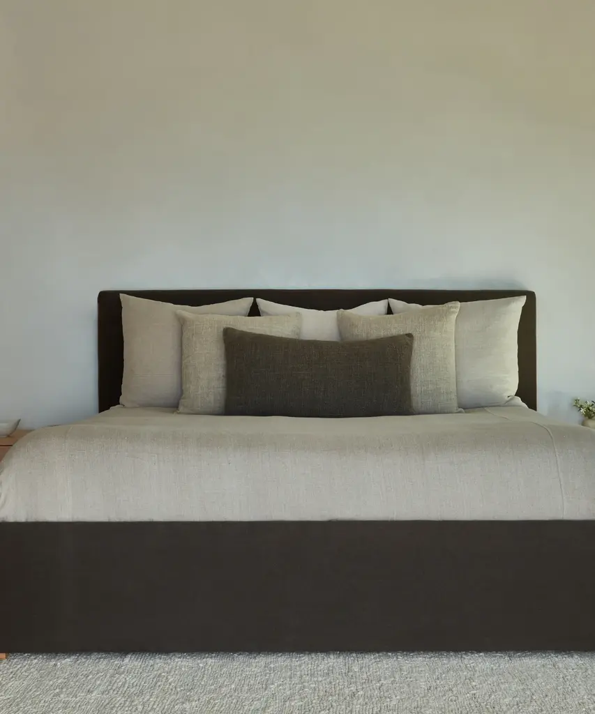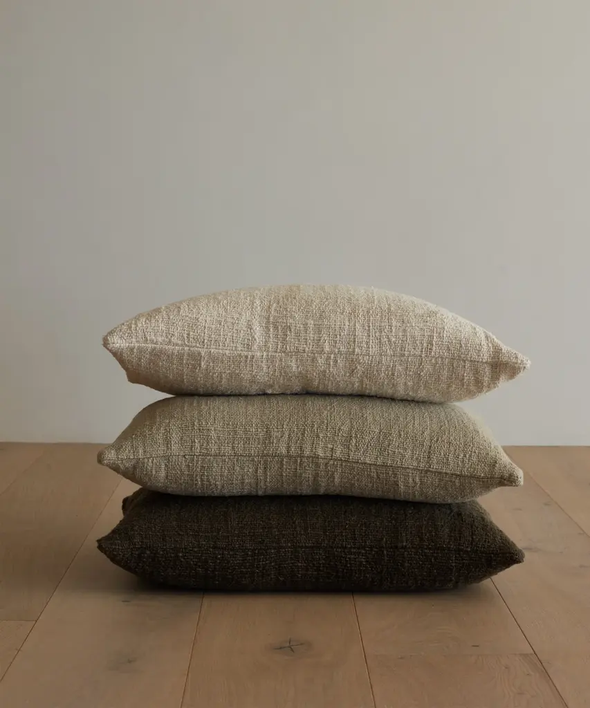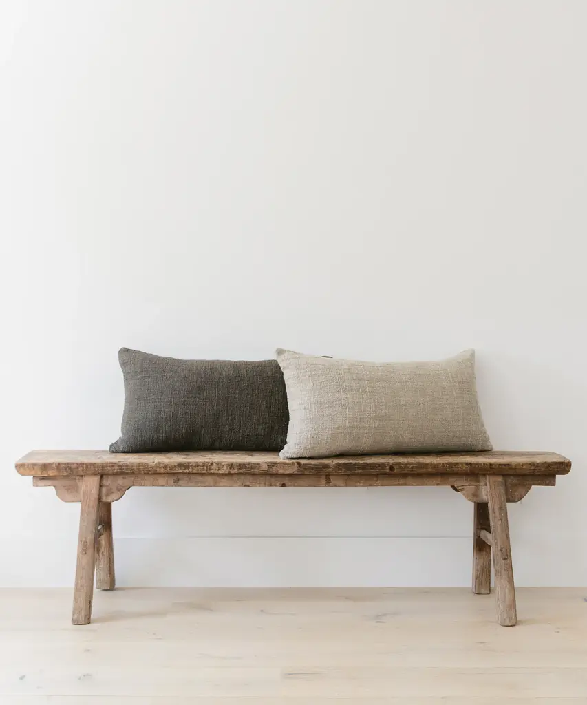 Luna Lumbar Pillow Ash This lumbar pillow is slightly larger than our typical staple, making it the perfect textured touch for chairs, twin beds, entryway benches, or layered atop cozy couches. Cover: 100% cotton. Handwoven in Indonesia. Not bleached or dyed. Variation in fabric is intrinsic to the handmade nature or quality of the fabric. Feather down insert included. Zipper closure on bottom.
