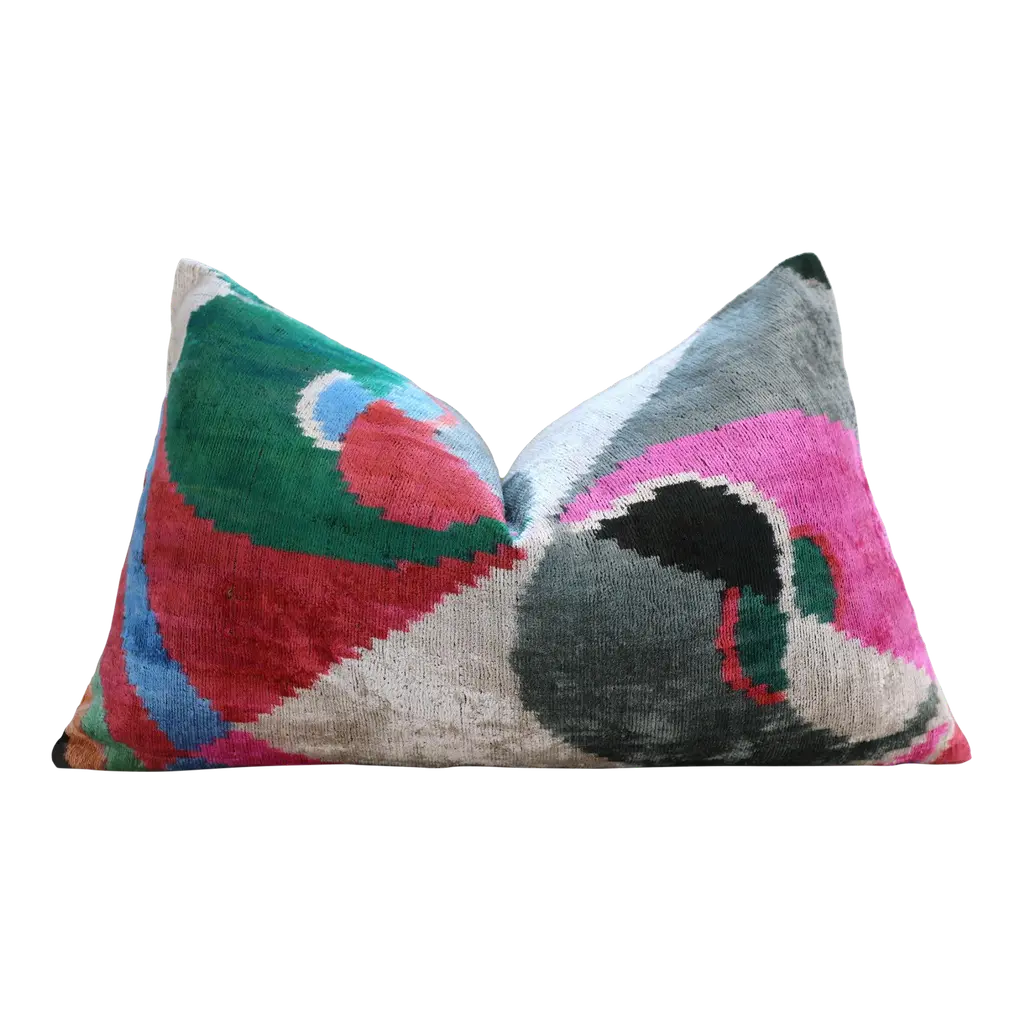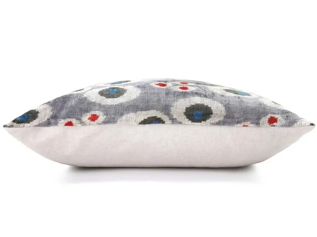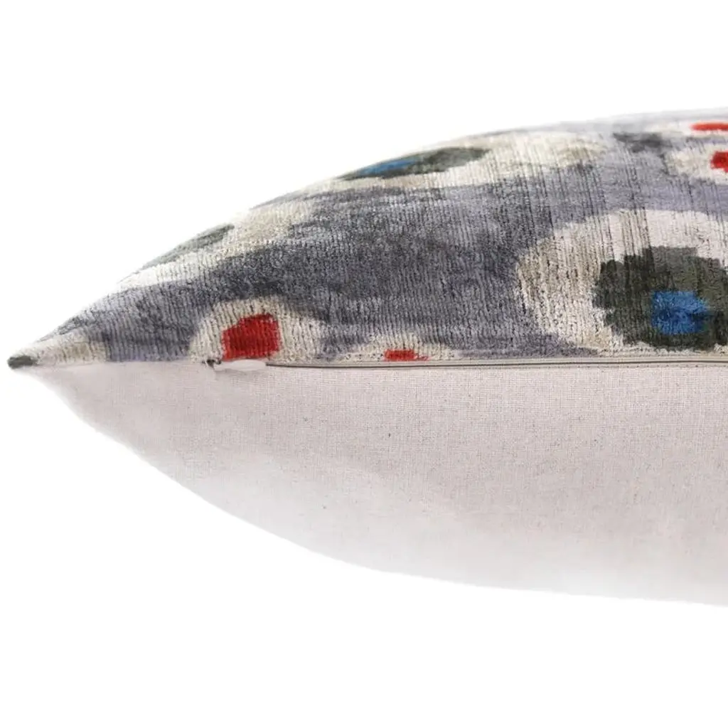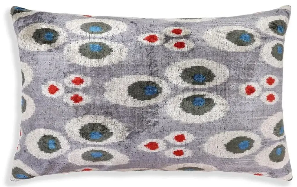 "Size: 16x24 inch lumbar pillow – ideal for layering on sofas, beds, and accent chairs Handwoven silk velvet with abstract circle patterns in gray, white, blue, and red Vegetable-dyed fabric sourced from Turkey & Uzbekistan Expertly sewn in our California atelier by skilled artisans Premium feather insert included for plush comfort and support A modern statement pillow for high-end interior design projects Distinctly handmade – unique, artisan-crafted, not mass-produced Full Description Introduce bold artistry to your interiors with this 16x24 luxury gray silk velvet pillow, featuring handwoven abstract circle motifs in white, slate gray, cobalt blue, and vibrant red. The contrast of colors creates a dynamic visual rhythm, balancing playful modernity with timeless craftsmanship. Crafted from vegetable-dyed silk velvet woven in Turkey and Uzbekistan, each pillow is meticulously sewn in our California atelier with attention to every detail. A premium feather insert ensures luxurious comfort, making this pillow as inviting as it is beautiful. Designer Insight This pillow is perfect for modern eclectic, mid-century, and artistic contemporary interiors. Its dynamic circular design pairs beautifully with solid-toned sofas in charcoal, ivory, or navy, while also complementing bolder rooms featuring colorful artwork or geometric accents. Use it as a focal point on a minimalist sofa or layer it among solids and textured pillows to create a designer-curated look."