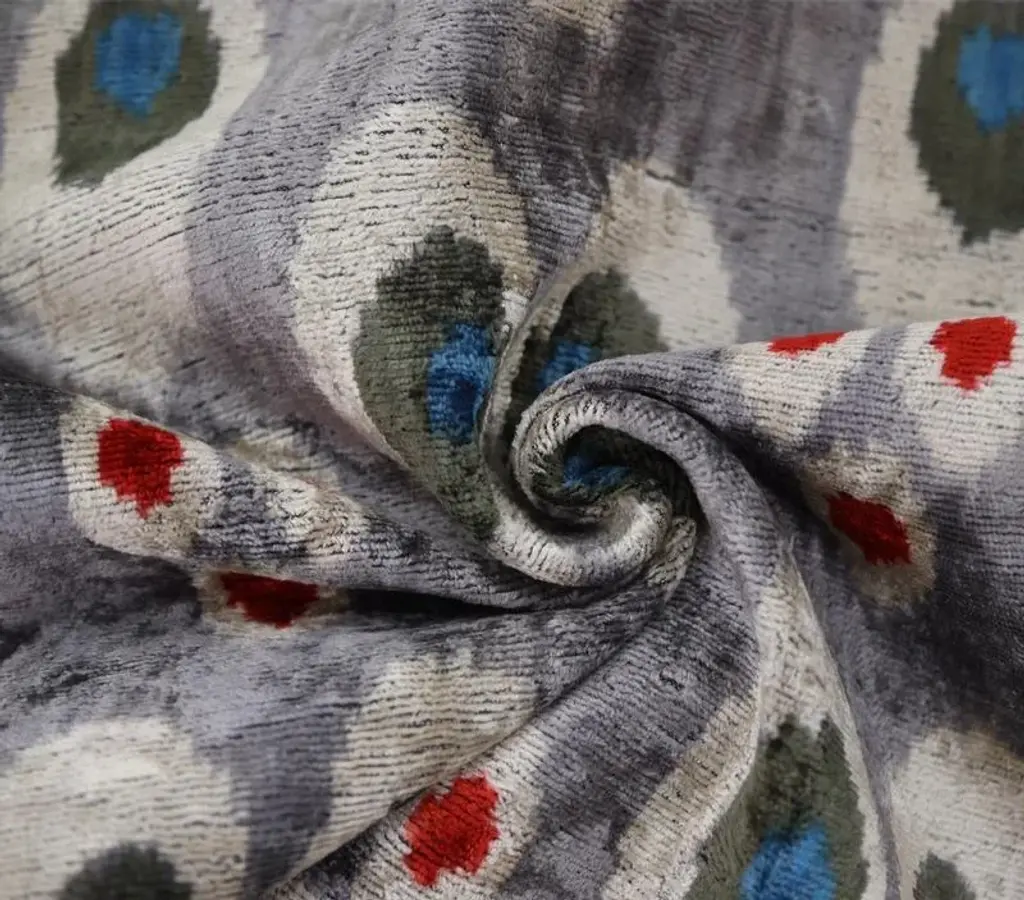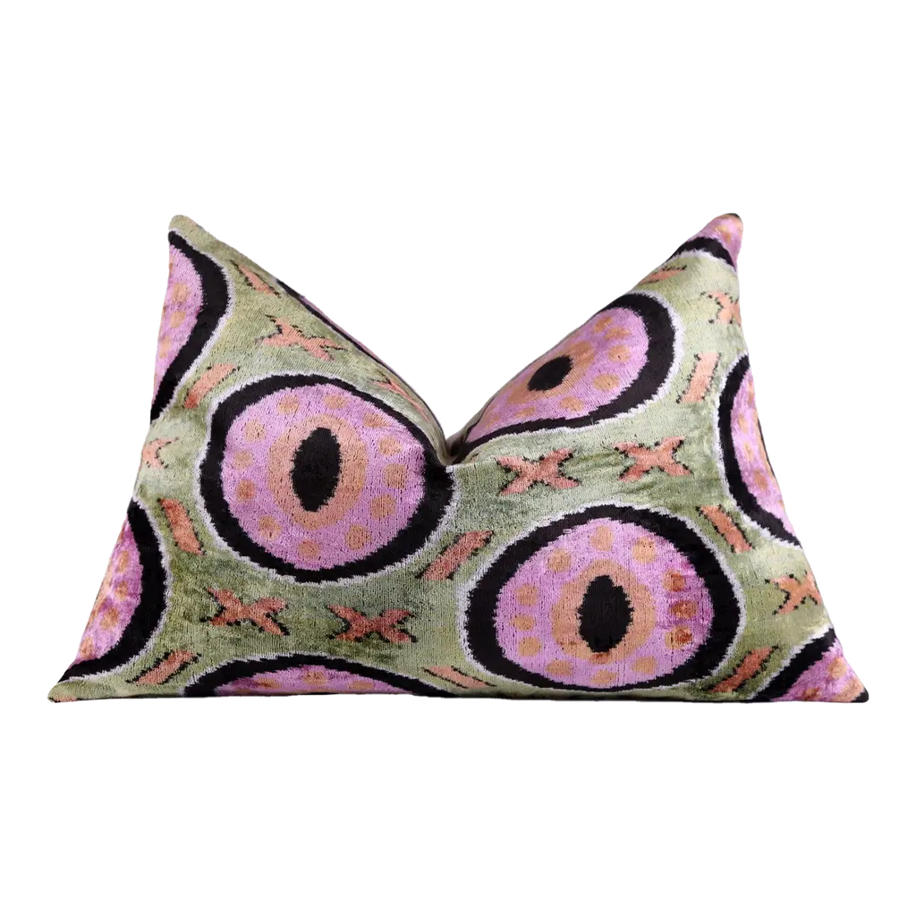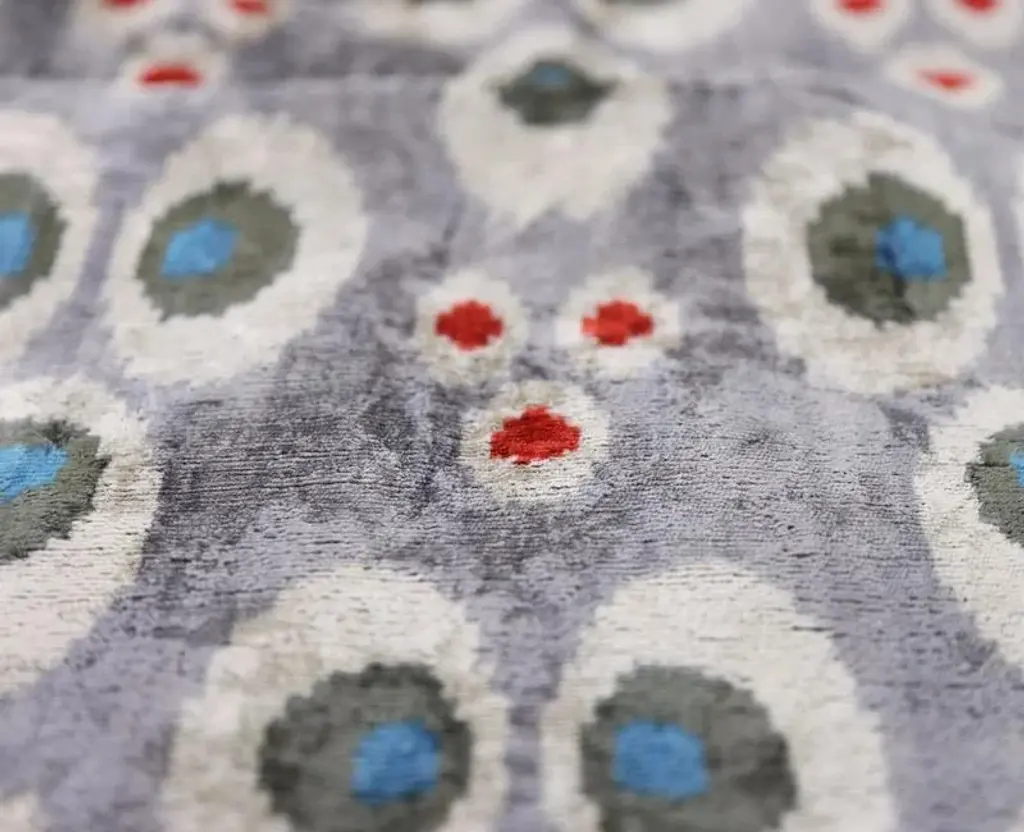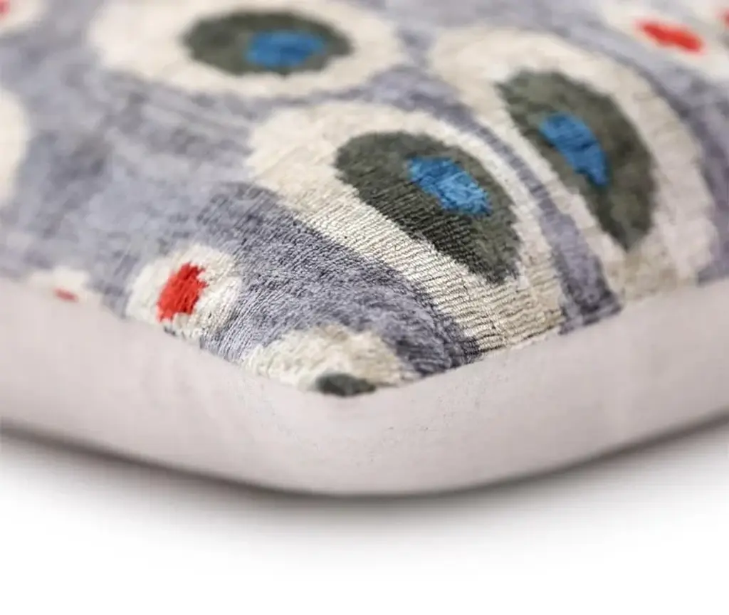 "Size: 16x24 inch lumbar pillow – ideal for layering on sofas, beds, and accent chairs Handwoven silk velvet with abstract circle patterns in gray, white, blue, and red Vegetable-dyed fabric sourced from Turkey & Uzbekistan Expertly sewn in our California atelier by skilled artisans Premium feather insert included for plush comfort and support A modern statement pillow for high-end interior design projects Distinctly handmade – unique, artisan-crafted, not mass-produced Full Description Introduce bold artistry to your interiors with this 16x24 luxury gray silk velvet pillow, featuring handwoven abstract circle motifs in white, slate gray, cobalt blue, and vibrant red. The contrast of colors creates a dynamic visual rhythm, balancing playful modernity with timeless craftsmanship. Crafted from vegetable-dyed silk velvet woven in Turkey and Uzbekistan, each pillow is meticulously sewn in our California atelier with attention to every detail. A premium feather insert ensures luxurious comfort, making this pillow as inviting as it is beautiful. Designer Insight This pillow is perfect for modern eclectic, mid-century, and artistic contemporary interiors. Its dynamic circular design pairs beautifully with solid-toned sofas in charcoal, ivory, or navy, while also complementing bolder rooms featuring colorful artwork or geometric accents. Use it as a focal point on a minimalist sofa or layer it among solids and textured pillows to create a designer-curated look."