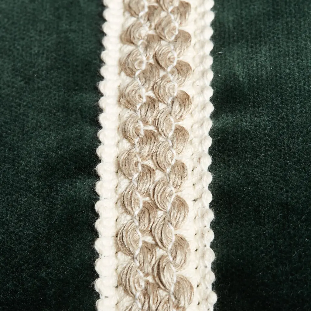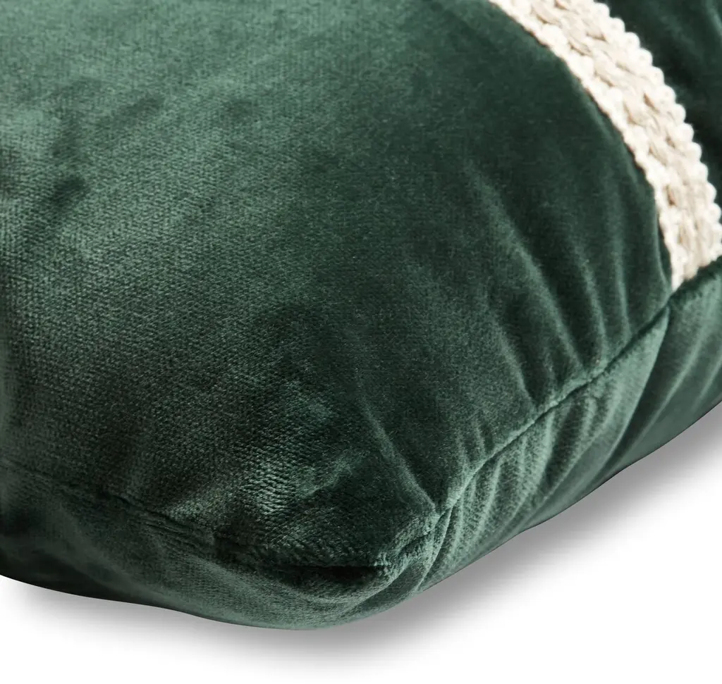 Designed by us and available only at One Kings Lane: A sophisticated accent for the sofa, this plush lumbar pillow is made of forest-green velvet with wonderfully textural natural-and-white trim. Insert included. Zipper closure.