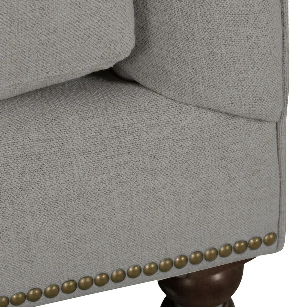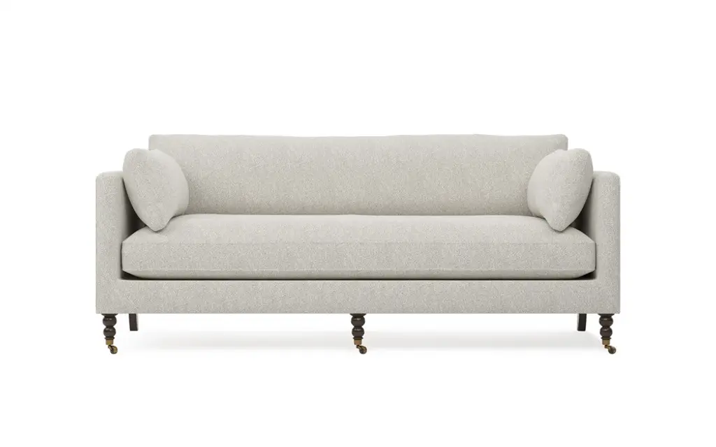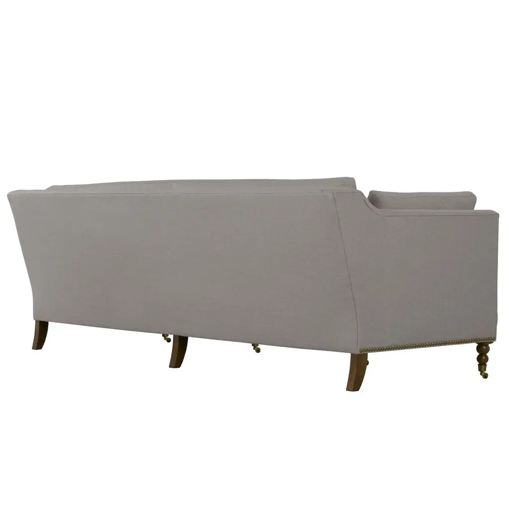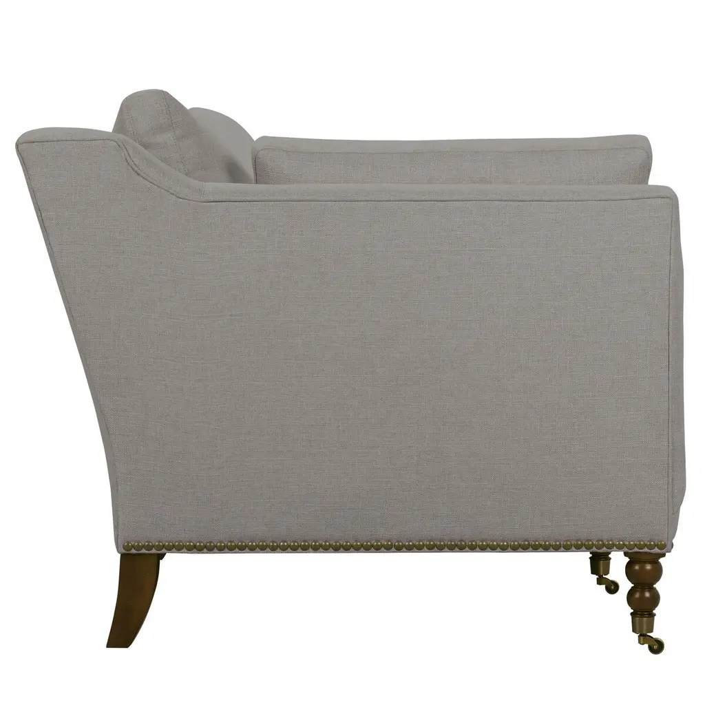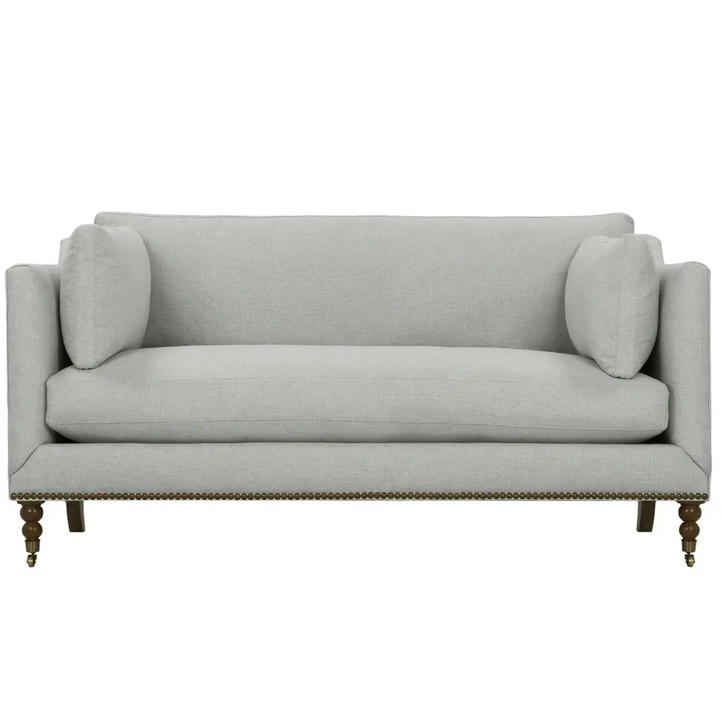 Exclusive to One Kings Lane: With its generous 90" length, linen-blend upholstery, boxy track arms, brass nail-head trim, and elegantly turned front legs, the Margot 90" Linen-Blend Sofa offers a perfect blend of timeless style and comfort. Its feather-and-down cushioning ensures long-lasting support, making it an inviting centerpiece for larger living spaces. Also of note:• Brass casters on the front legs complement the nail-head detailing, allowing the sofa to be moved easily without scratching your floors.• Frame: made from solid kiln-dried hardwood to ensure durability and longevity.• Cushion Fill: cloud cushion with a high-resiliency foam core wrapped in a super soft foam layer, inserted into a channel-quilted casing filled with 50% fiber, 5% down, and 45% feather.• Seat Construction: sinuous-springs system with heavy-gauge steel springs placed 4” - 5” apart for uniform comfort and doubled at each end for extra durability in daily use.• Seat Comfort: plush yet supportive, requiring regular fluffing and rotating to maintain the cushions' shape.• Comes with two lumbar pillows.