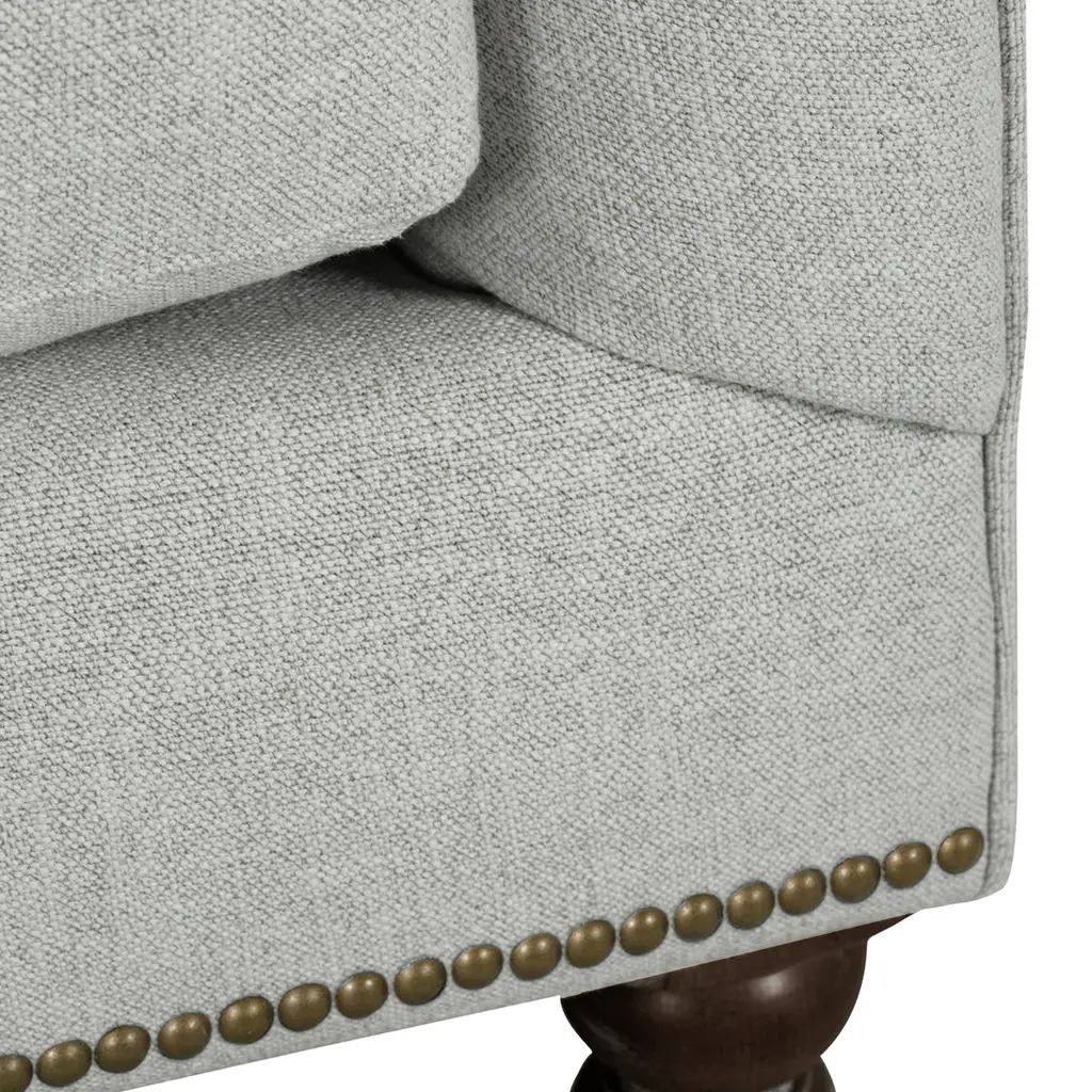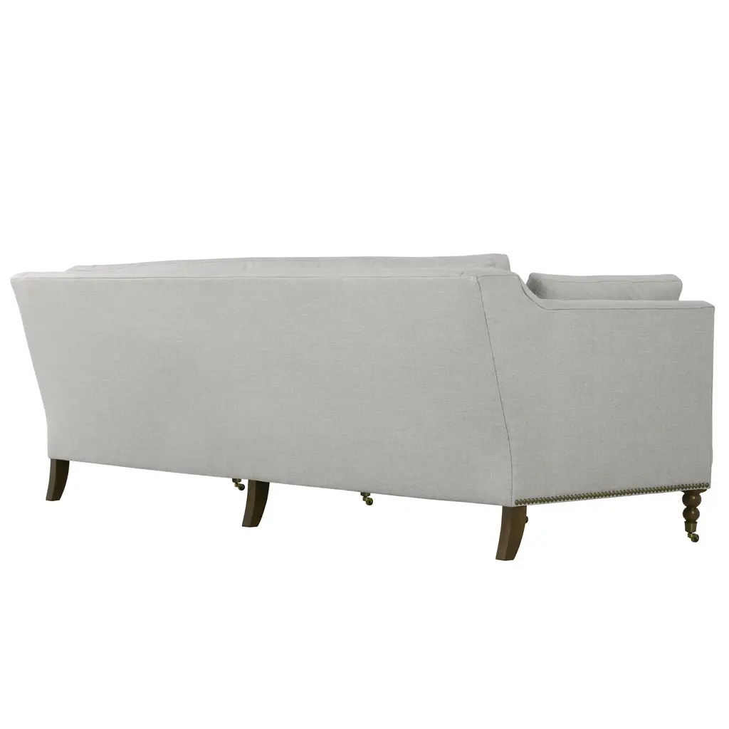 Exclusive to One Kings Lane: With its generous 90" length, linen-blend upholstery, boxy track arms, brass nail-head trim, and elegantly turned front legs, the Margot 90" Linen-Blend Sofa offers a perfect blend of timeless style and comfort. Its feather-and-down cushioning ensures long-lasting support, making it an inviting centerpiece for larger living spaces. Also of note:• Brass casters on the front legs complement the nail-head detailing, allowing the sofa to be moved easily without scratching your floors.• Frame: made from solid kiln-dried hardwood to ensure durability and longevity.• Cushion Fill: cloud cushion with a high-resiliency foam core wrapped in a super soft foam layer, inserted into a channel-quilted casing filled with 50% fiber, 5% down, and 45% feather.• Seat Construction: sinuous-springs system with heavy-gauge steel springs placed 4” - 5” apart for uniform comfort and doubled at each end for extra durability in daily use.• Seat Comfort: plush yet supportive, requiring regular fluffing and rotating to maintain the cushions' shape.• Comes with two lumbar pillows.