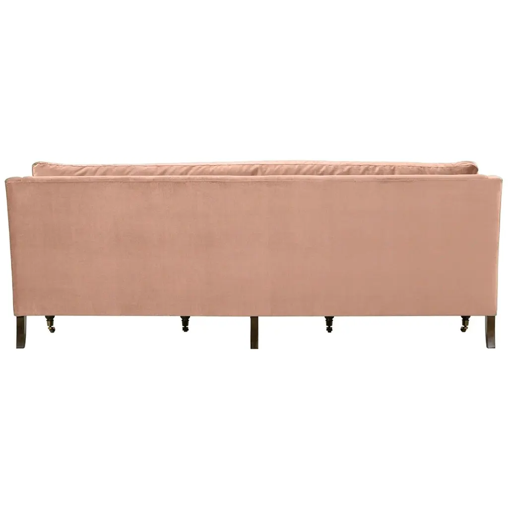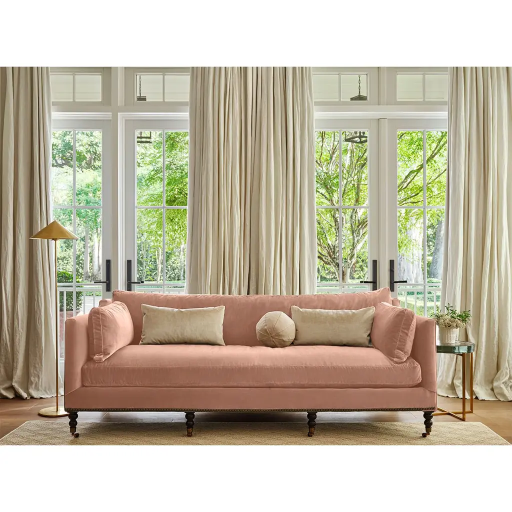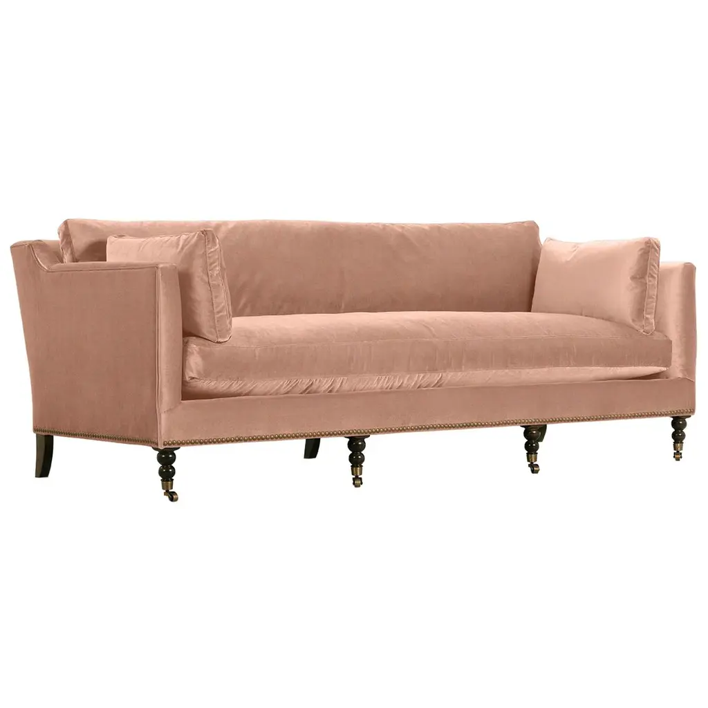 Exclusive to One Kings Lane: From its plush luxe velvet upholstery, boxy track arms to its turned front legs, this sofa is the ultimate in timeless elegance and sophistication. And thanks to its ample feather-and-down cushioning, it welcomes guests with long-lasting comfort and support.Also of note:• Brass casters on the front legs make the sofa easy to move without scratching your floors.• Frame: made of solid kiln-dried hardwood to withstand years of use.• Cushion Fill: cloud cushion features a high-resiliency foam core wrapped with a super soft foam layer then inserted into a channel-quilted casing filled with a blend of 50% fiber, 5% down, and 45% feather.• Seat Construction: Sinuous-springs system. Heavy-gauge steel springs are placed 4-5" apart for uniform comfort and doubled up on each end to withstand the wear and tear from everyday use.• Seat Comfort: The seat is plush yet supportive, cushions require regular fluffing and rotating to maintain their shape.• Comes with two lumbar pillows.