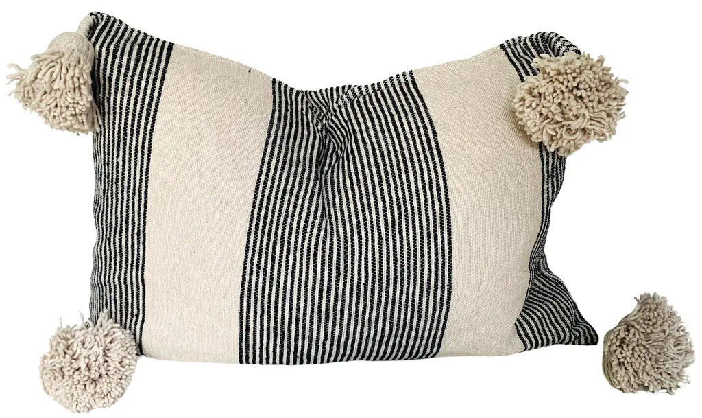 Moroccan handloomed cotton pom-pom lumbar pillow with zipper closure. New duck feather-and-down fill inserts. Pattern on front is same as back. Due to hand-made nature of each piece, each pillow can vary slightly. Pillow measures 23" x 17" with the tassels measuring an additional 7" to each side. Some loose strings, original to piece.