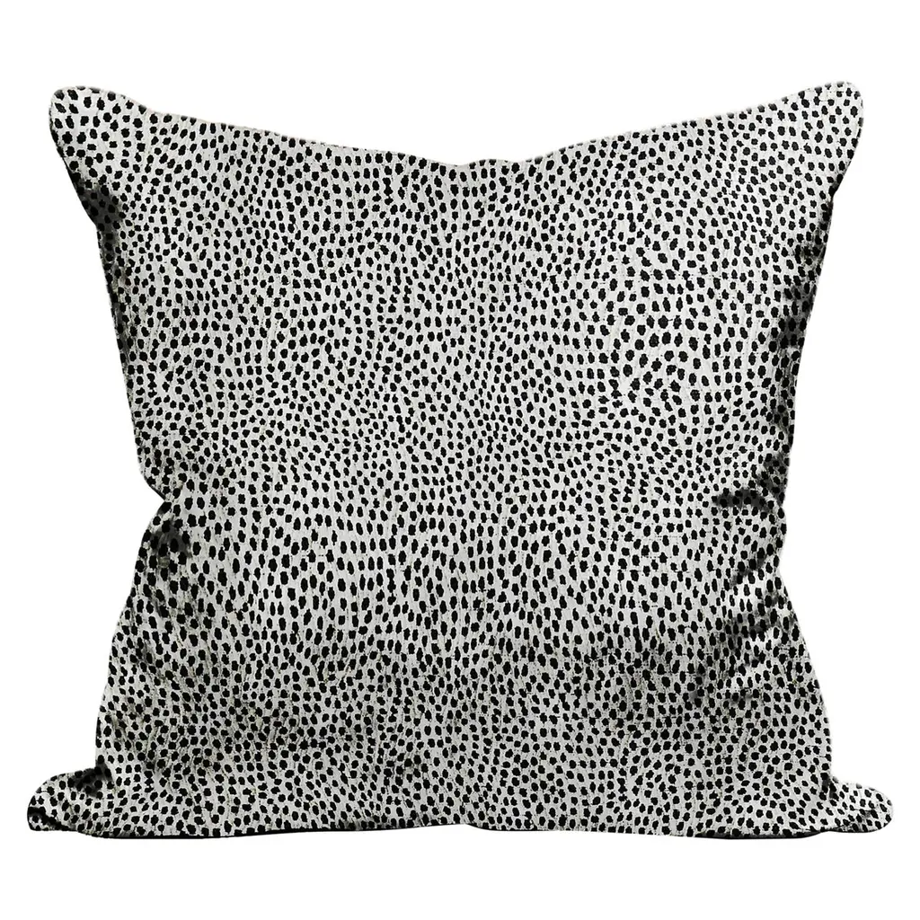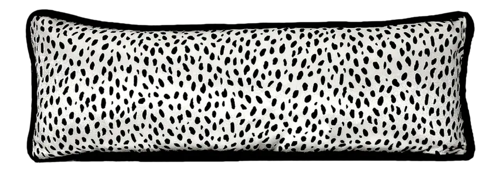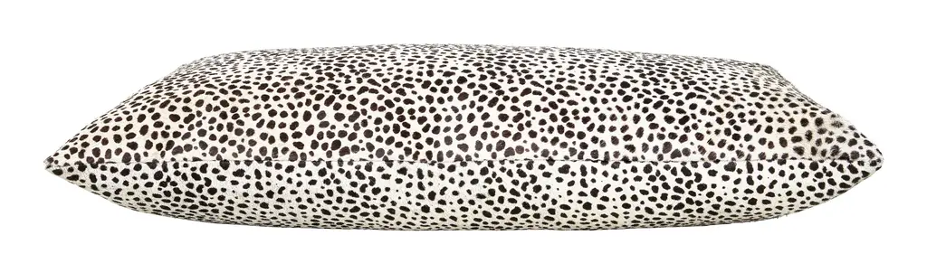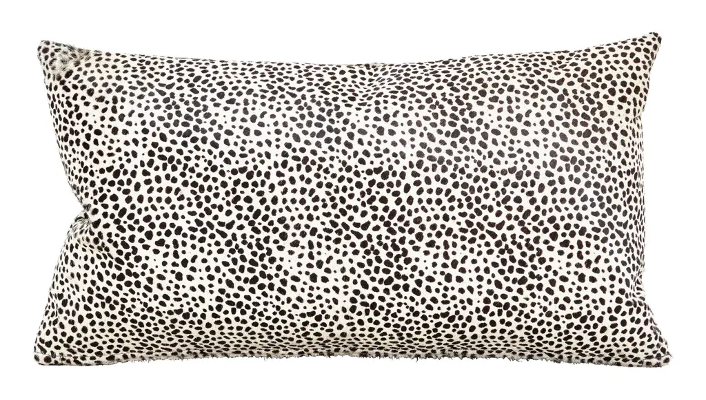 Take a walk on the wild side with our chic Nairobi Pillow. A fresh spin on classic animal prints, this lumbar pillow is crafted from white cowhide stenciled with small, organically-shaped black spots. We’ve finished it with a hidden zipper closure and a soft down and feather pillow insert for a plush feel. The perfect finishing touch for any sophisticated, modern space, we love Nairobi on a solid-colored sofa or bed or mixed in with other layers on the bed for a charming pop of pattern. •stenciled cowhide•hidden zipper closure•down and feather insert Dimensions •11.5" x 22"