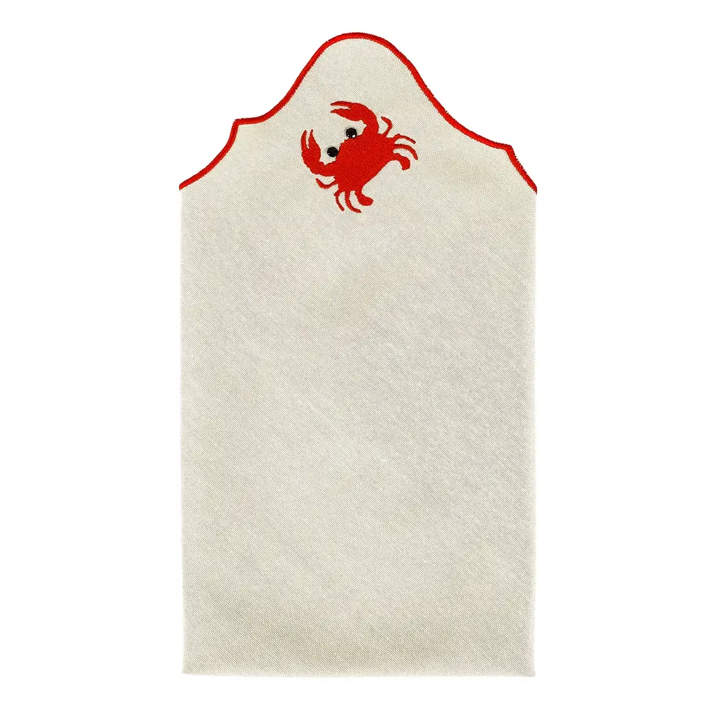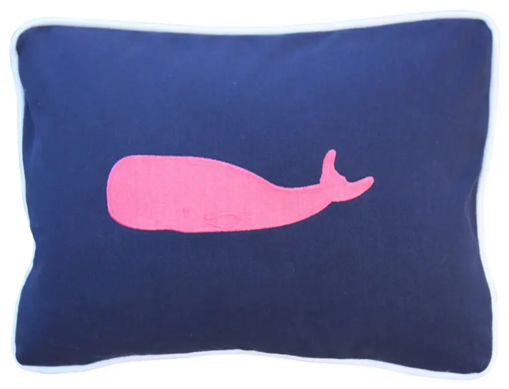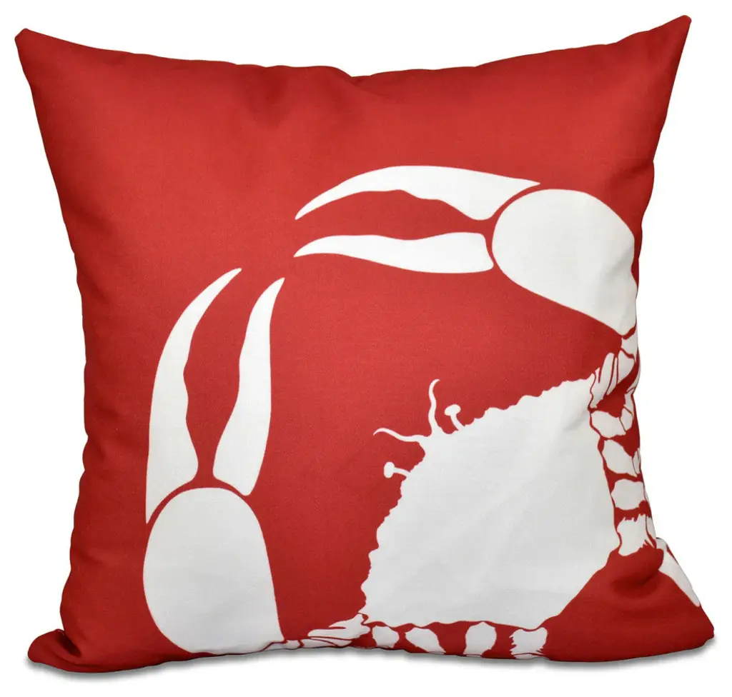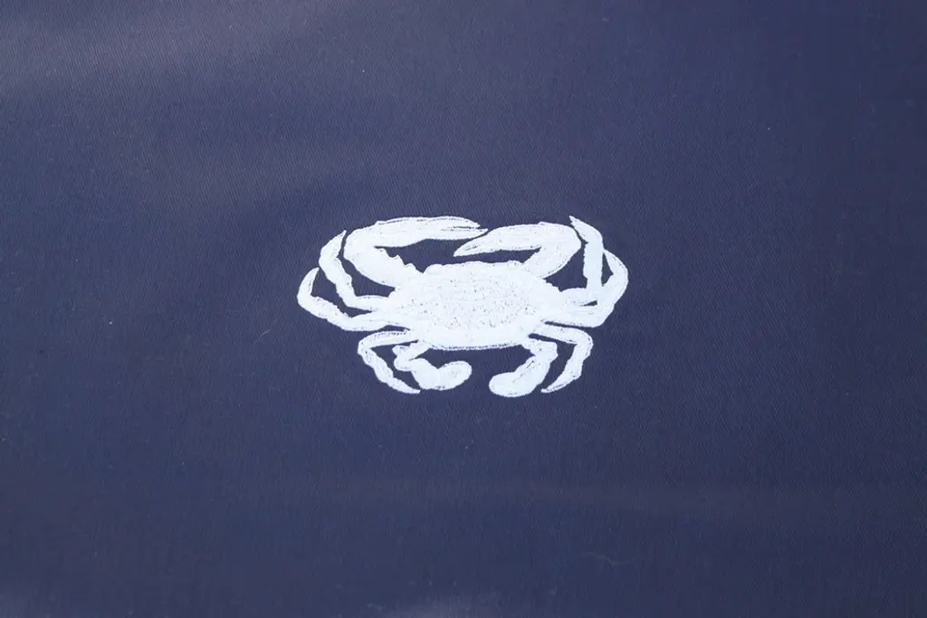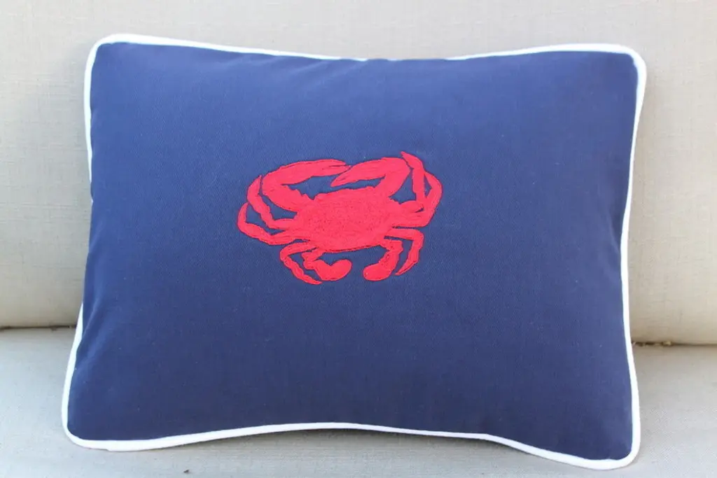 The Navy Twill Lumbar Pillow provides a great pop of color with embroidered crab.