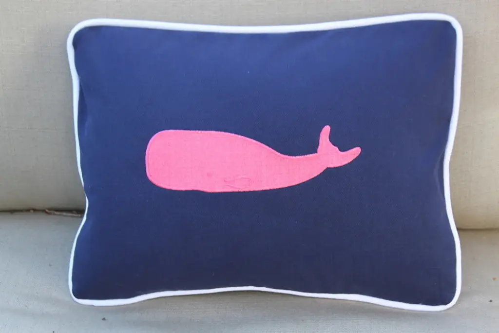 The Navy Twill Lumbar Pillow provides a great pop of color with Embroidered Whale• Refer to second image for whale design color.