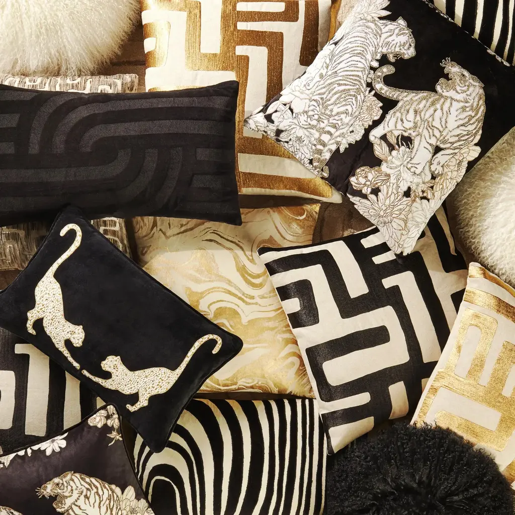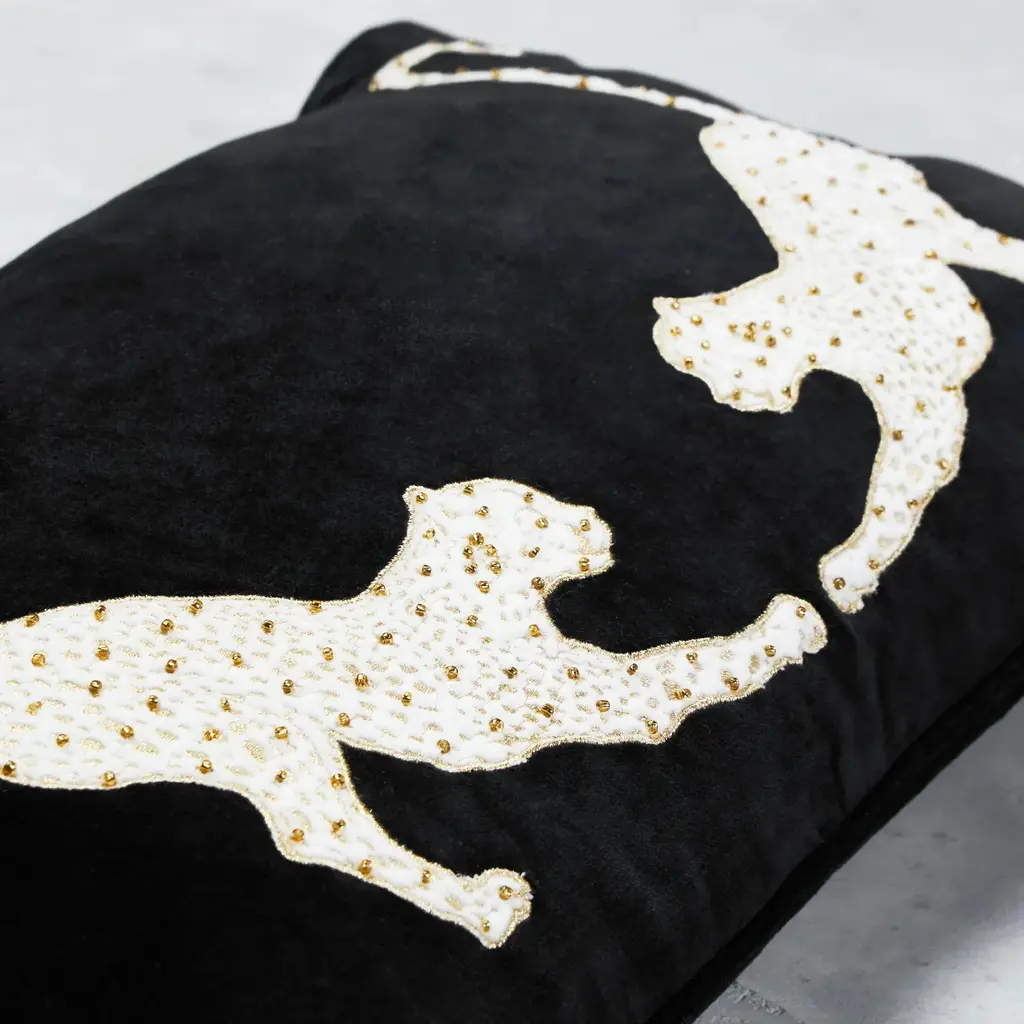 The Nikki Chu Agu Pillow is a playful addition to your space. Featuring front and back piping, the 14" x 22" throw pillow depicts two ivory cheetahs on a black velvet background. Removable insert is included.
