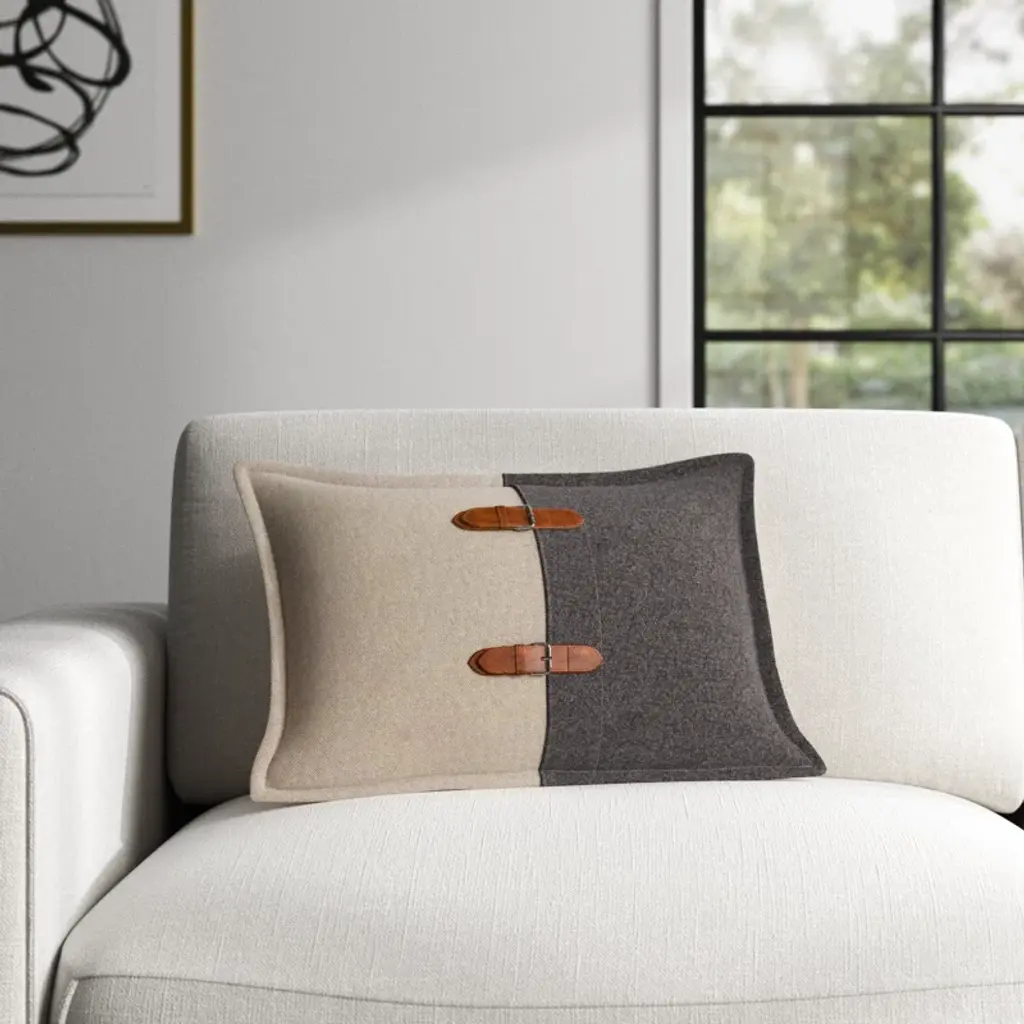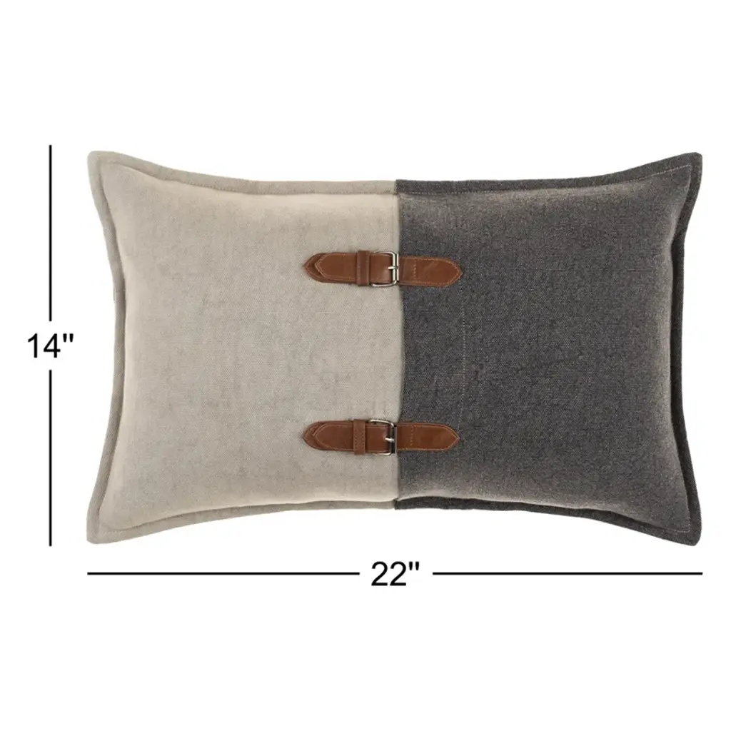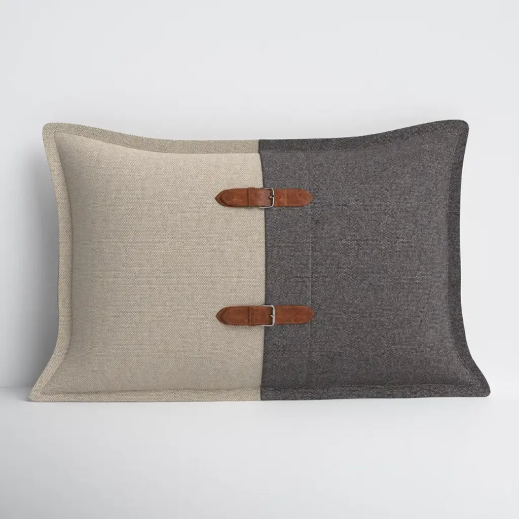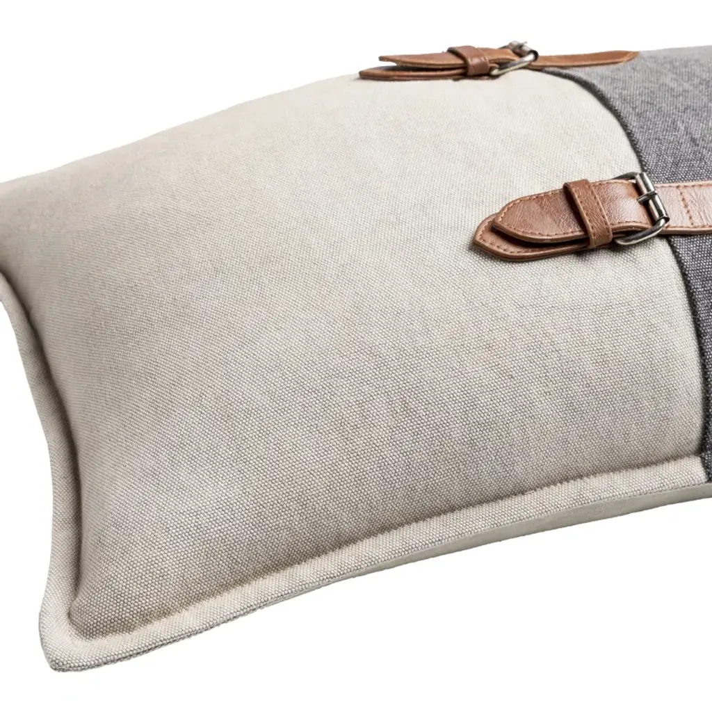 This lumbar pillow combines elegant neutral hues and a mix of materials for an earthy, organic look you'll love to show off. The cover is made from a cotton blend with two contrasting sides of taupe and charcoal accented with a leather belt buckle closure. The textured, tweed-like look of the cotton adds even more visual interest, while the knife edges add a sophisticated touch. This pillow comes with your choice of insert, so you can customize how soft or firm it is. Upkeep is easy: Simply remove the insert with the zipper closure and spot-clean the cover.