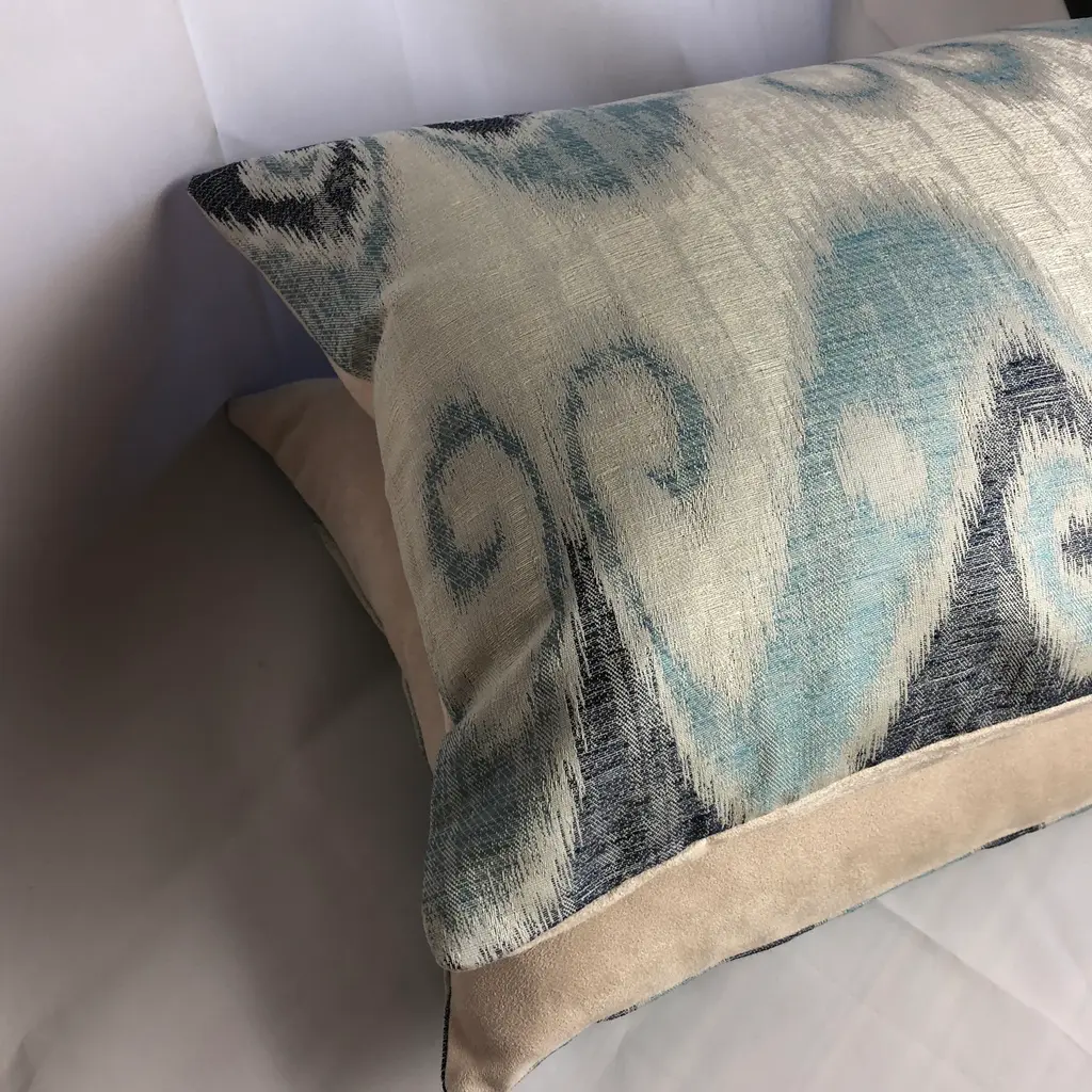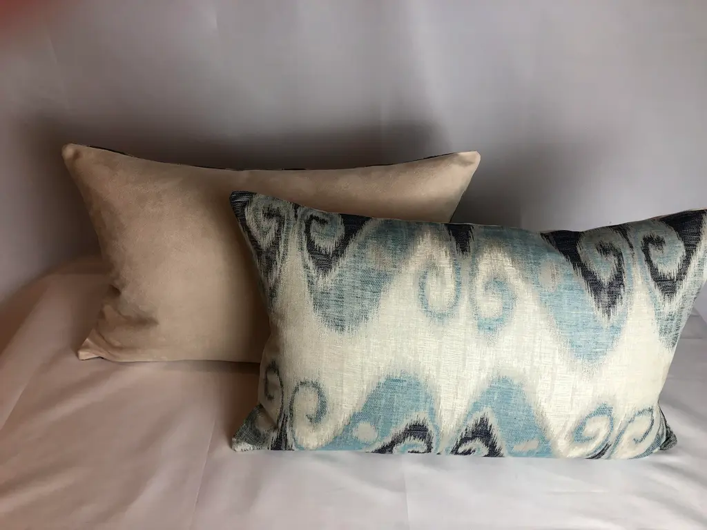 Blues and Natural Linen color Ikat. Modern or chic beachy ocean styles would blend perfectly with this custom pillow. Backed in coordinating ultra suede with hidden zipper.