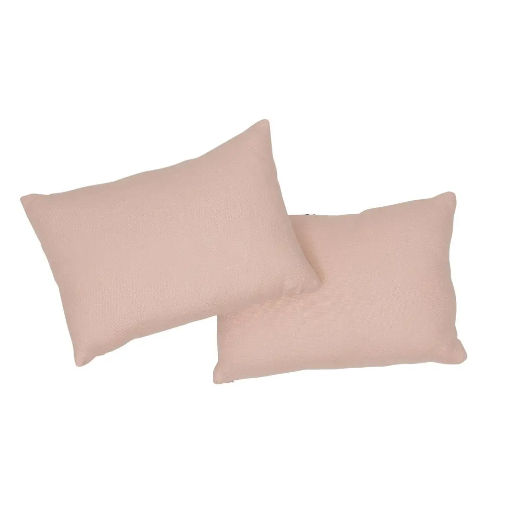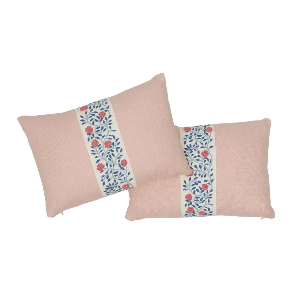The face of this 11" x 16" pillow features Ashoka Tape in Rose and Sky paired with Piet Performance Linen in Rose Quartz. With a winding, embroidered floral design accentuated with French Knots, Ashoka Tape adds an element of handcrafted beauty. Feather/down insert included; knife-edge finish, hidden zipper closure. 56% polyester. 44% linen. Dry clean. Made in India. If out of stock, lead-time is 15-20 business days approximately.Since Schumacher was founded in 1889, our family-owned company has been synonymous with style, taste, and innovation. A passion for luxury and an unwavering commitment to beauty are woven into everything we do. Pillows and accessories Product detail Pattern name: Ashoka Tape and Piet Performance Linen Color: Rose Quartz Hidden zipper closure Knife edge finish Feather/down fill insert included Content: 56% polyester 44% linen Performance: Martindale 28,000 Pillow measures 11" x 16".