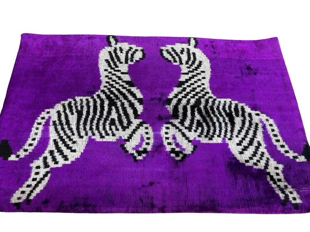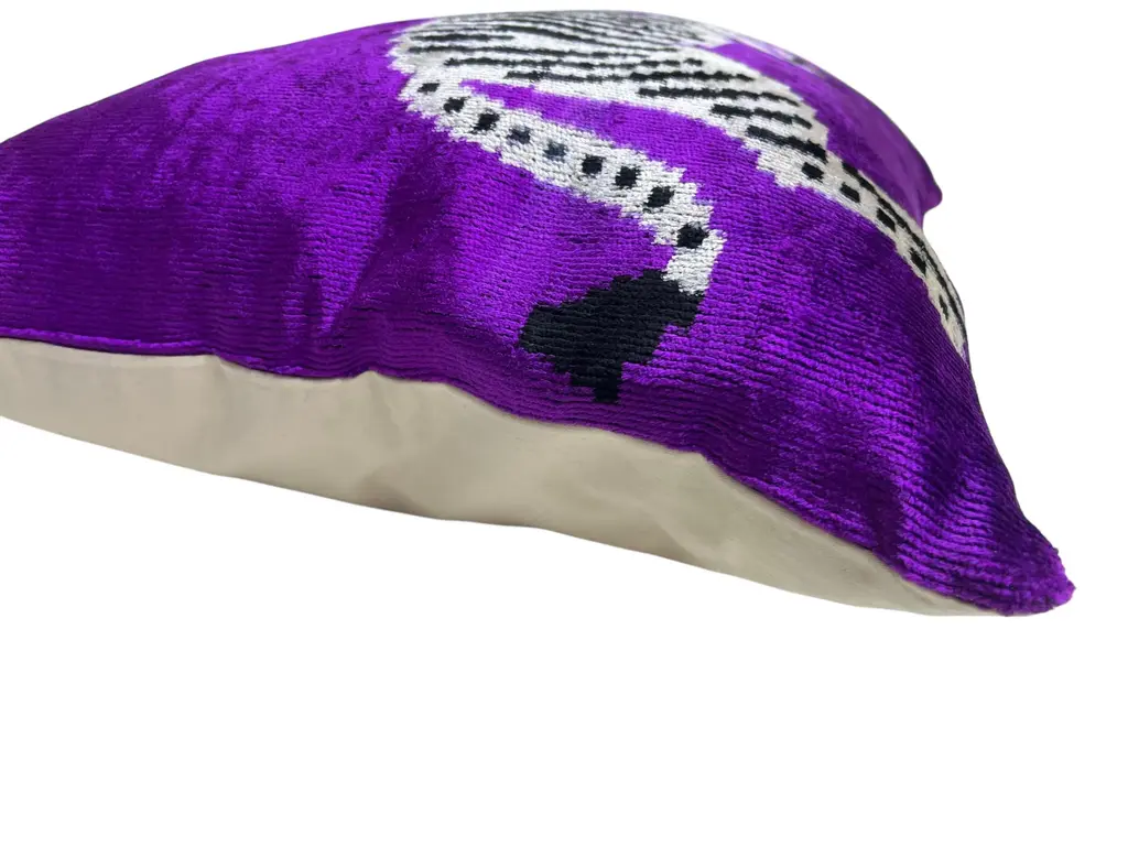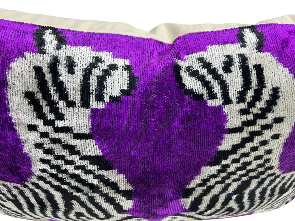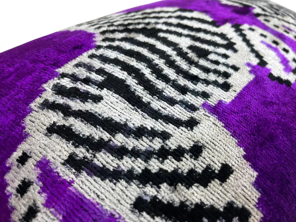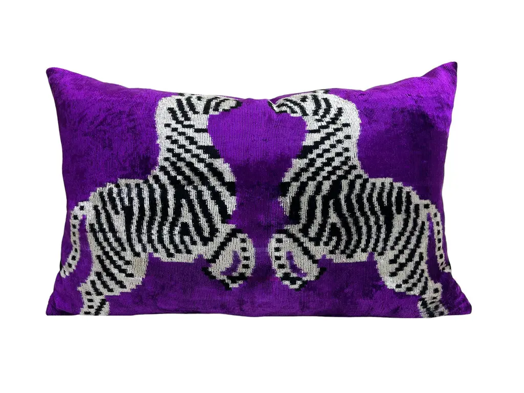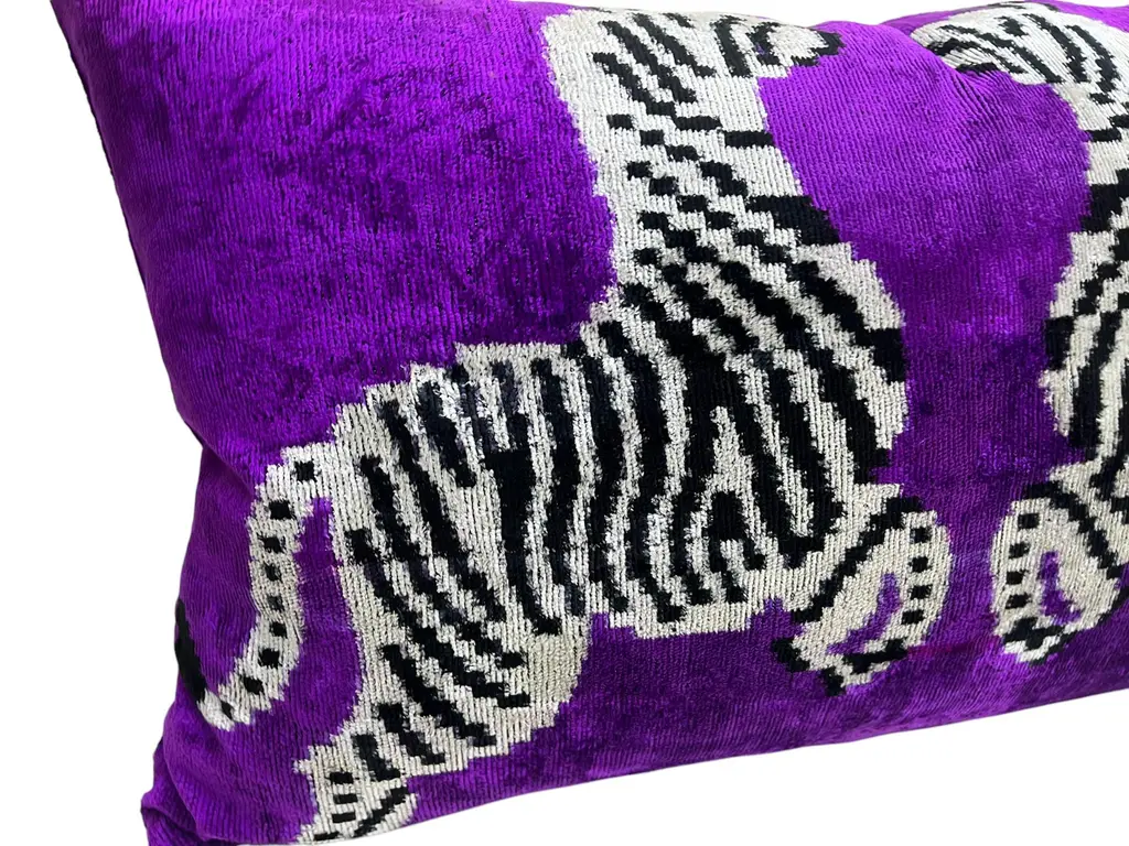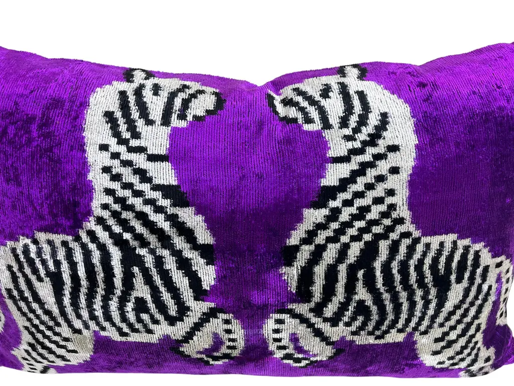 Handmade Velvet Silk IKAT cushion cover with zebra design and shiny colors. It can be a perfect gift for animal lovers. This pillow case features a luxurious silk velvet fabric with an ikat pattern, adding a touch of elegance and sophistication to any space. The unique weaving technique of ikat creates a striking, artistic design, while the softness of the silk velvet ensures both comfort and visual appeal. Perfect for accenting your living room, bedroom, or any area in need of a stylish, refined statement piece. 16" 24" Inc / (40x60cm) Care: Dry Cleaning Cushion insert is not included