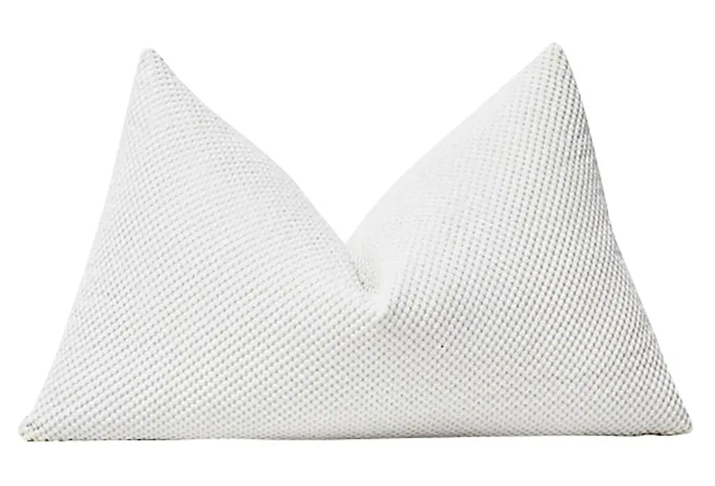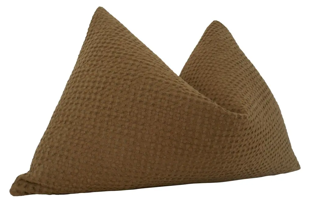 Exclusive to One Kings Lane: With rich brown woven fabric on the front, this lumbar pillow brings irresistible texture and subtle pattern to a room. Cut and sewn by hand in California, the pillow includes a plushly filled Ultra-Plump feather-and-down insert, with an invisible zipper closure. Solid white, premium luxe 100% linen reverse side.