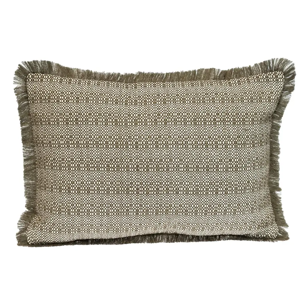 Add a touch of classic charm to your space with the transitional striped green pillow. Featuring a soft woven texture in a soothing green hue with neutral beige stripes, this lumbar pillow blends effortlessly with any decor. The delicate fringe trim adds extra character, making it a stylish yet cozy accent for sofas, beds, or chairs. The removable cover with a secure zipper closure ensures easy cleaning. Product Features: Green and beige rectangular throw pillow Showcases a textured stripe pattern Accented with fringed edges Design is on one side only Removable cover with zipper closure for easy cleaning Care instructions: spot clean only Recommended for indoor use Dimensions: 14"H x 20"W x 7"D Material(s): Shell: cotton Filling: polyester