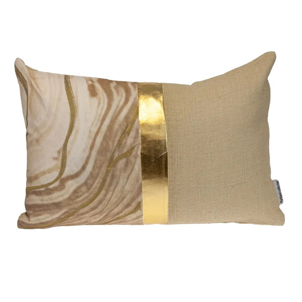 Elevate your space with this stunning lumbar throw pillow, featuring rich, luxurious marbleized patterns with shimmering metallic details. Designed to bring warmth and sophistication, its intricate design and vibrant hues create a striking accent in any room. Whether placed on a sofa, bed, or chair, this elegant pillow adds texture and charm, effortlessly blending modern style with timeless appeal for a cozy yet refined atmosphere. Product Features: Beige and gold rectangular lumbar pillow Marbleized pattern design Design is on one side only For indoor use only Care instructions: spot clean only Dimensions: 14"H x 20"W x 7"D Material(s): Shell: cotton Filling: polyester