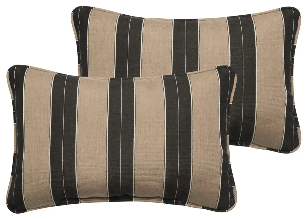 Make outdoor entertaining more pleasurable for family and guests with this set of two outdoor lumbar pillows. Offering ergonomic support as well as a splash of fresh style, each pillow delivers a beautiful palette with a striking base and contrasting edge cording that accentuates its profile. Durable UV and fade resistant fabric goes the distance for challenging outdoor elements and maintains its structural integrity as well as its tasteful aesthetics. Each pillow in this set of two outdoor lumbar pillows is filled with pure recycled fiber and sewn closed.