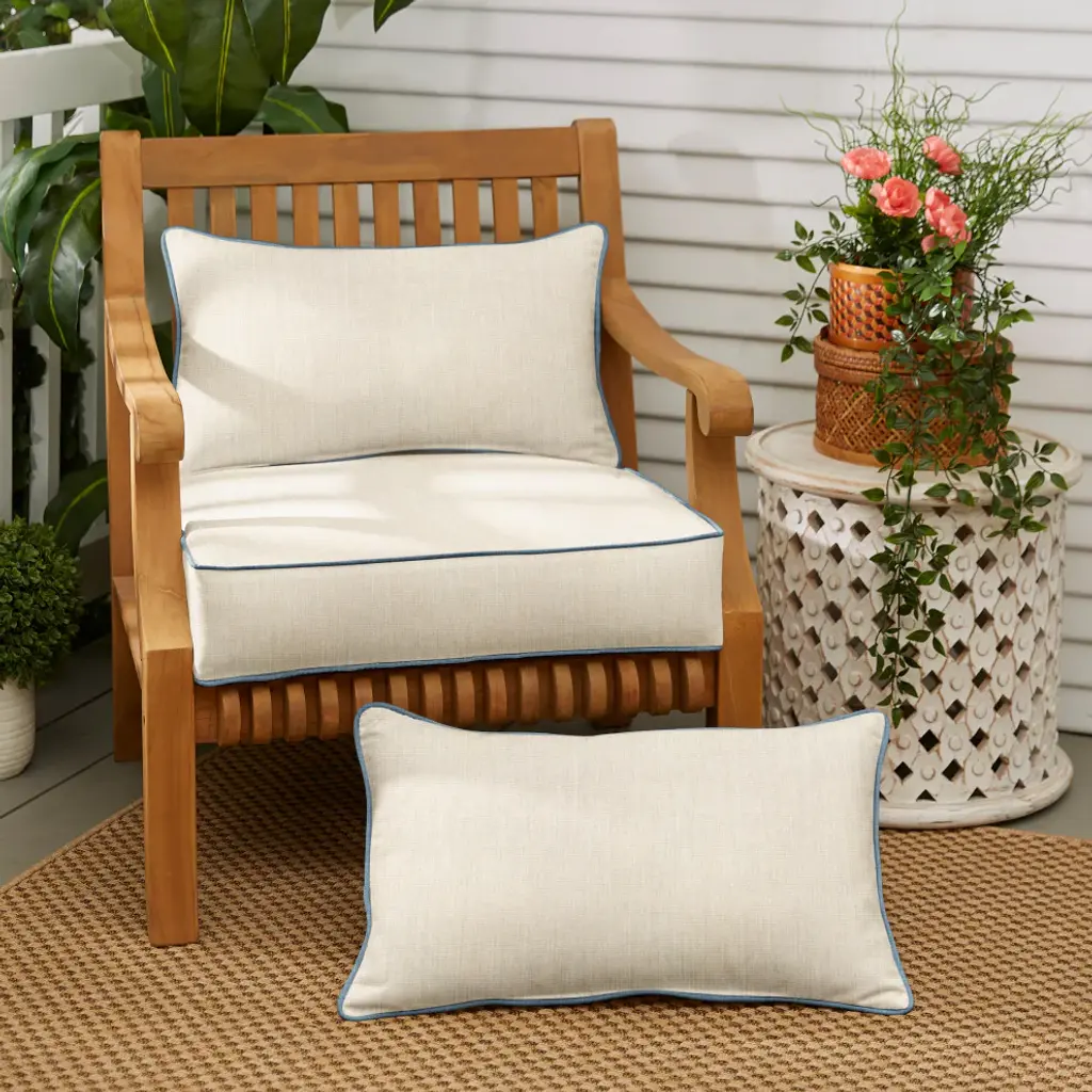 Add character to any lounge area with this set of two outdoor lumbar pillows. Featuring contrasting cording trim, these pillows boast decorative design to accent any setting. With 100% recycled fiber fillings, these pillows are soft and supple to ensure comfort and support for seasons to come. The UV and fade resistant exteriors maintain an eye-catching design outdoors, and will also protect against water damage and mildew growth.