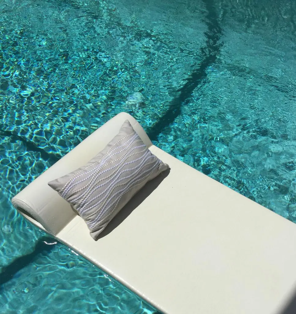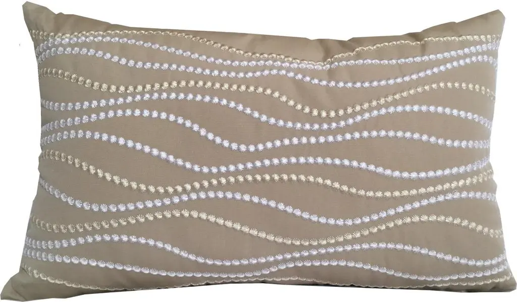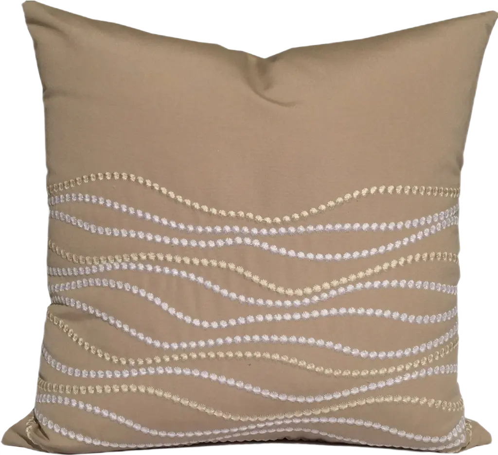 This lumbar pillow has been tailored with a finely ribbed sand colored fabric to bring out the intricate embroidery . This contemporary wave pattern has been specially designed by Sohil and made exclusively for the deisgner by the well know italian company Mastro Raphael. Even if this decorative pillow would be a nice addition to any interior, it is made and embroidered with solution dyed synthetic fibers and therefore is suitable also for outdoors. Signed by Maker,Signed by Maker